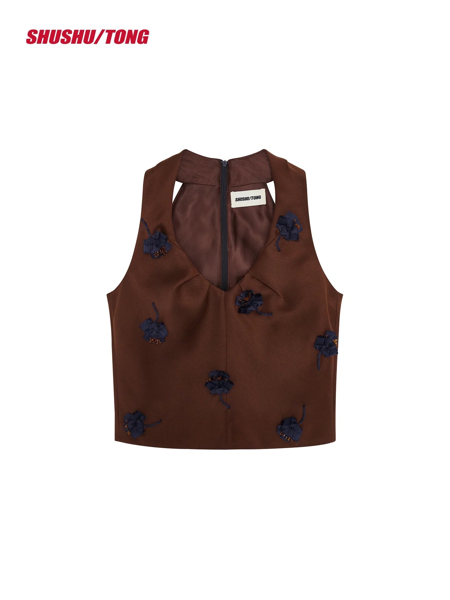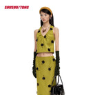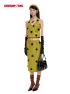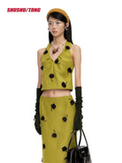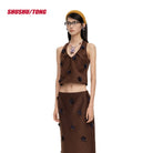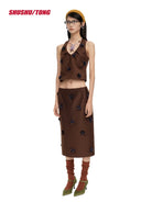 This chic winter ensemble features a women's sleeveless halter crop top paired with a matching high-waisted midi skirt. Crafted in a rich chocolate brown tone, the set is detailed with textured black floral embellishments, adding depth and sophistication to the look. Perfect for casual commuters or fashion-forward winter outings, the set balances elegance with modern flair.