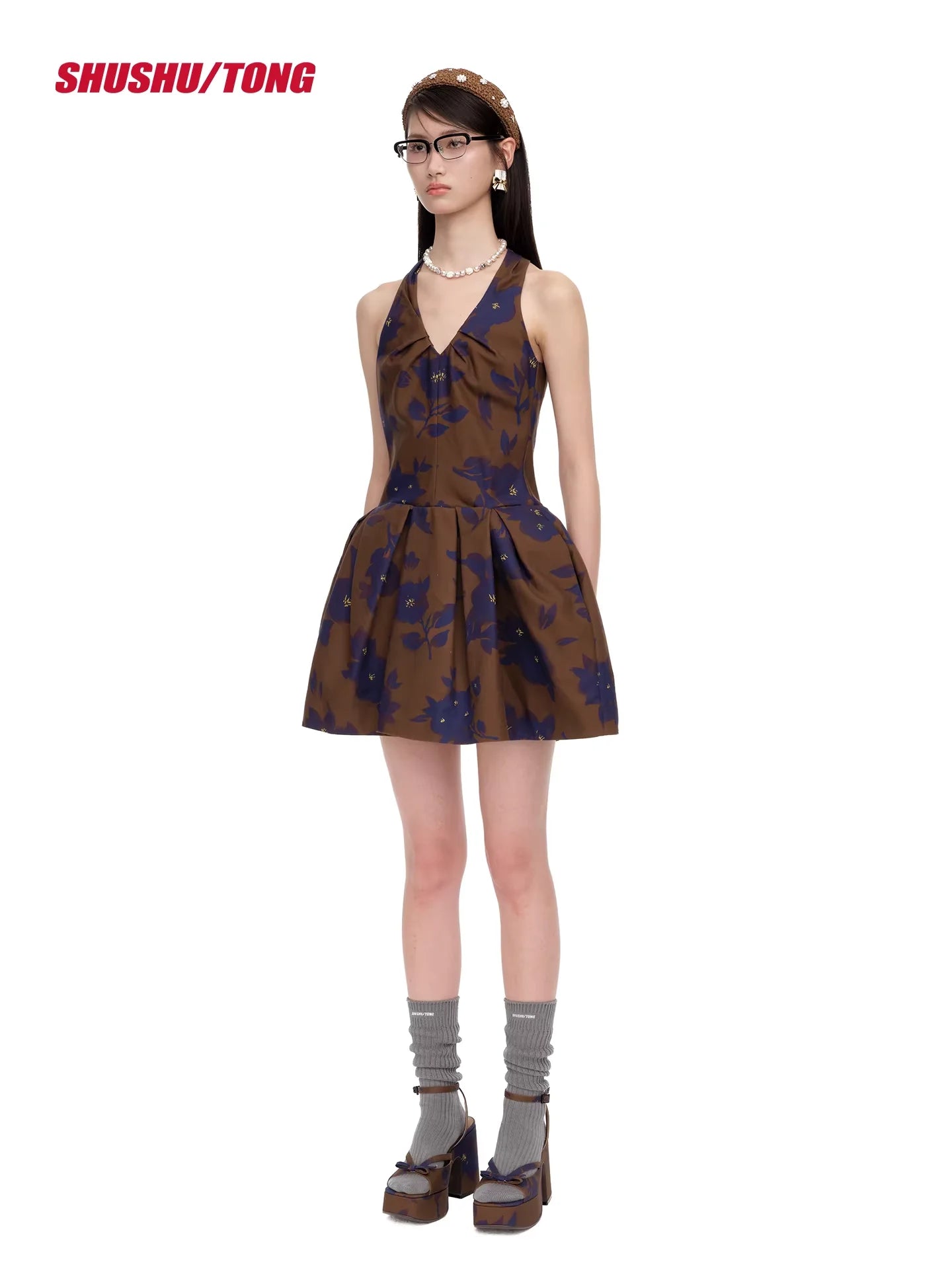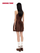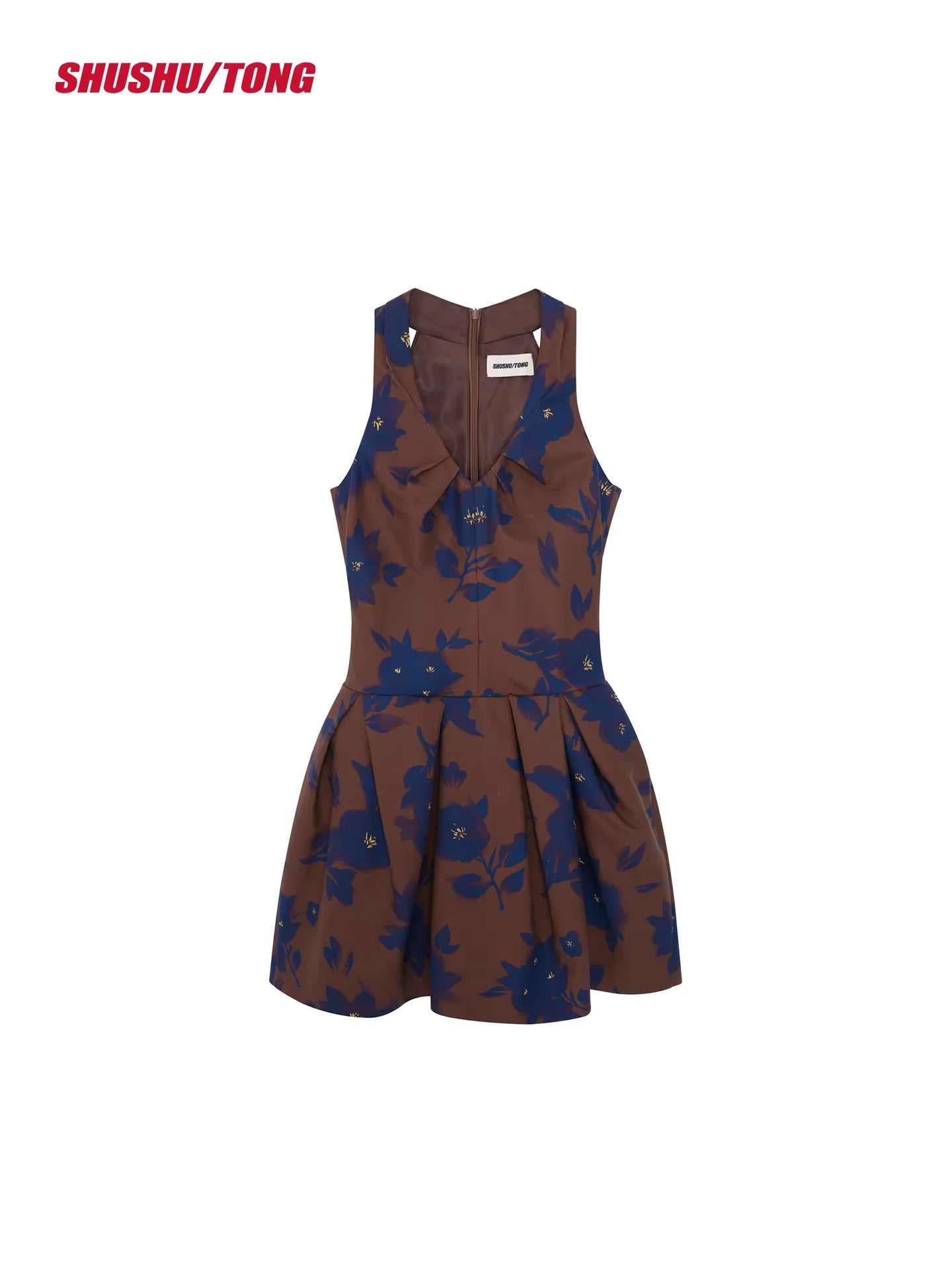 This women's winter halter dress features a sleeveless design with a deep V-neckline and a structured, pleated mini skirt. The brown fabric is adorned with a delicate blue floral print, while the flared waist provides a playful and flattering silhouette. Perfect for casual or commuter wear, this dress combines seasonal style with elegance.