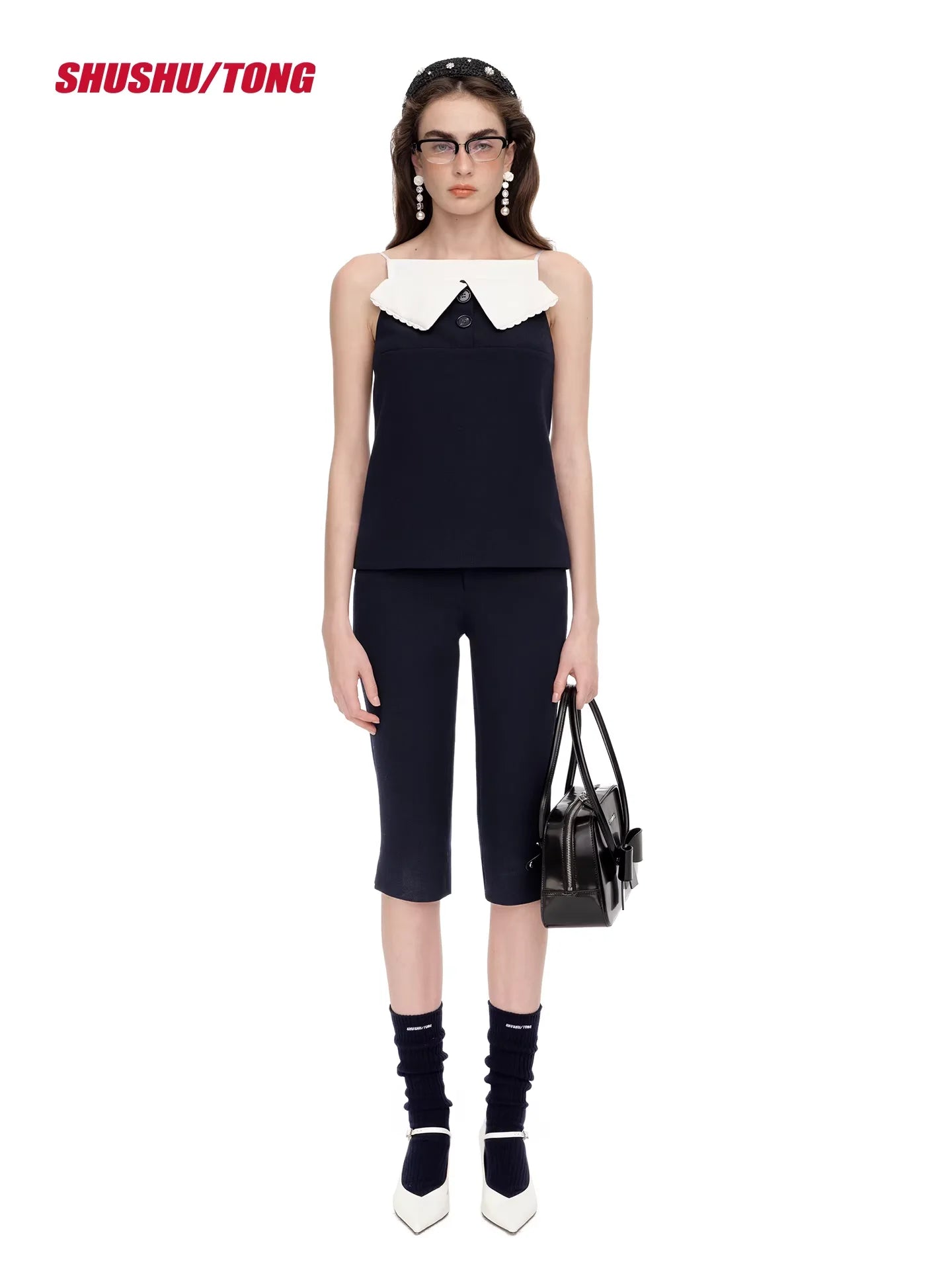 Elevate your winter wardrobe with these slim fit pencil pants designed for a sophisticated yet casual commuter look. Tailored to a knee-length cut in a refined dark navy hue, these pants offer a sleek silhouette perfect for everyday wear. As modeled in a curated women's fashion ensemble, they pair effortlessly with structured accessories and heeled footwear for a polished statement. Ideal for modern, stylish women seeking comfortable elegance throughout the season.