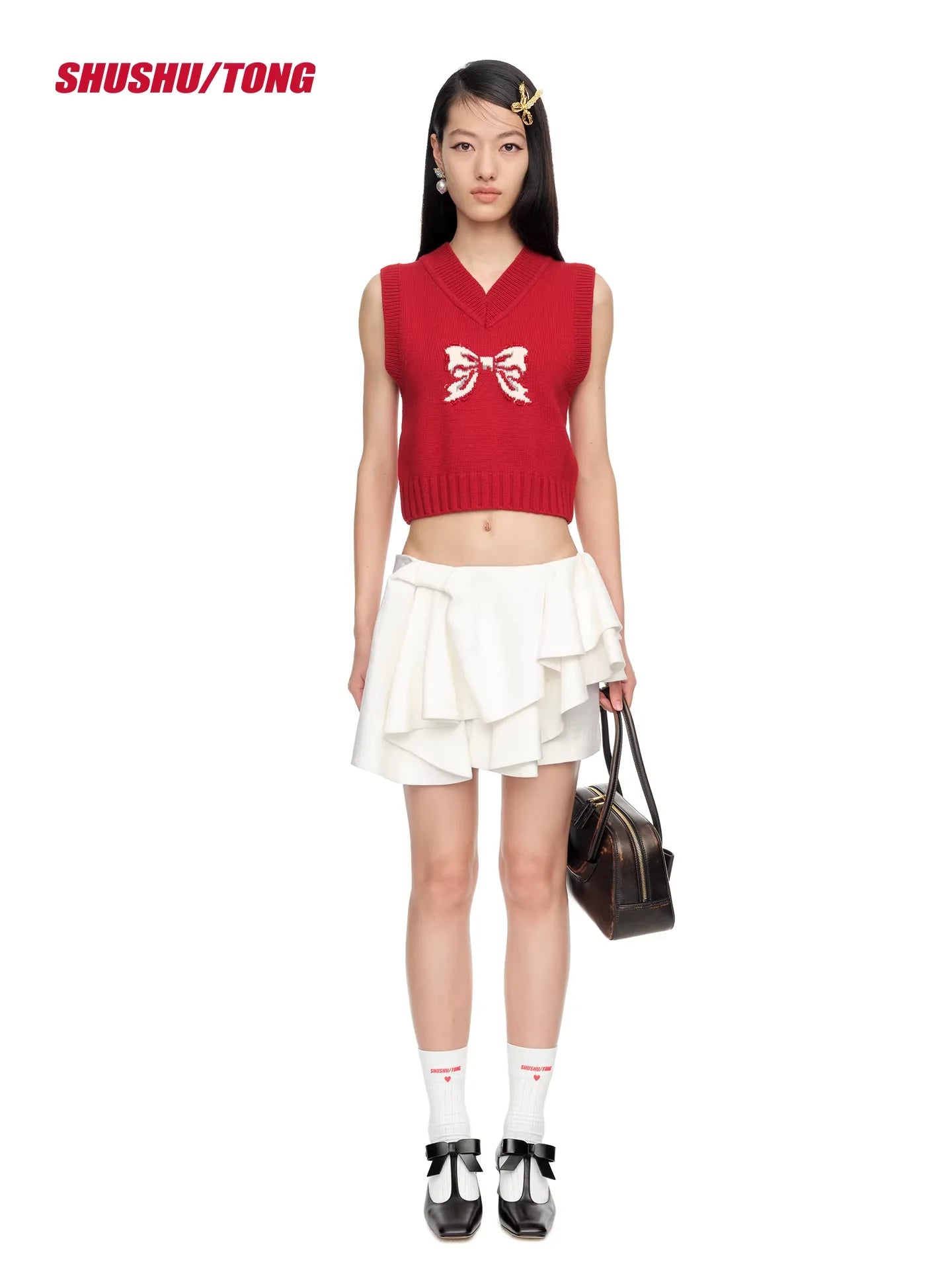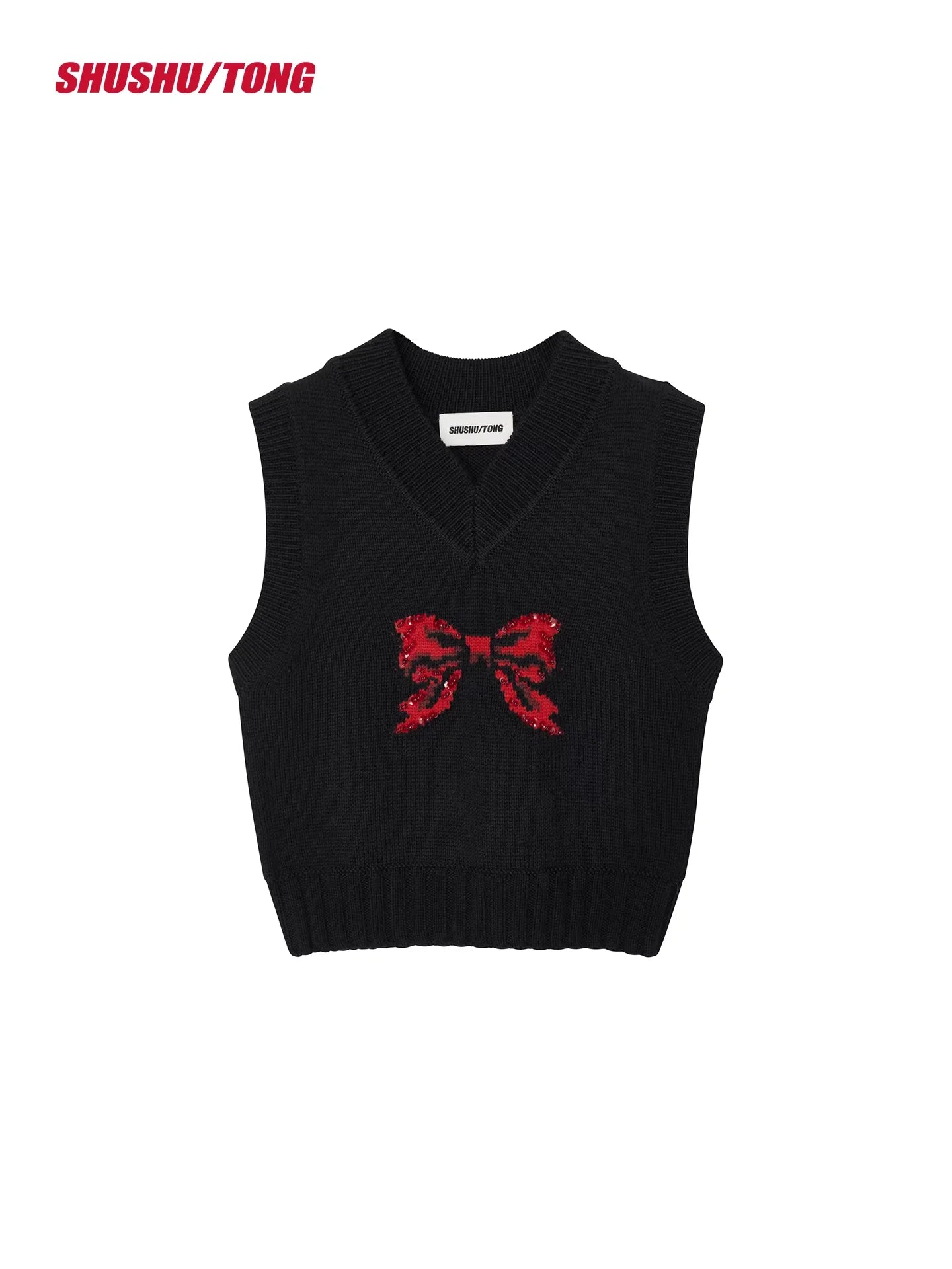 This stylish women's sleeveless knit vest top is perfect for spring and summer. Crafted in a vibrant red hue, it features a wide V-neckline and a bold white bow design on the chest for a touch of elegance. The ribbed hem ensures a flattering fit. Pair it effortlessly with skirts or trousers for a chic casual or commuter look.