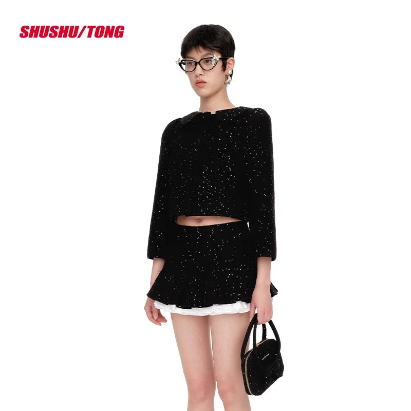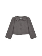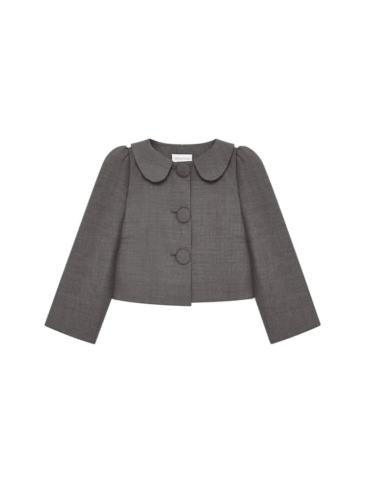 This stylish women's cropped jacket features a refined and elegant design, perfect for modern fashion enthusiasts. The dark gray color is complemented by a classic peter pan collar, three oversized front buttons, and three-quarter sleeves, offering a sophisticated look. Worn as part of a matching set with a pleated mini skirt, the jacket adds a polished touch to any ensemble. Ideal for adding charm and structure to your wardrobe, this piece combines timeless elegance with contemporary flair.