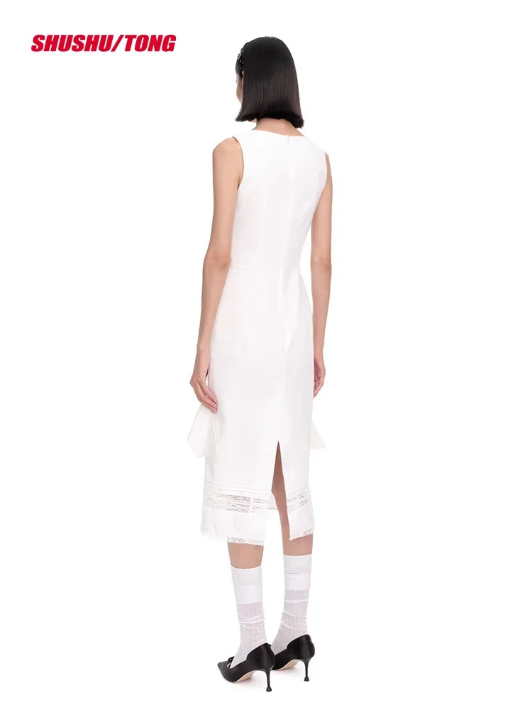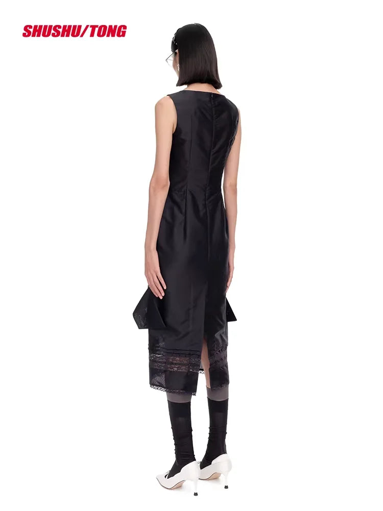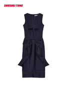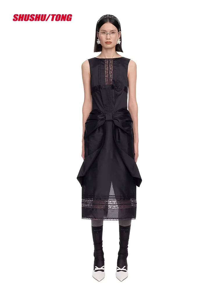 This women's elegant midi dress features a refined, sleeveless design with a structured silhouette and fitted bodice. Delicate vertical pleats adorn the front, while a dramatic oversized 3D bow at the waist adds a sophisticated, layered effect. Lace accents near the hemline contribute a soft, feminine touch, making it perfect for special occasions or elevated everyday style.