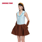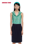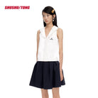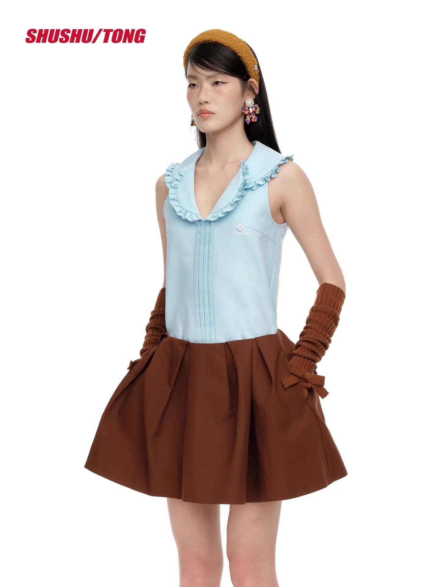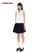 This elegant off-shoulder blouse for women features a sleeveless design with a wide, ruffled double collar adorned with lace detailing. A front zip closure adds a modern touch, while a subtle logo print on the chest enhances its refined look. Paired perfectly with skirts or trousers, this blouse offers a versatile and chic style suitable for casual or semi-formal occasions. The design captures a youthful and preppy aesthetic, making it a stylish choice for everyday fashion.