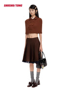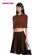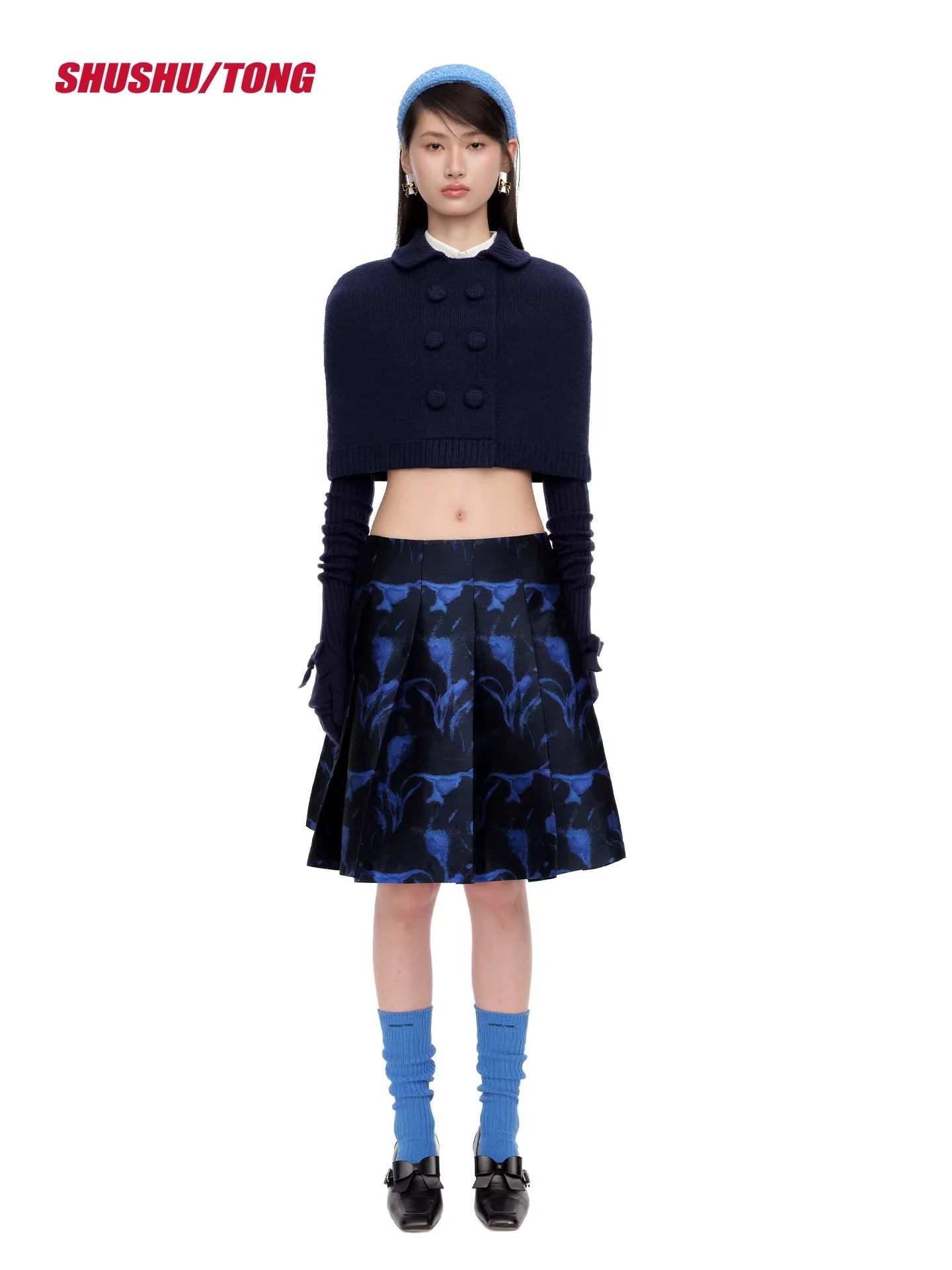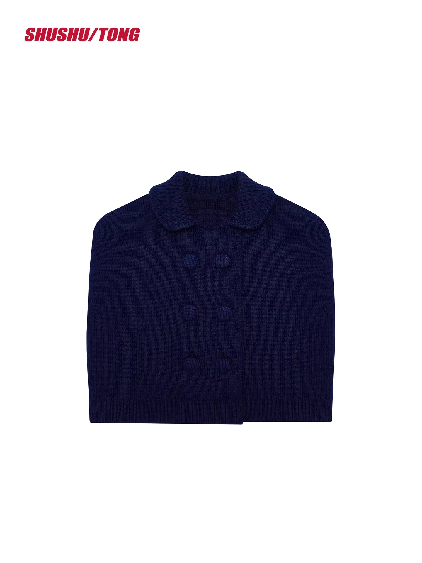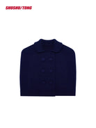 Elevate your winter wardrobe with this elegant women's double-breasted knit cardigan cape. Featuring a cropped silhouette and prominent button detailing, the navy blue knitwear offers a modern twist on classic winter style. The ribbed hem and long ruched sleeves add texture, while a high-waisted flared skirt and subtle abstract pattern enhance the look. Finished with a contrasting white shirt collar for a sophisticated touch.