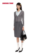 This women's winter pencil skirt features a sophisticated high-waisted design and a stylish diagonal waistband that adds a modern touch to a classic silhouette. The straight hem and knee-length cut make it ideal for professional or semi-formal occasions. Versatile in grey, it pairs effortlessly with layering pieces such as cardigans and collared shirts for a polished look.