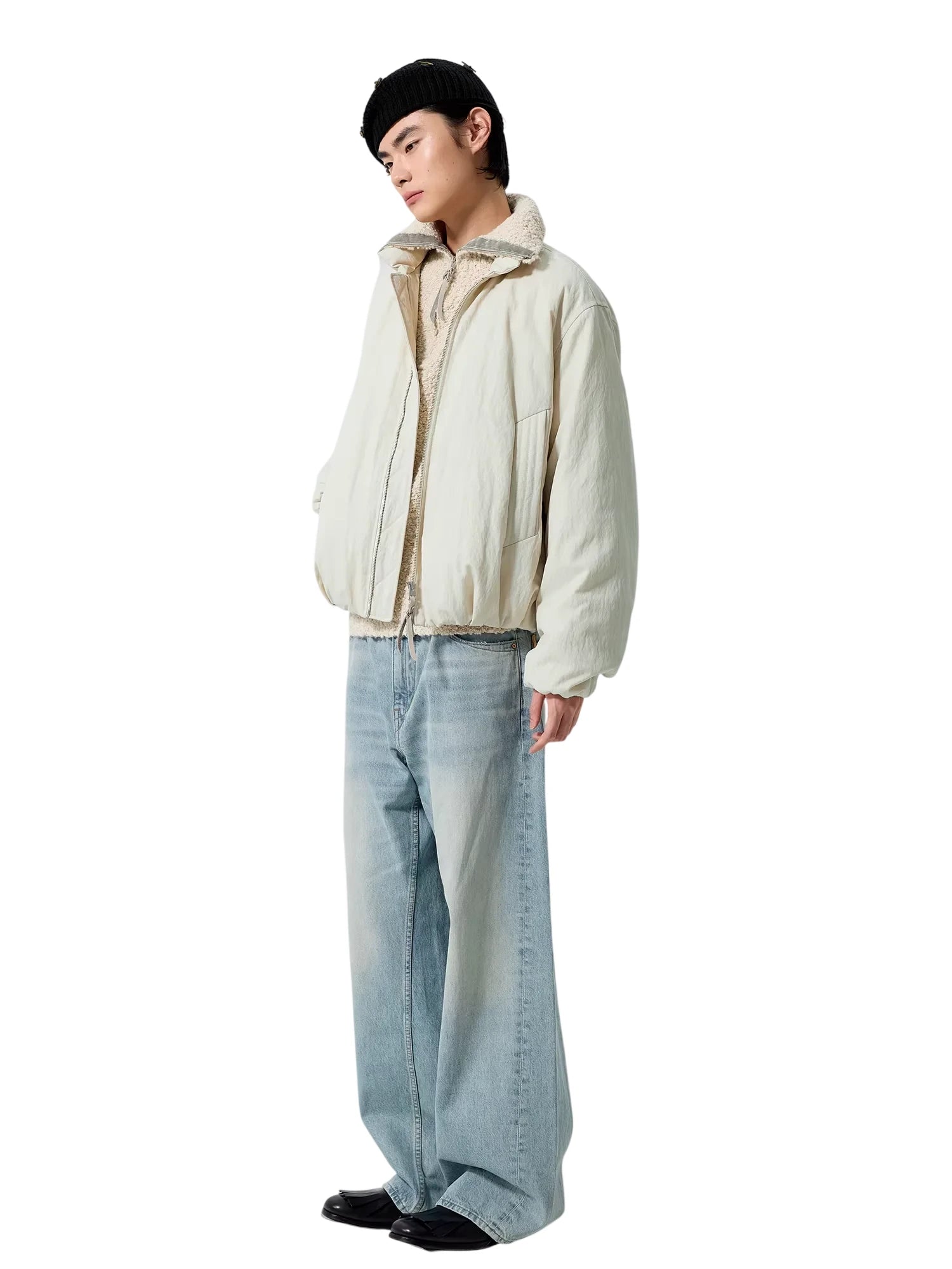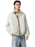 This men's puffer jacket features a modern balloon silhouette with a stand collar for added warmth and style. Designed with 3M cotton filling, it offers lightweight insulation without compromising comfort. The crinkled texture enhances its casual appeal, while the elastic cuffs and hem create a relaxed, secure fit. Perfect for layering, this cream-toned outerwear piece pairs seamlessly with a variety of everyday looks.