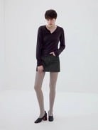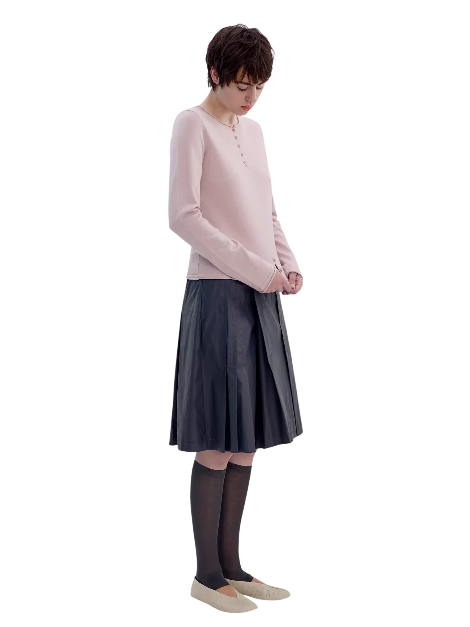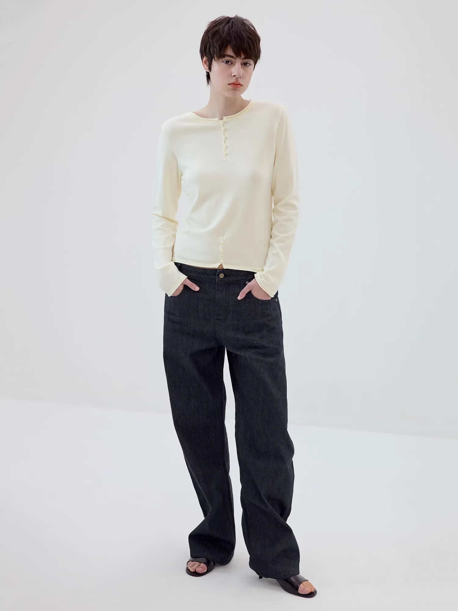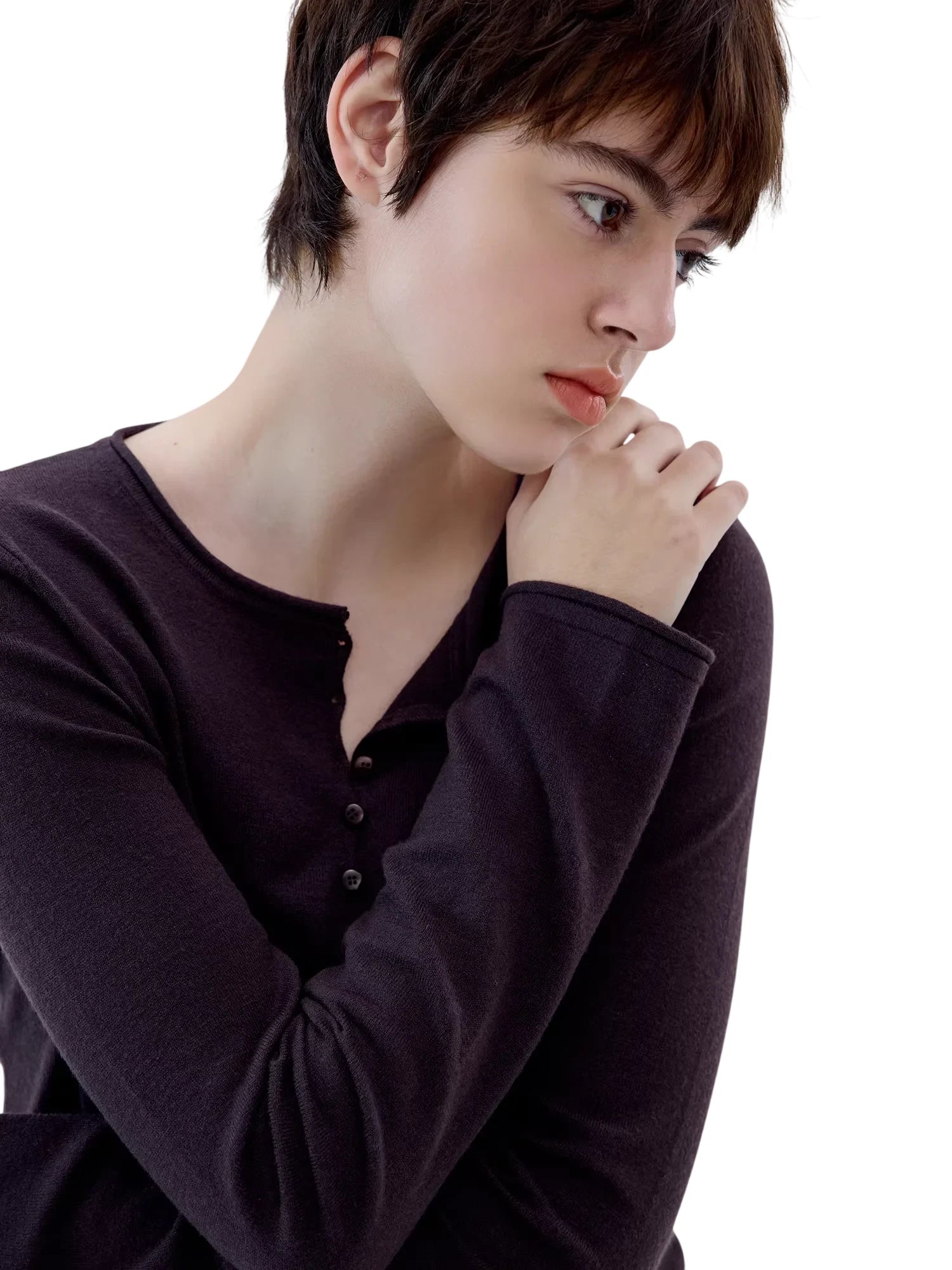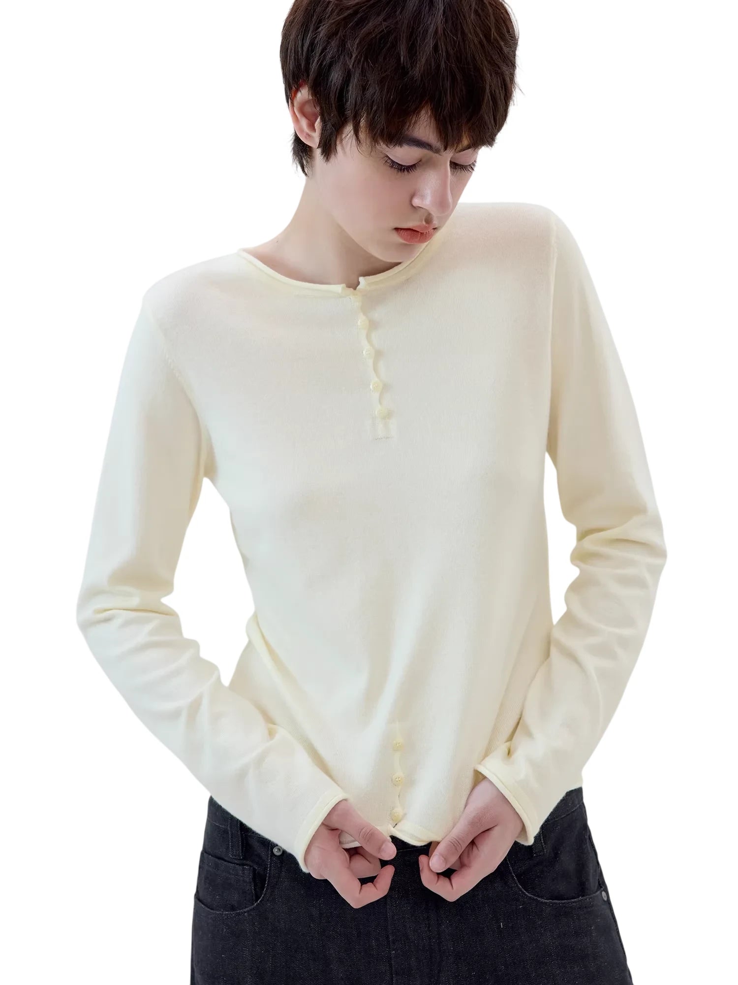 Simple Project Buttoned Fitted Knit Top with Rolled Edges