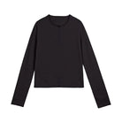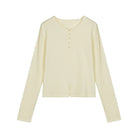 This women's long-sleeve top features a soft light yellow hue and a lightweight knit construction for comfortable wear. Designed with a round neckline and a partial fabric-covered button placket, it offers a refined touch. Rolled edges add a casual-chic element, while a subtle side slit enhances the fit. Perfect for pairing with high-waisted denim or casual trousers.