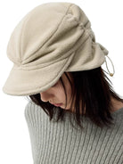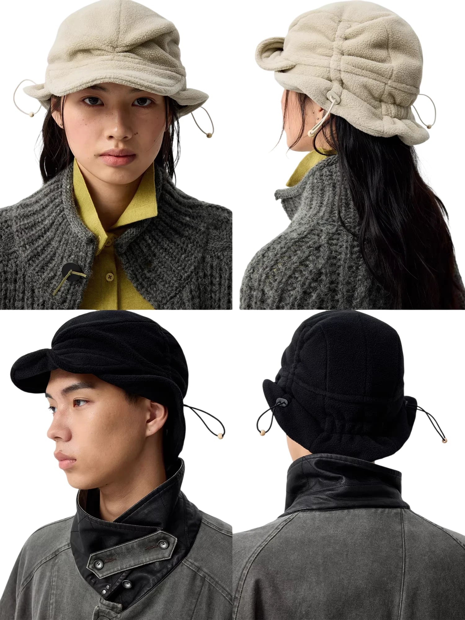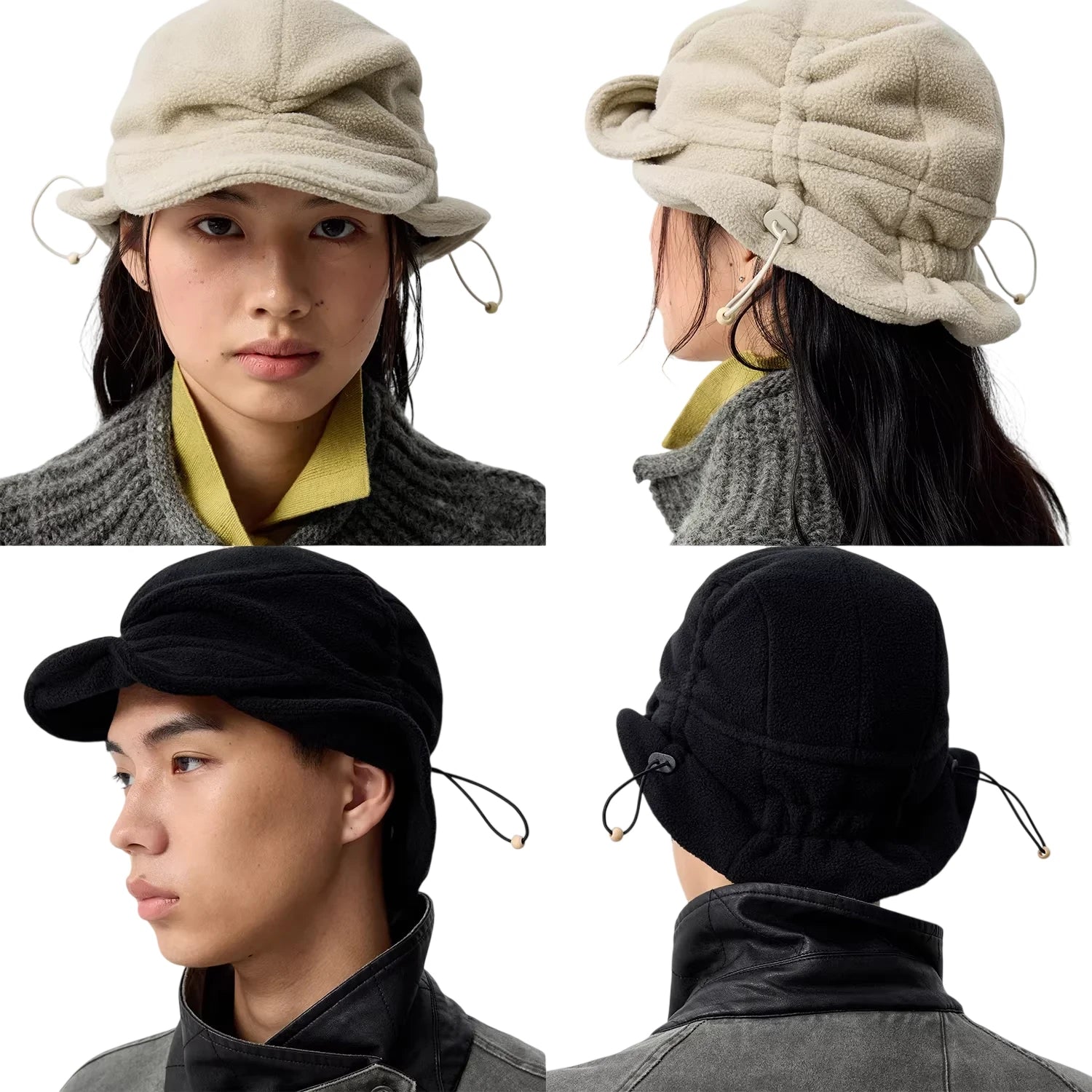 Available in two versatile color options—beige and black—this hat is modeled by both male and female individuals, showcasing its universal appeal and flattering shape from all angles.