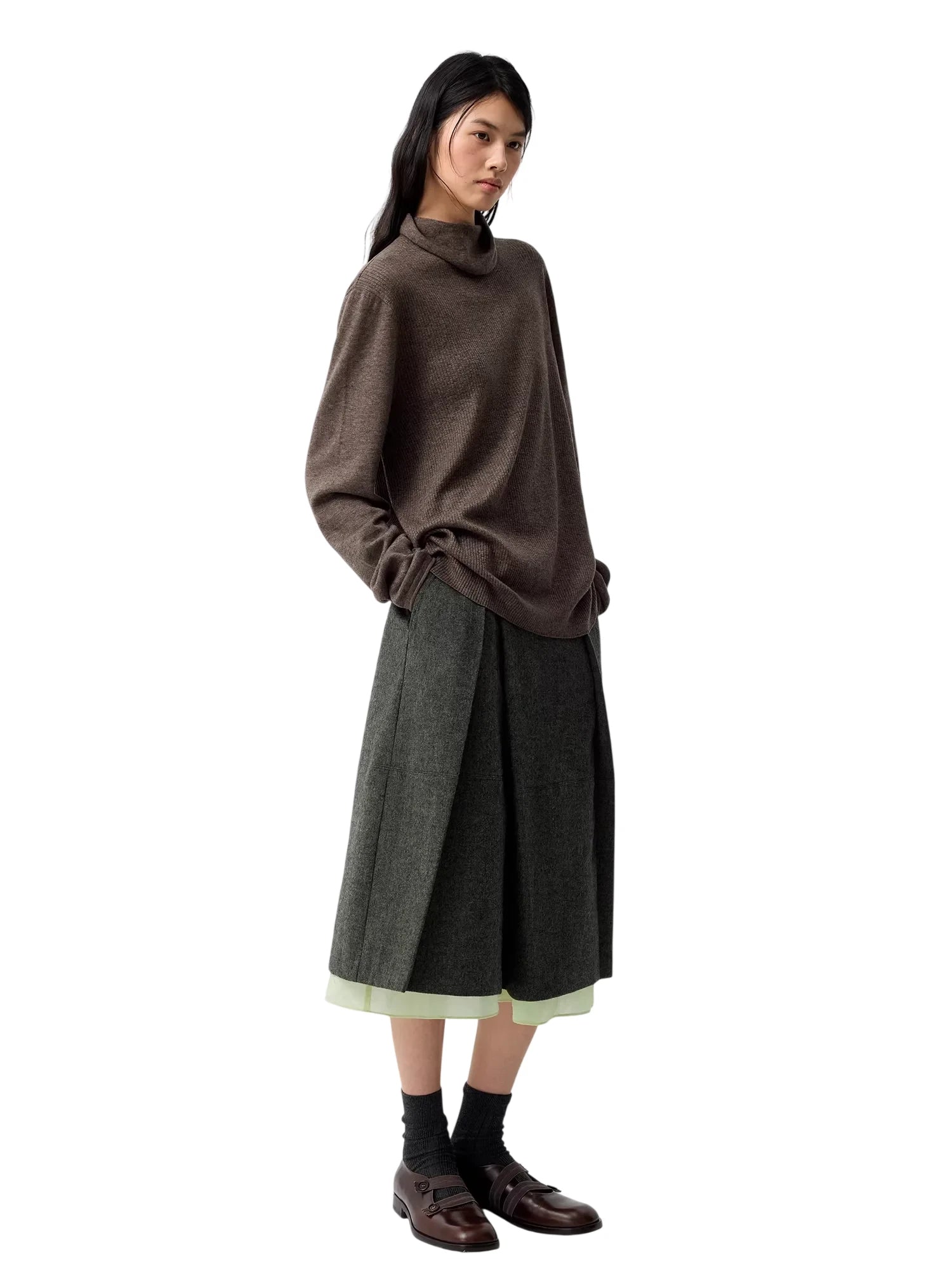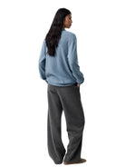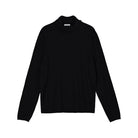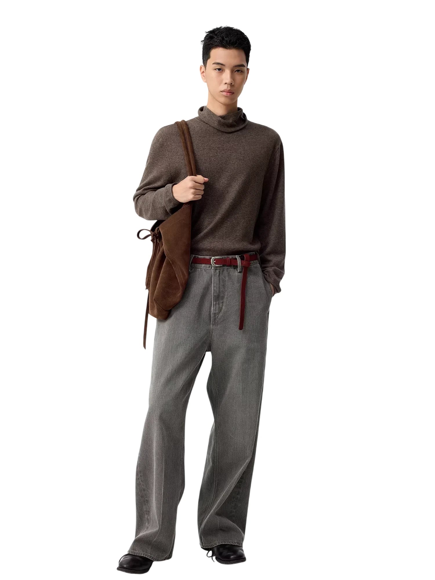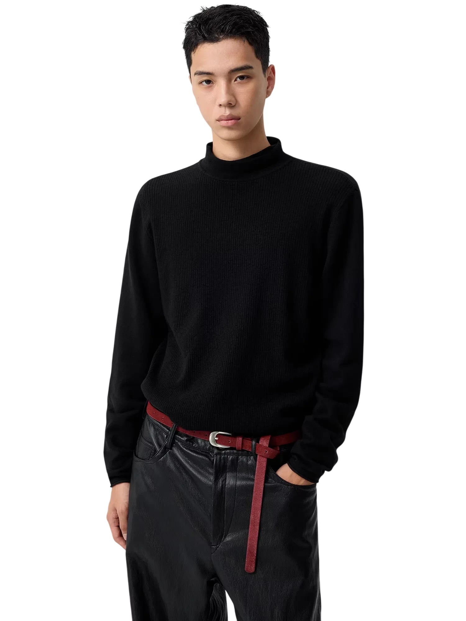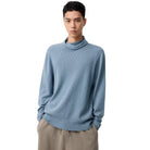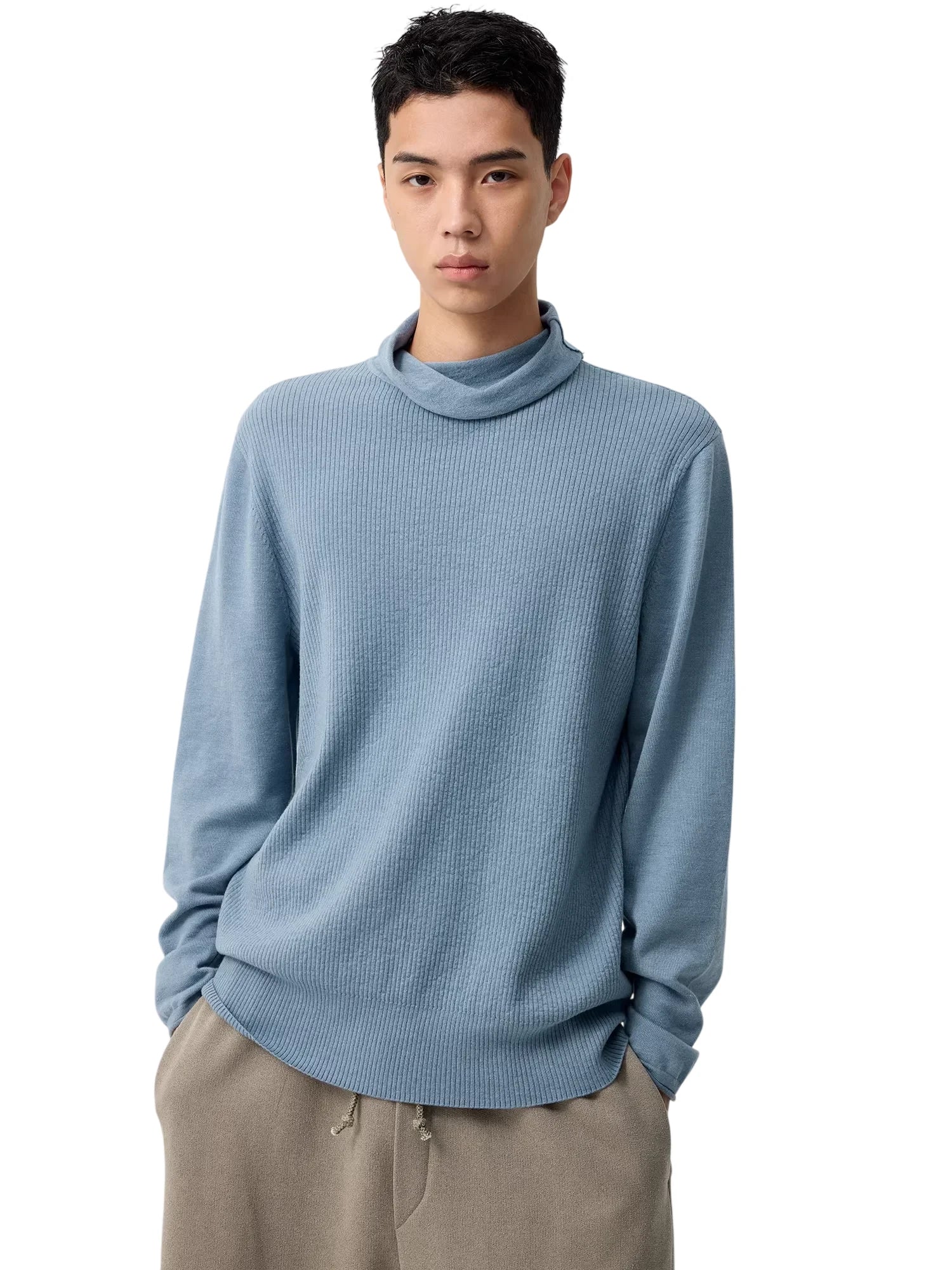 This men's ribbed knit sweater features a soft, light blue hue with a relaxed fit. The long sleeves and loosely draped turtleneck collar offer a comfortable and casual look. Crafted from a lightweight knit fabric, it's ideal for layering or standalone wear. Pair it effortlessly with drawstring trousers for a laid-back yet refined style.