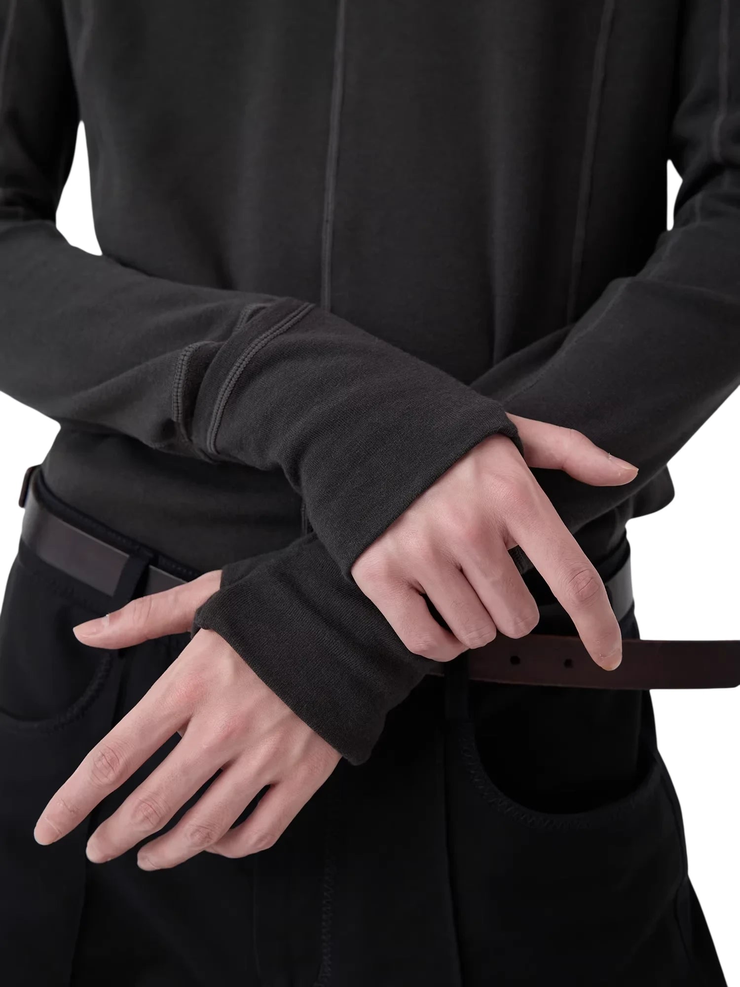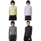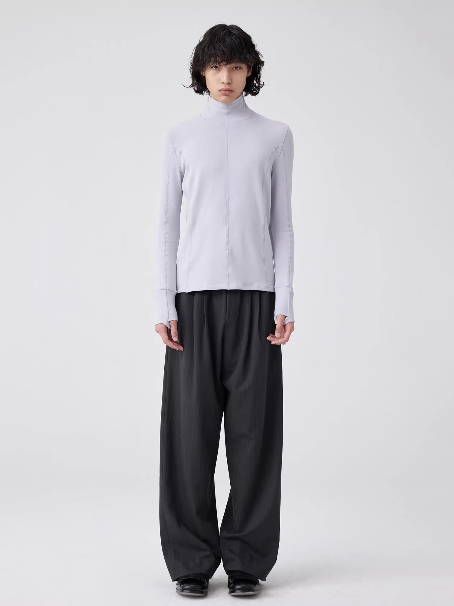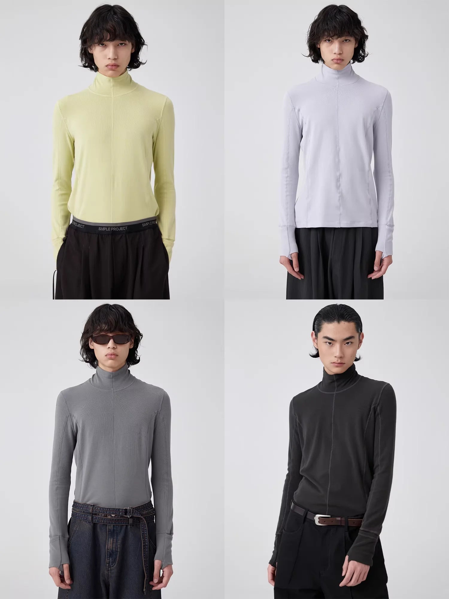 Elevate your wardrobe with this men's slim fit long sleeve base layer shirt, designed for a sleek and modern silhouette. Featuring a high neckline and ribbed texture, this form-fitting top offers both comfort and style. The thumb holes at the cuffs add functional flair, while its minimalist, zipper-free design makes it versatile for layering or wearing solo. Available in solid colors such as light yellow, lavender, grey, and charcoal, this piece pairs effortlessly with dark-layered bottoms for a contemporary look.