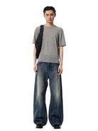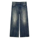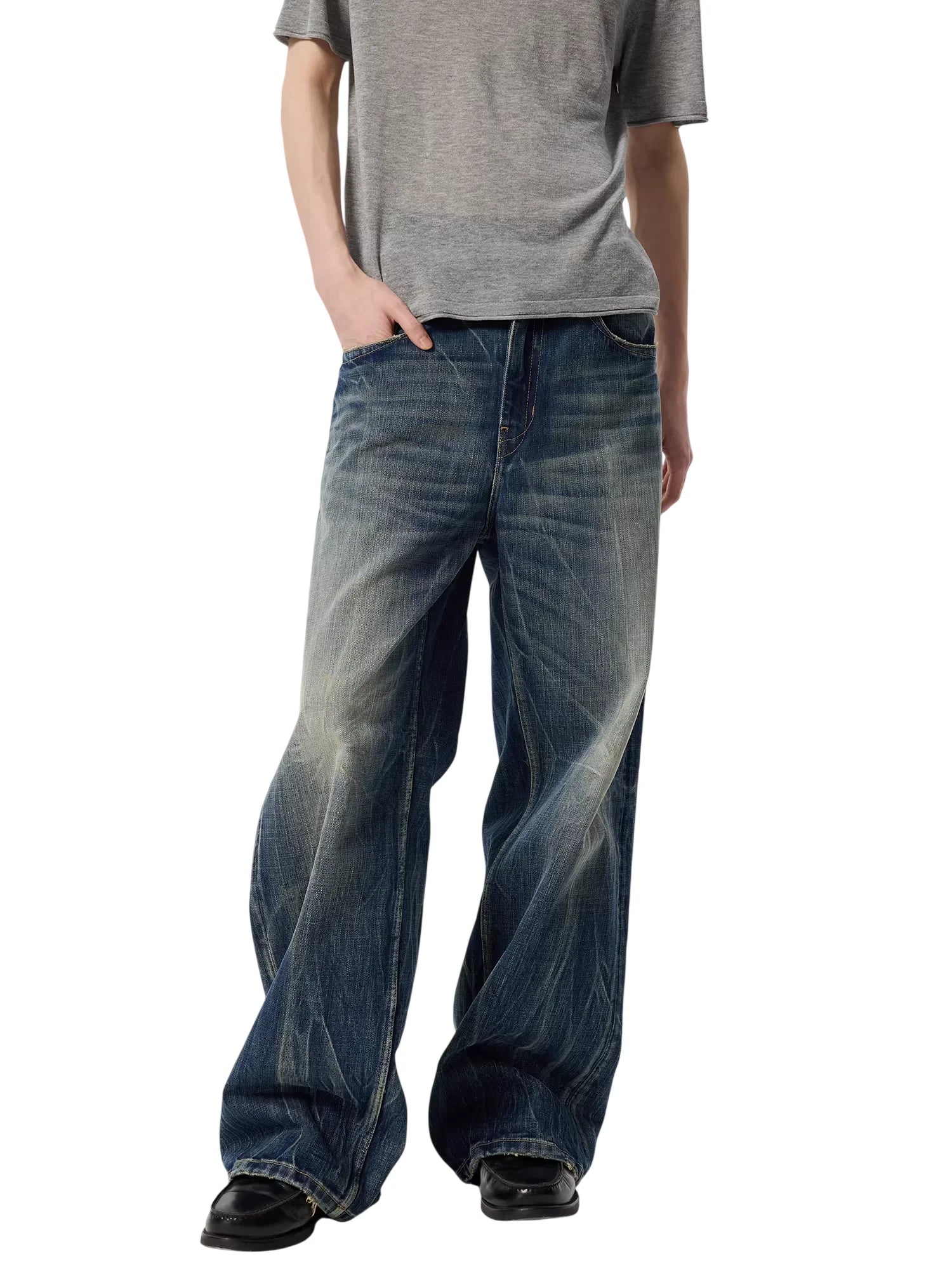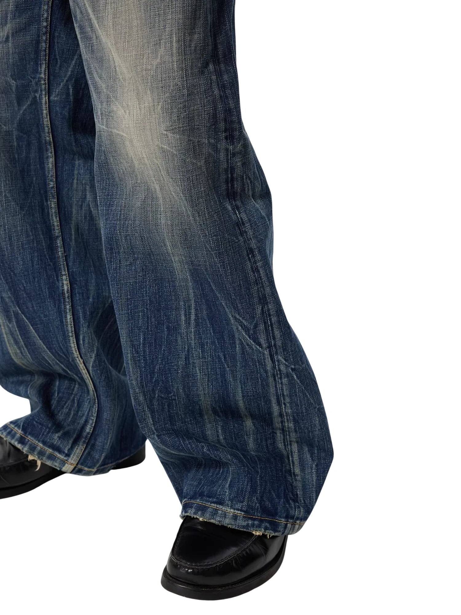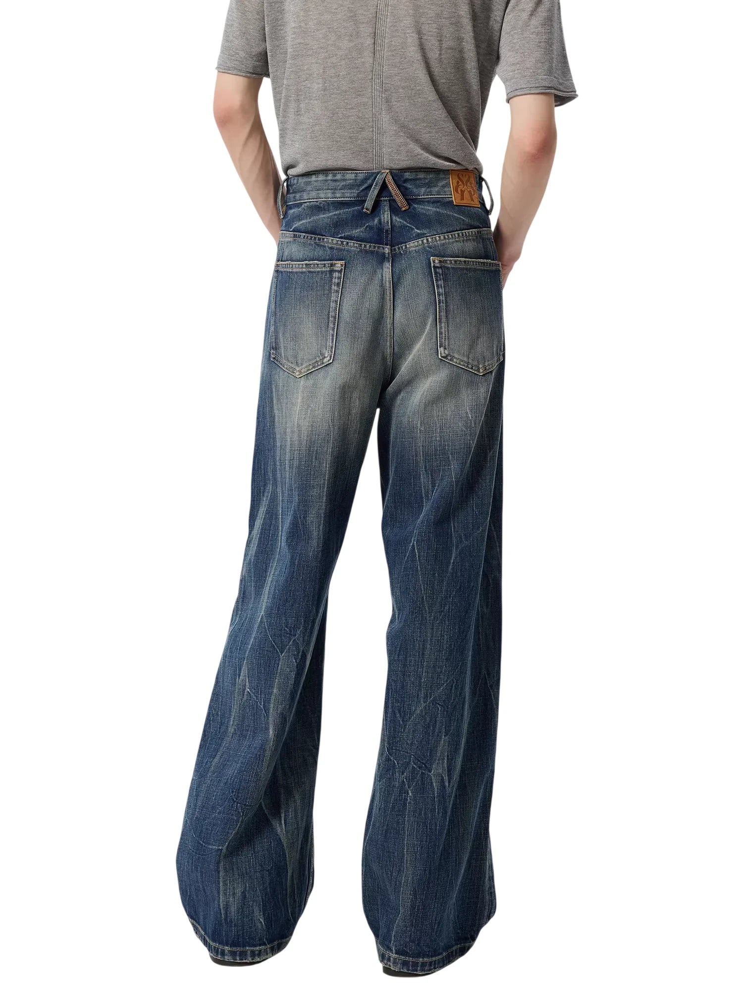 These men's wide-leg jeans feature a unique lightning wash pattern with heavy distressing, giving them a bold, vintage-inspired aesthetic. Designed with a mid-rise fit, they showcase pronounced whiskering, fading, and creasing for a worn-in appeal. The exaggerated wide-leg silhouette creates a relaxed look, ideal for casual styling.