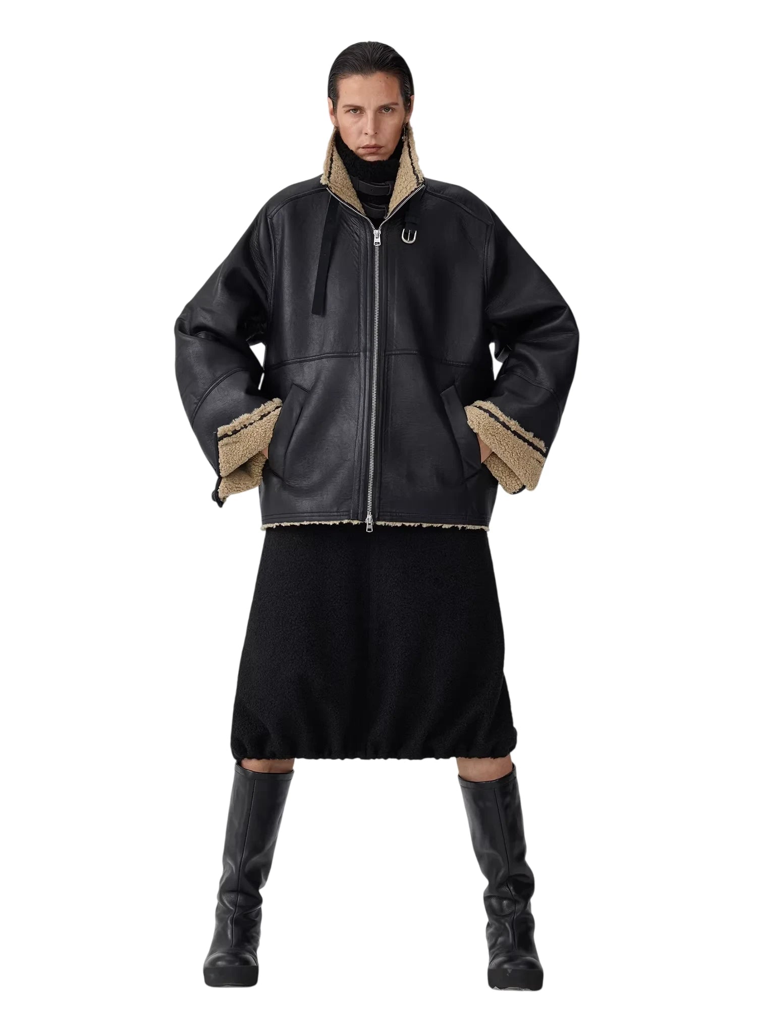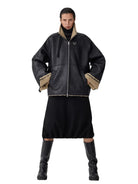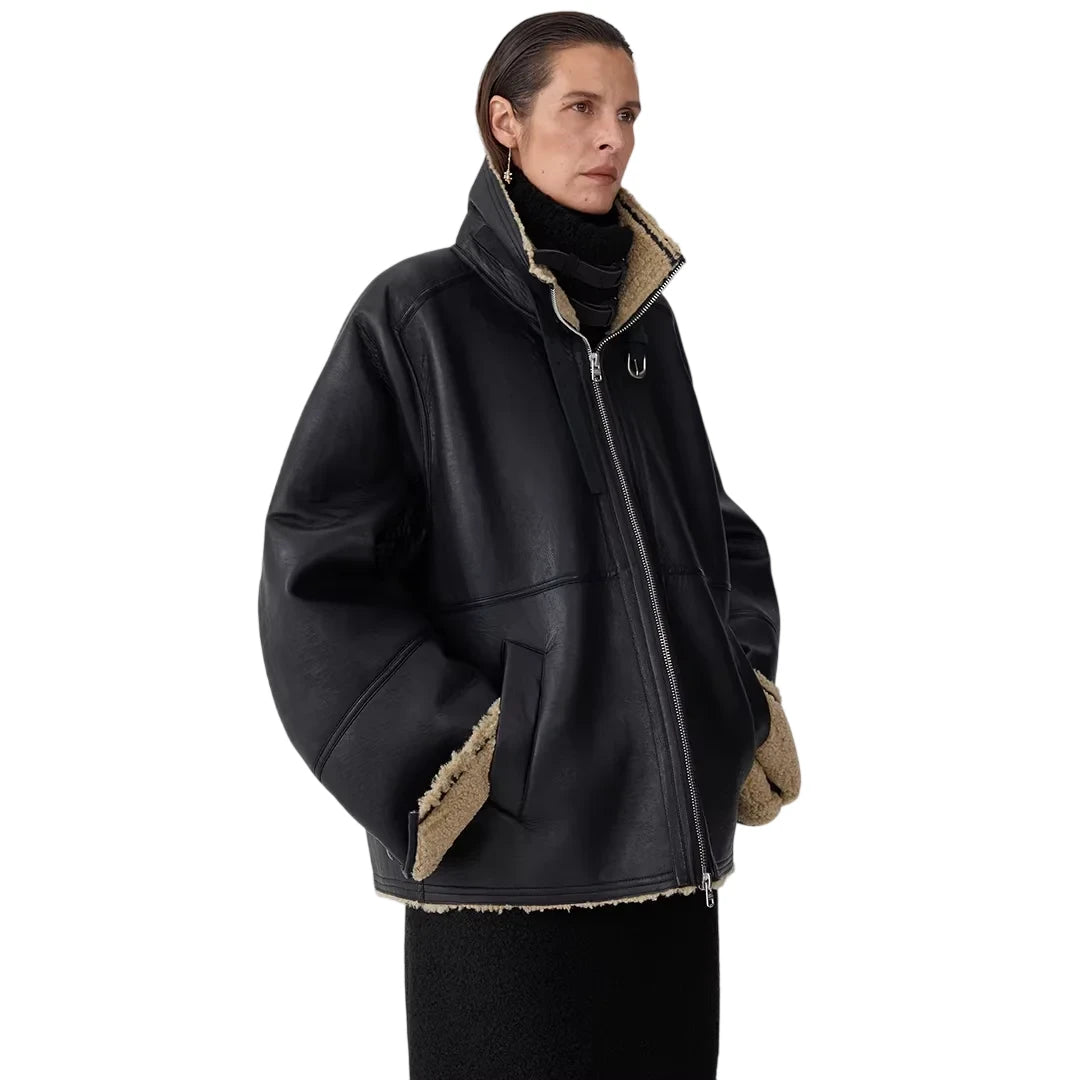 This oversized shearling leather jacket is a winter-ready outerwear piece designed for women. Crafted in a black matte finish, the jacket features exposed tan fleece lining for added warmth and contrast. It comes with a high collar, full front zip closure, and practical side pockets. Thoughtful details such as a circular metallic embellishment on the chest and zip slider at the collar add a modern, edgy touch, while the structured silhouette enhances its contemporary appeal.