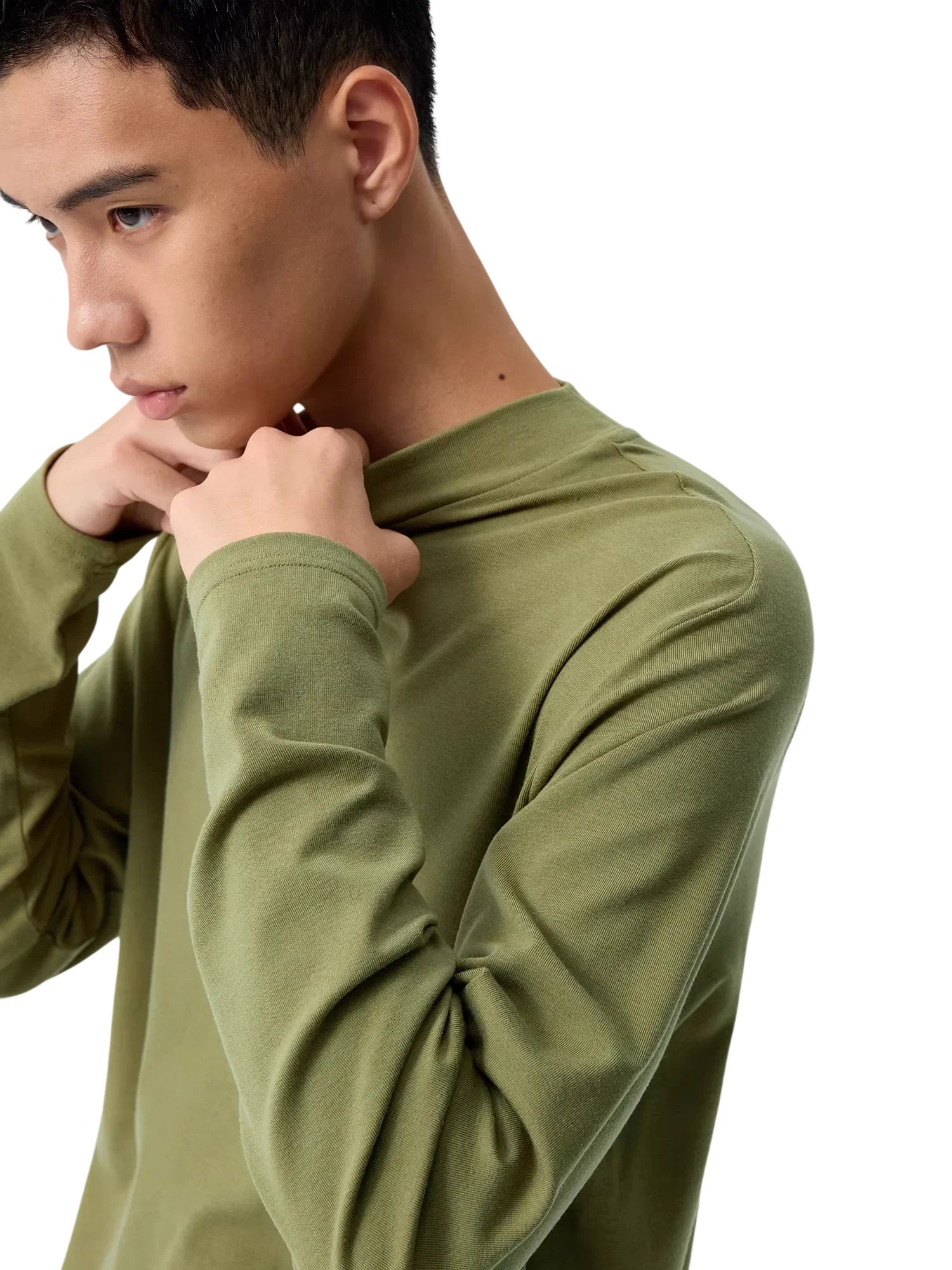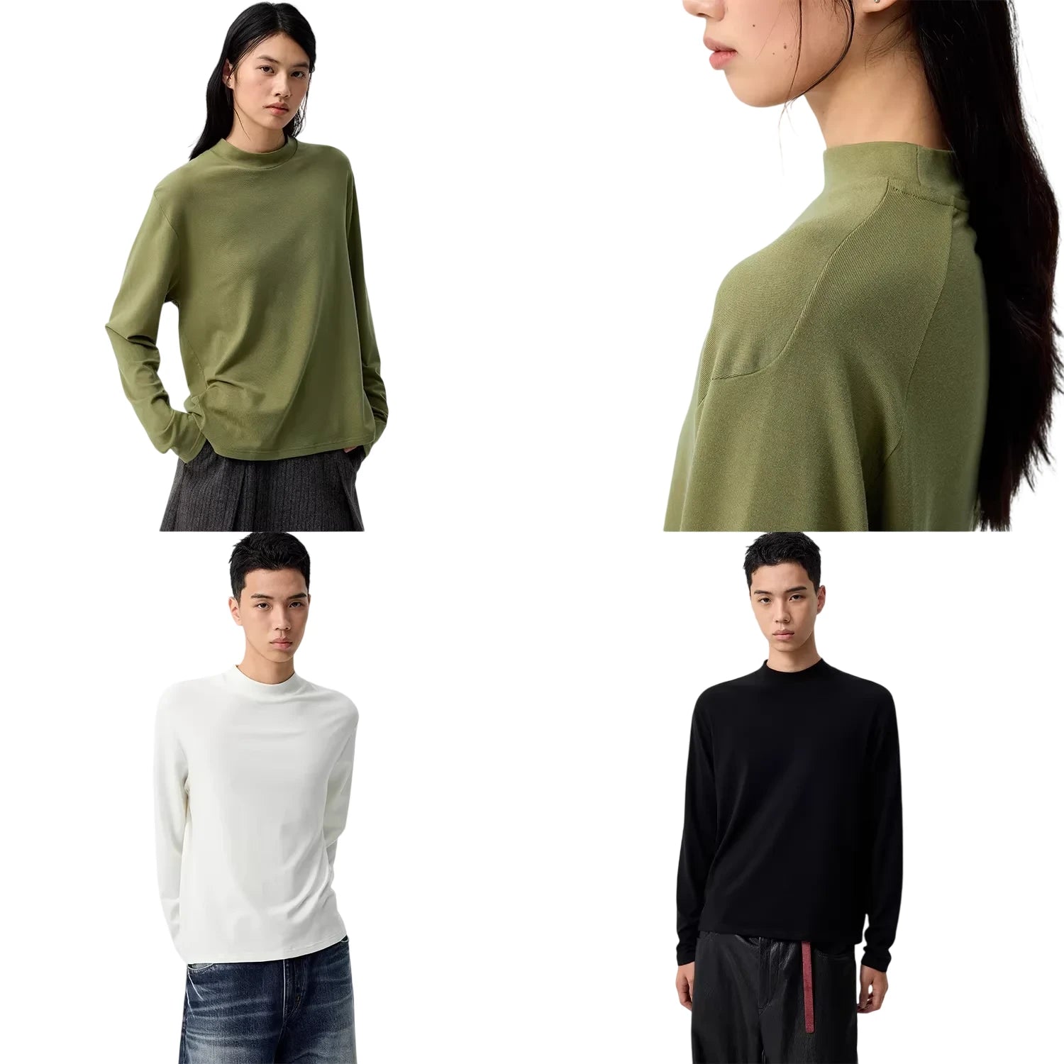 Elevate your everyday essentials with this unisex long sleeve T-shirt crafted from soft, lightweight merino wool. Featuring a modern slim fit and a sophisticated mock neck collar, this shirt is designed for comfort and style in any setting. Available in olive green, white, and black, its minimal silhouette offers versatile layering options for a polished casual look.