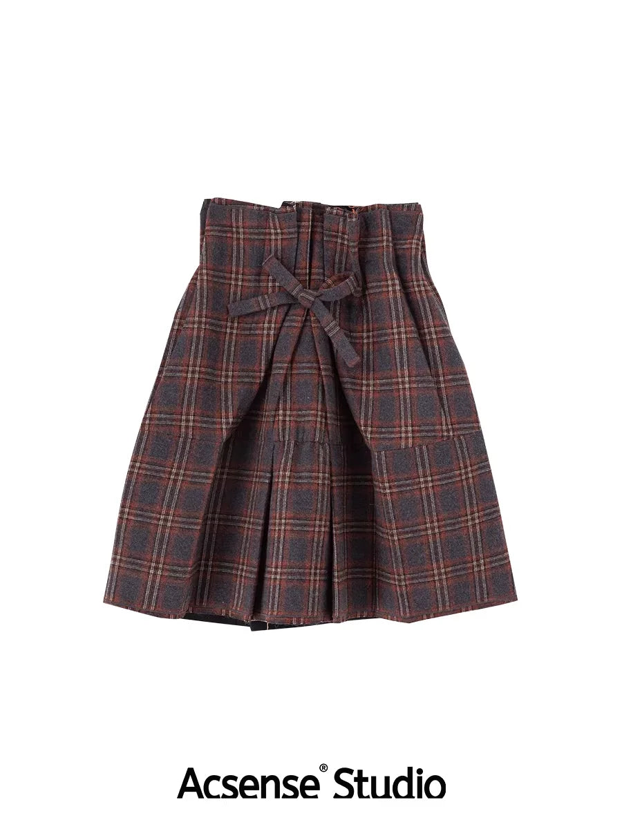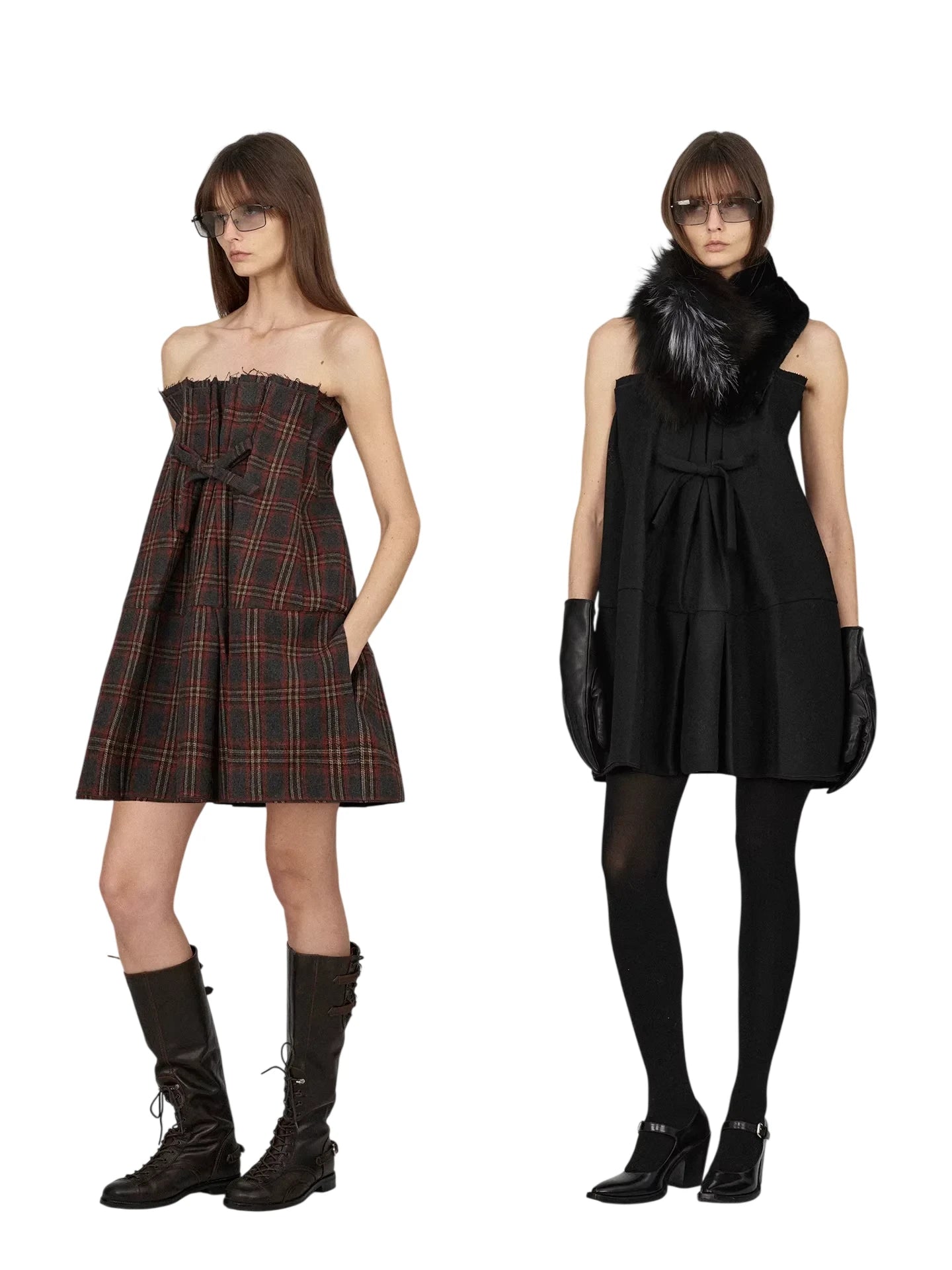 Elevate your wardrobe with this versatile strapless mini dress, crafted from high-quality wool. Featuring a structured A-line silhouette, this dress is available in a red and green tartan pattern or a classic solid black. Both styles are adorned with a charming bow detail at the chest and finished with thoughtful design elements such as front pockets or tiered layers.