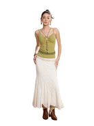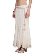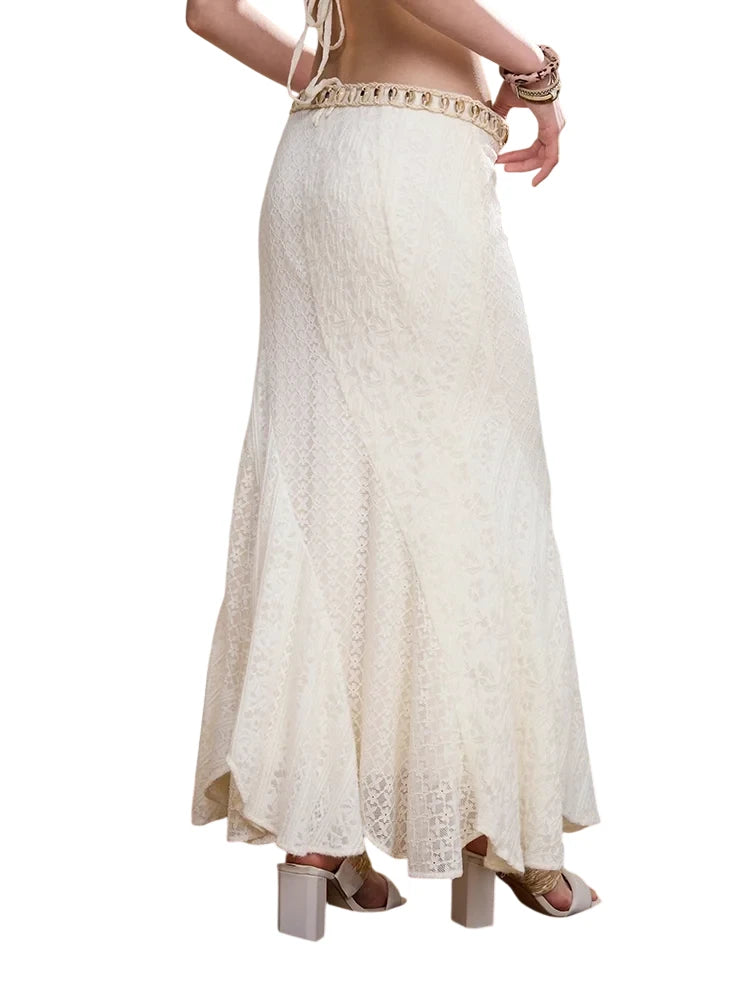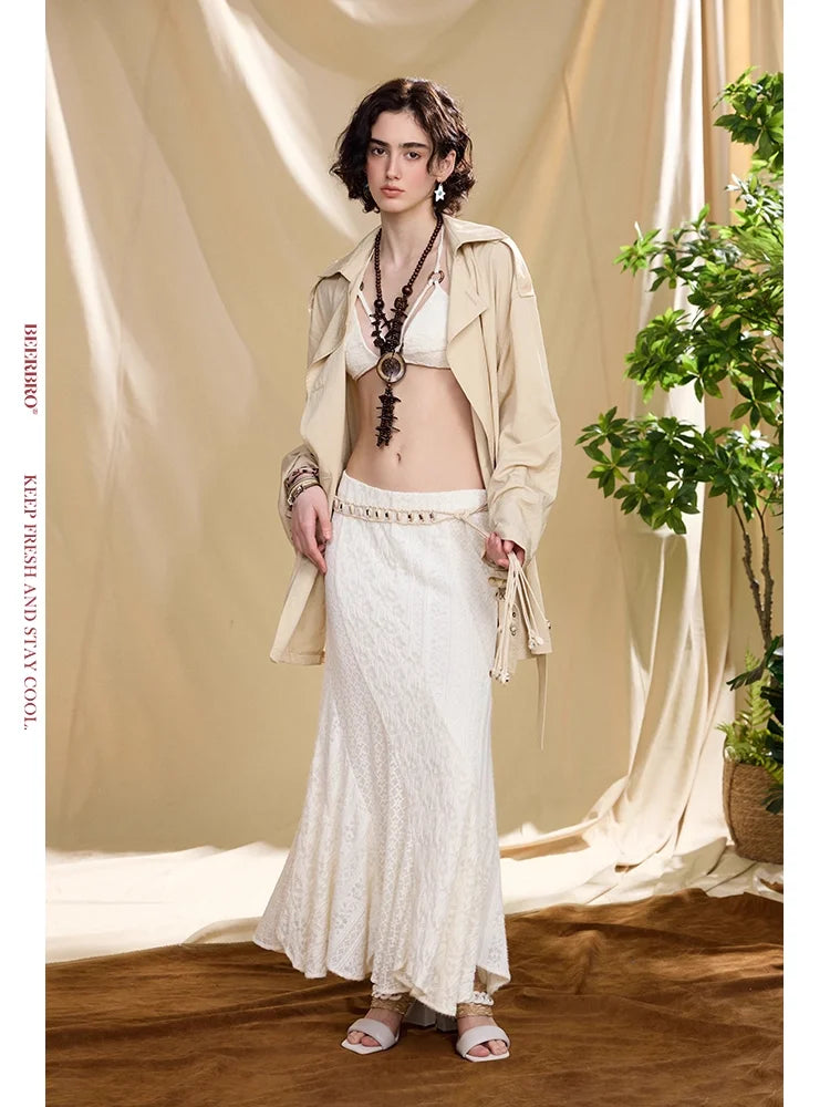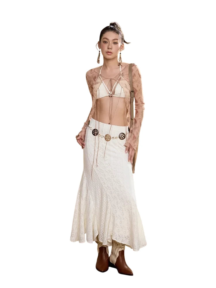 Elevate your wardrobe with this bohemian-inspired two-piece set, perfect for women who value elegance with a touch of free-spirited charm. The ensemble includes a delicate white lace bralette and a matching long textured mermaid-style skirt that flows effortlessly. A light beige cropped trench coat adds a chic layered dimension, while a tan fringe belt and chunky layered necklace accentuate the earthy aesthetic. Ideal for creative and stylish looks, this set combines comfort with statement fashion.
