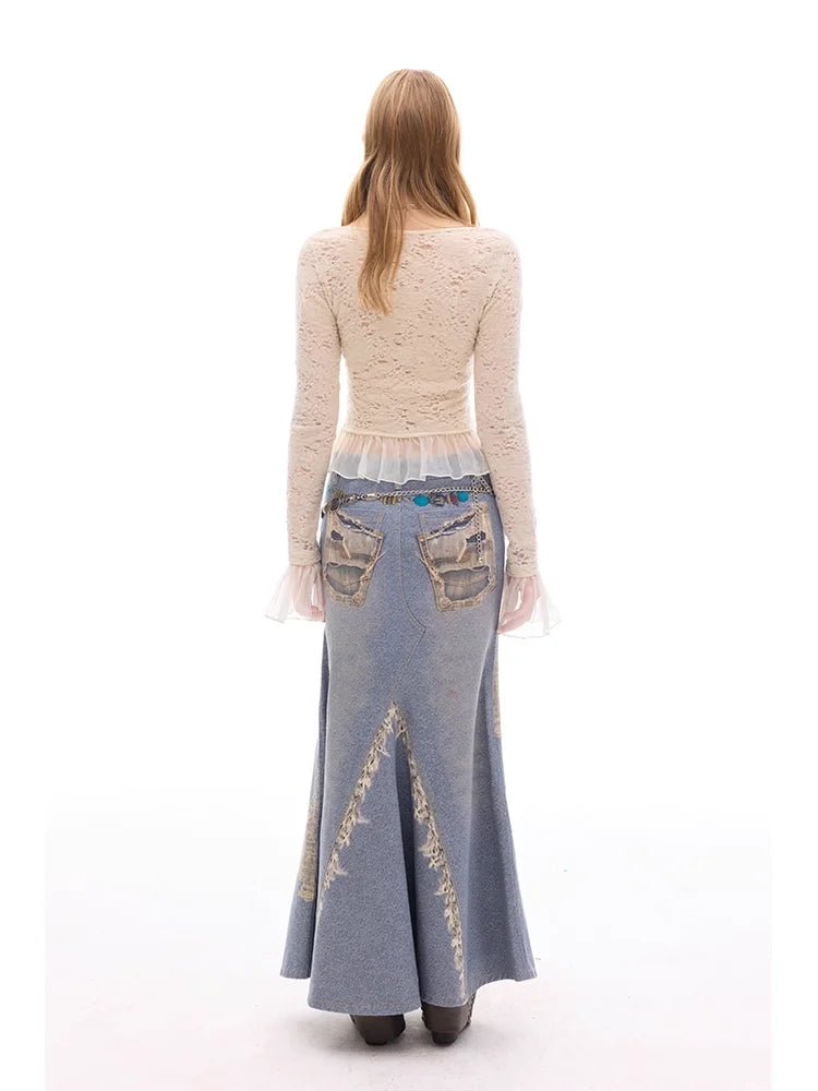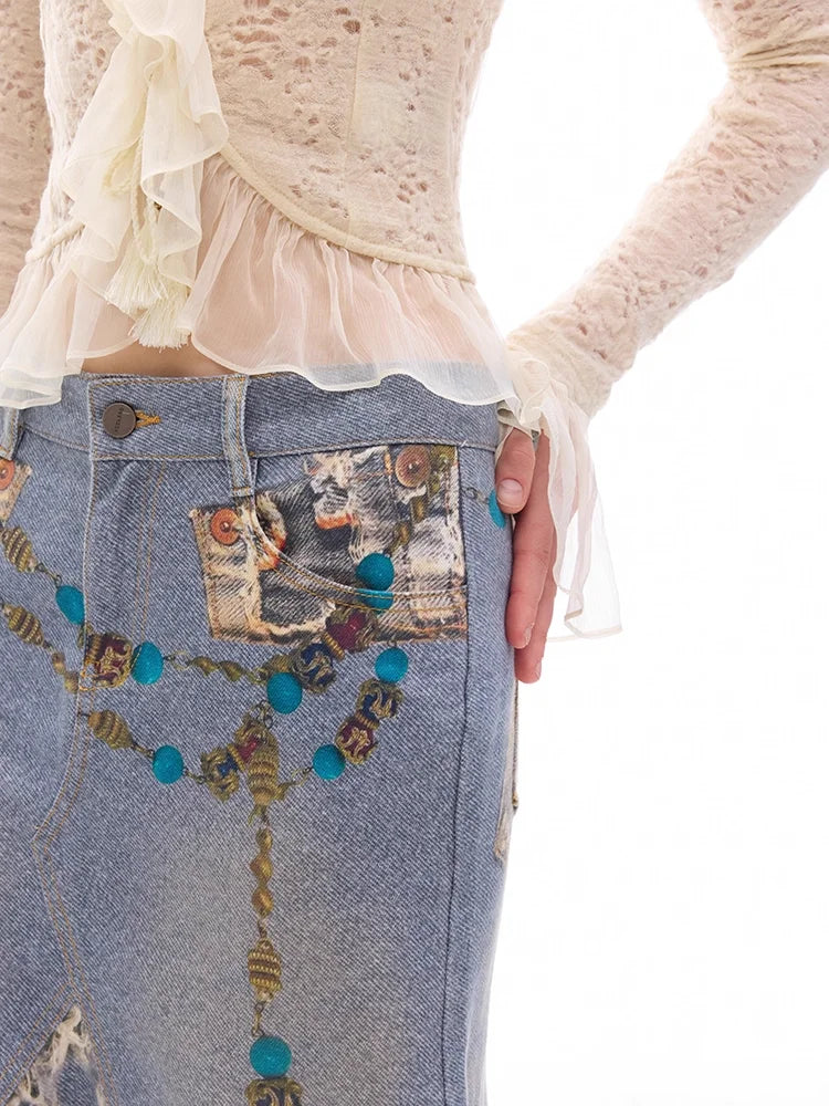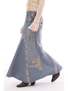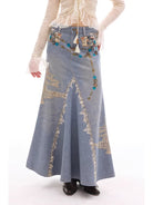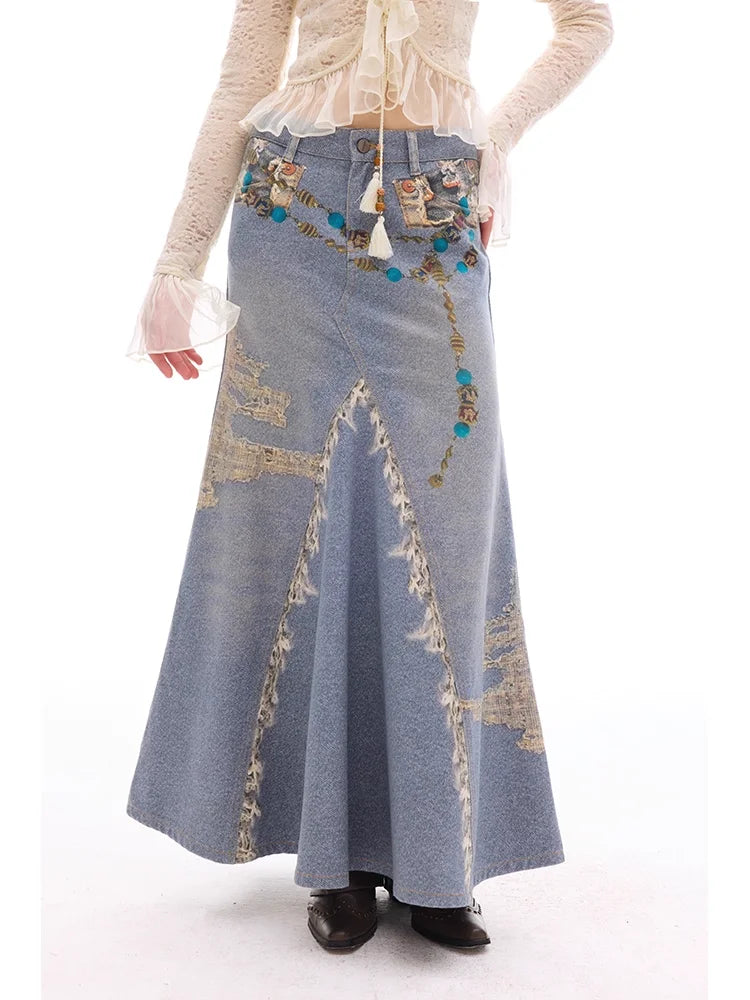 Elevate your bohemian wardrobe with this women's A-line maxi skirt, crafted from soft denim and adorned with raw hem detailing and playful tassel embellishments. The floor-length silhouette features decorative distressed patches and embroidered accents, creating a free-spirited, artsy look. Ideal for pairing with lace blouses or casual tees, this skirt brings both style and movement to your outfit.
