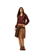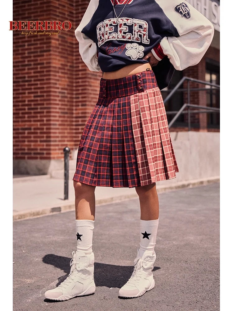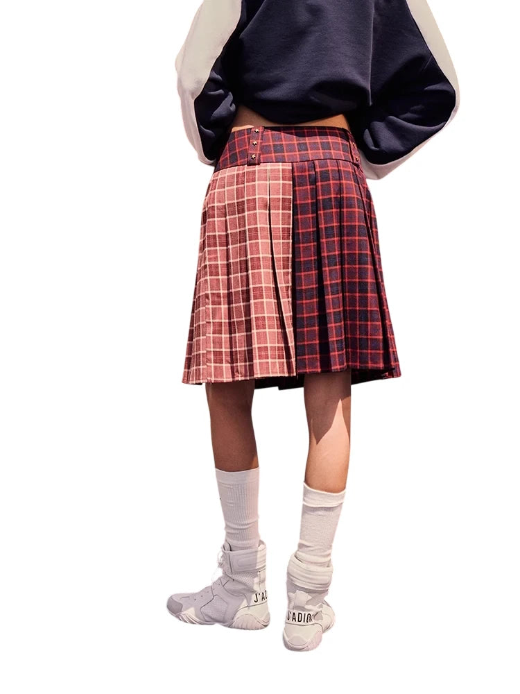 Elevate your streetwear style with this women's pleated mini skirt, featuring a bold colorblock design in contrasting red and pink plaid patterns. The A-line silhouette adds a flattering shape, while button accents along the waistband enhance the fashionable look. Perfect for creating eye-catching outfits, this skirt blends American street style with a playful twist. Pair it with your favorite varsity jacket and high-top sneakers for a complete urban look.