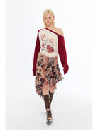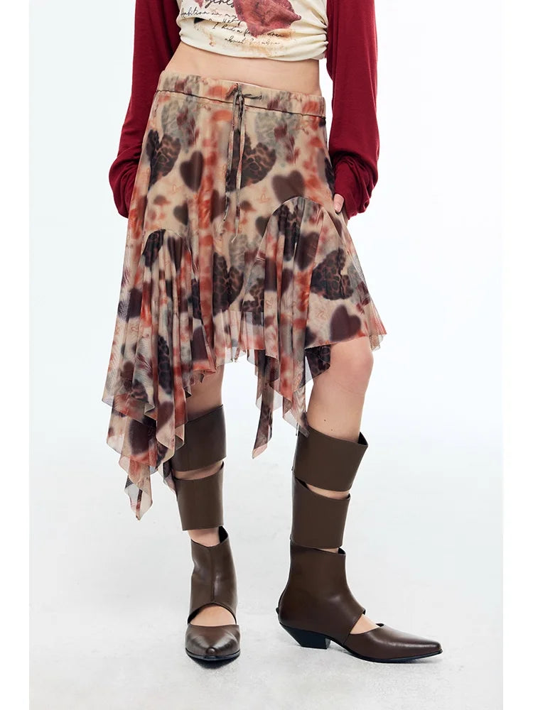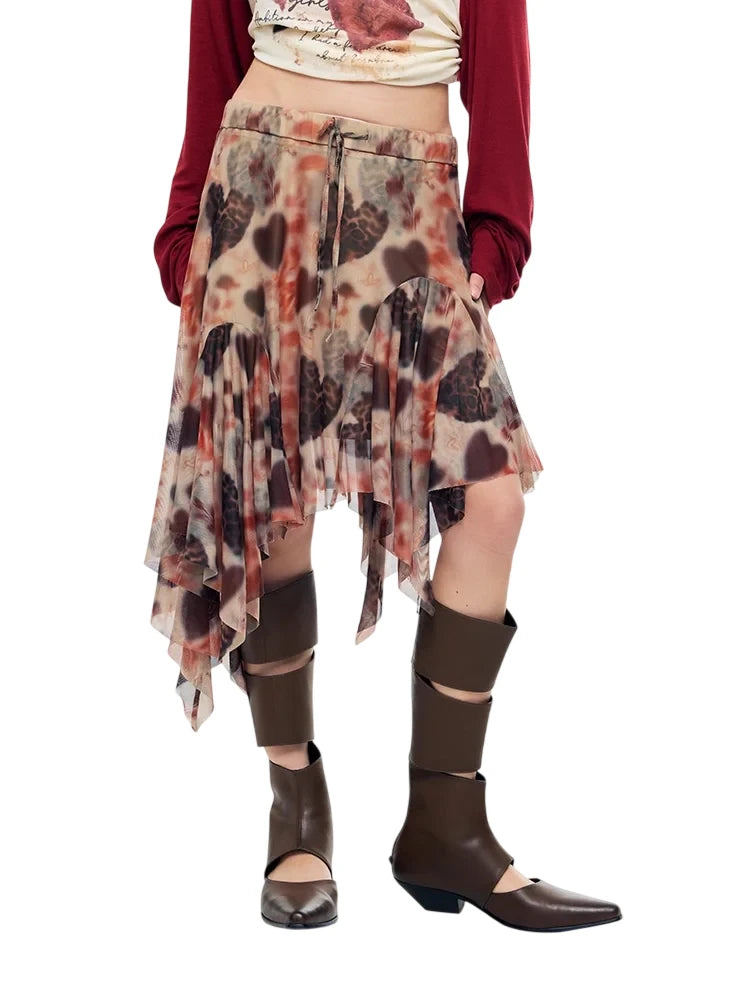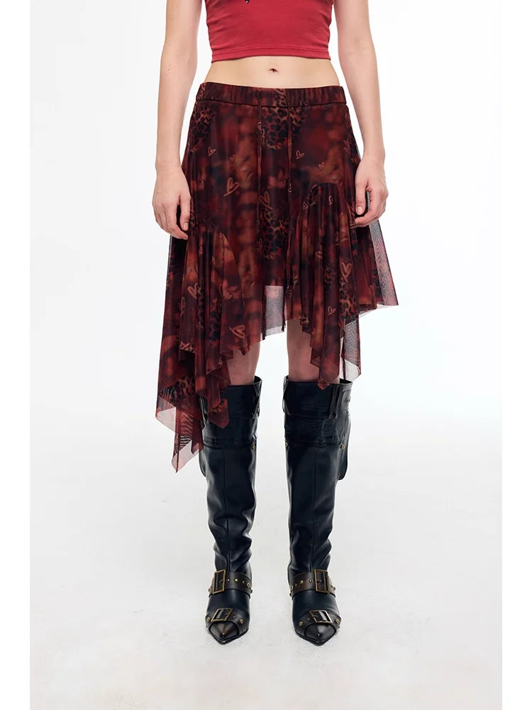 This edgy asymmetrical mesh skirt features a bold heart and leopard print design in striking red and black tones. The sheer, layered skirt offers a flame-like pattern that adds dynamic movement and streetwear flair. Worn high-waisted, it pairs effortlessly with distressed jeans or solo for a daring look. Designed for women who embrace romantic punk fashion with a casual twist.