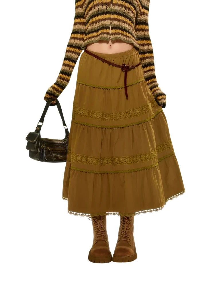 Elevate your spring wardrobe with this vintage-inspired tiered midi skirt for women. Designed with a flattering loose fit, it features elegant ruched detailing and delicate olive green lace trim that adds depth and femininity. Subtle pleats offer volume and graceful movement, while the midi length ensures versatile styling. Ideal for both casual and dressy occasions, this skirt brings together comfort and timeless charm.