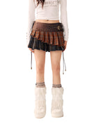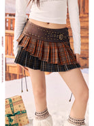 This women's mini skirt features a structured pleated design with a bold dual-tone plaid pattern in rusty orange and navy blue. Styled with a wide faux leather waistband adorned with brass-toned studs and a decorative buckle, it adds a touch of steampunk flair to your winter wardrobe. The skirt's cozy and stylish look makes it perfect for festive or seasonal outfits.