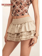 These vintage-inspired high waist shorts feature a heavily washed beige fabric with playful layered ruffle detailing. Designed for women, the elastic waistband offers comfort and a flattering fit, while the tiered frill accents add a touch of whimsy and femininity. Pair with your favorite summer tops for a trendy, cool-girl aesthetic perfect for casual wear.