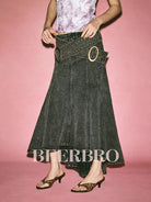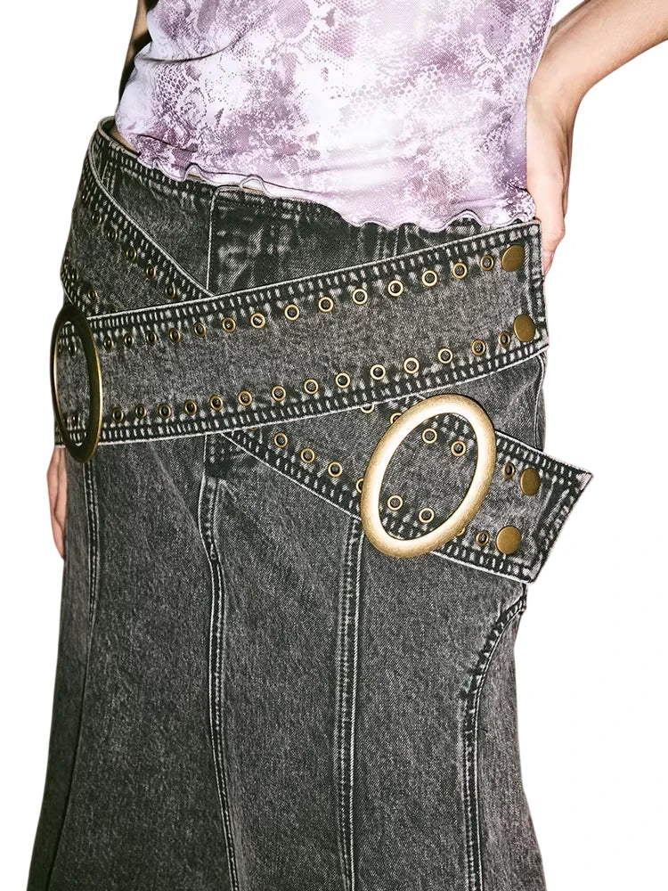 Elevate your wardrobe with this stylish women's high-waisted fishtail denim skirt. Featuring a dark washed finish and flared A-line silhouette, this long skirt is designed for comfort and a flattering fit. Decorative panel stitching adds structure and visual interest, while the statement asymmetrical belt with oversized golden rings adds a bold, modern touch. Perfect for pairing with sleeveless tops and heels for a fresh contemporary look.