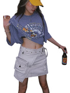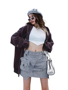 Elevate your summer style with this women's high waist mini skort, featuring an edgy asymmetrical hemline and functional cargo-style flap pockets. Designed with a bodycon fit, this mini skirt blends streetwear aesthetics with utilitarian appeal. The integrated belt with metallic eyelets adds a contemporary twist, perfect for a bold and confident look. Ideal for casual wear or a night out, this skort brings versatility and fashion-forward attitude to your wardrobe.