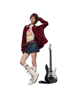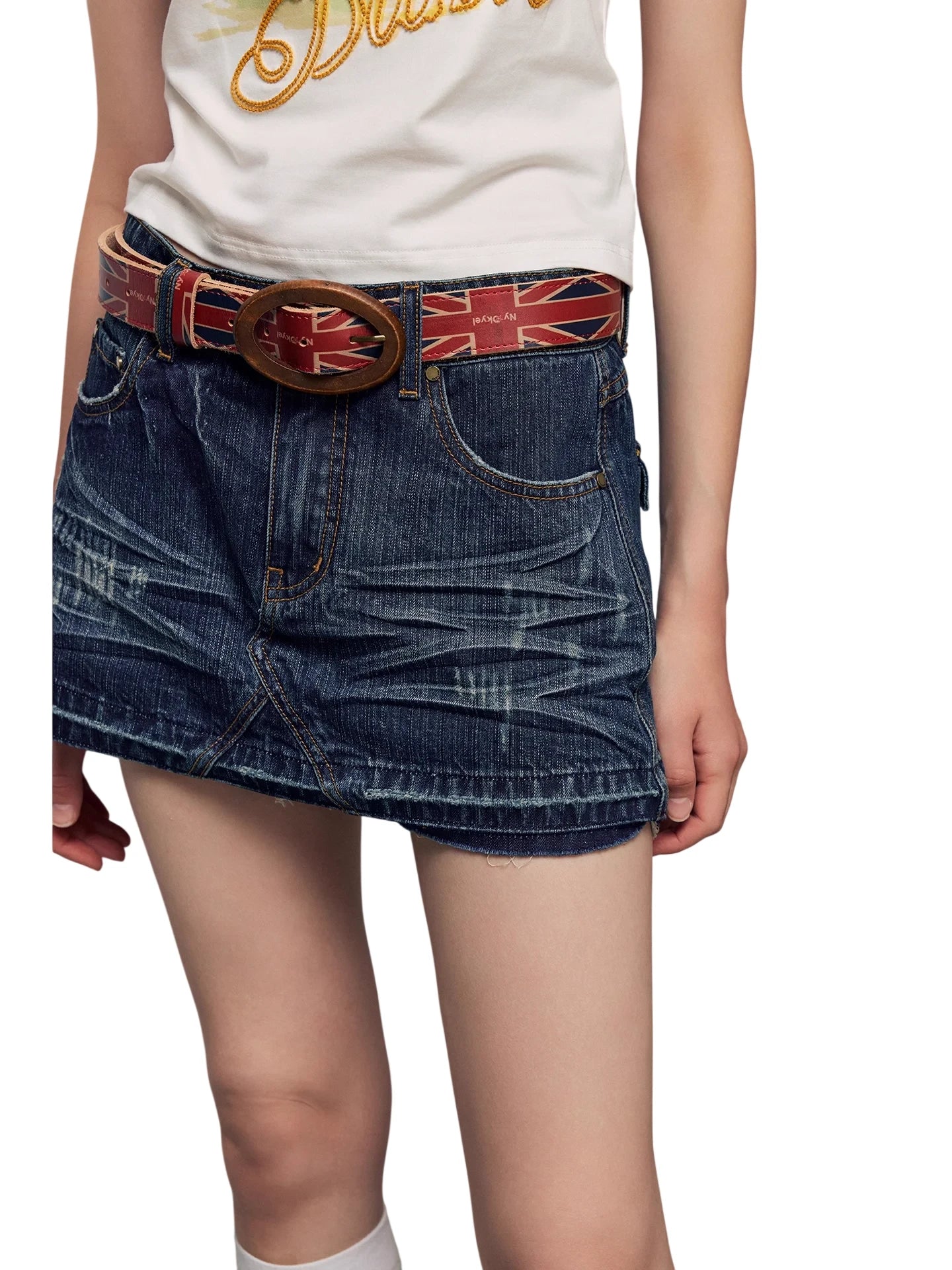 Elevate your edgy street style with this Y2K-inspired distressed denim mini skirt for women. Featuring a slim-fit H-line silhouette, prominent stitch detailing, and functional front pockets, this skirt offers a bold yet casual look. Its dark blue brushed denim is complemented by a statement belt, while the high-rise cut pairs perfectly with cropped tops. Ideal for pairing with boots or sneakers for a punk or retro-inspired outfit.