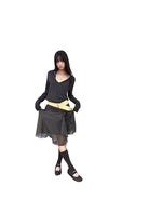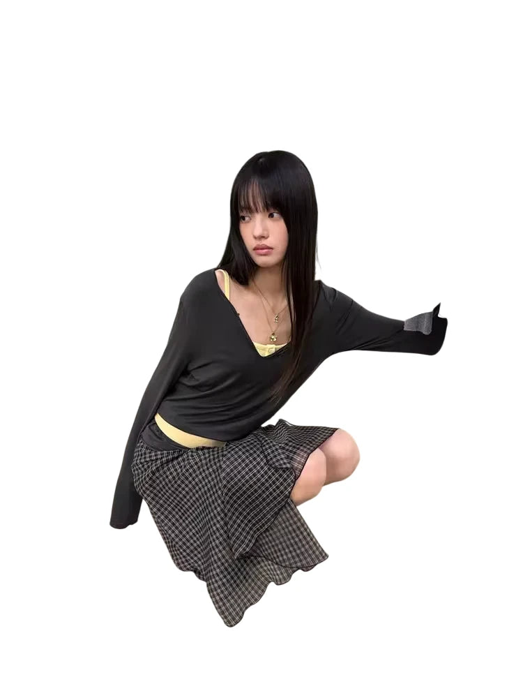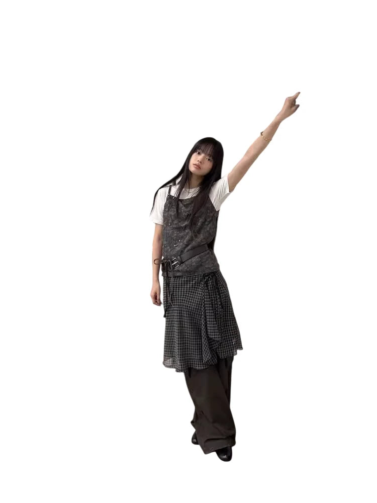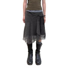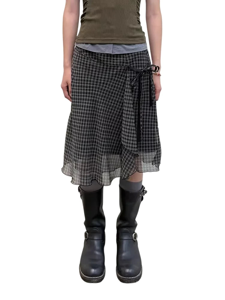 This women's wrap skirt features a classic black and white gingham plaid pattern, crafted from a lightweight, flowy fabric for effortless movement. The design includes a stylish asymmetrical hem and a feminine side-tie detail that enhances the waist. Layered for depth and dimension, this double-layer skirt brings a modern edge to a timeless silhouette, perfect for versatile, everyday styling.
