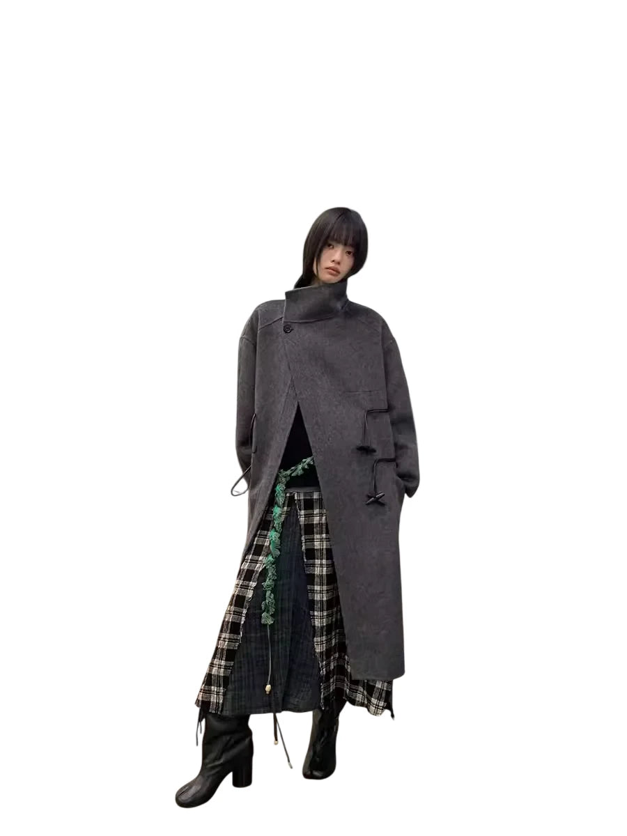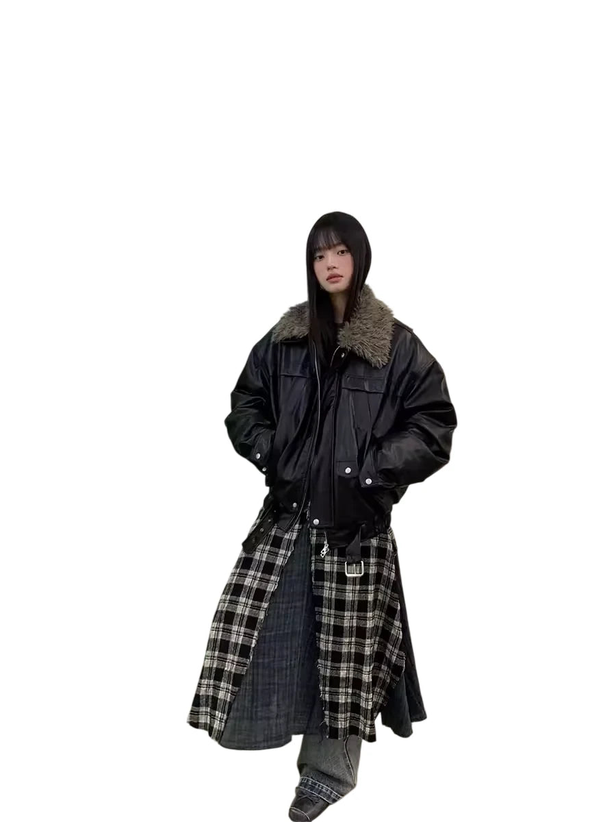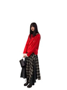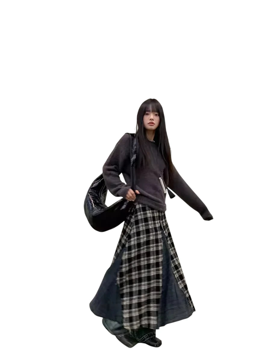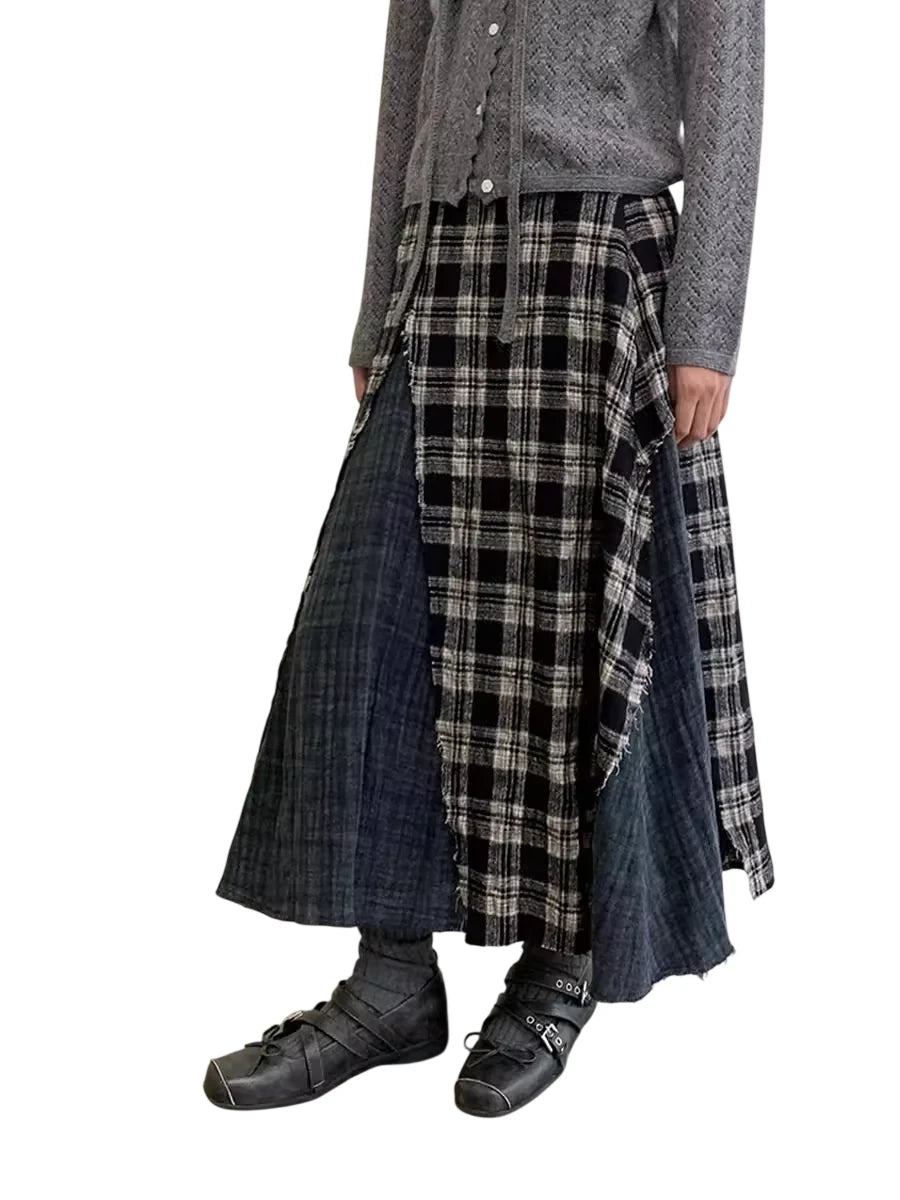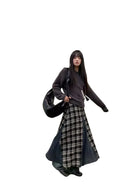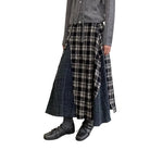 NeverSeez Wool Linen Plaid Patchwork Midi Skirt