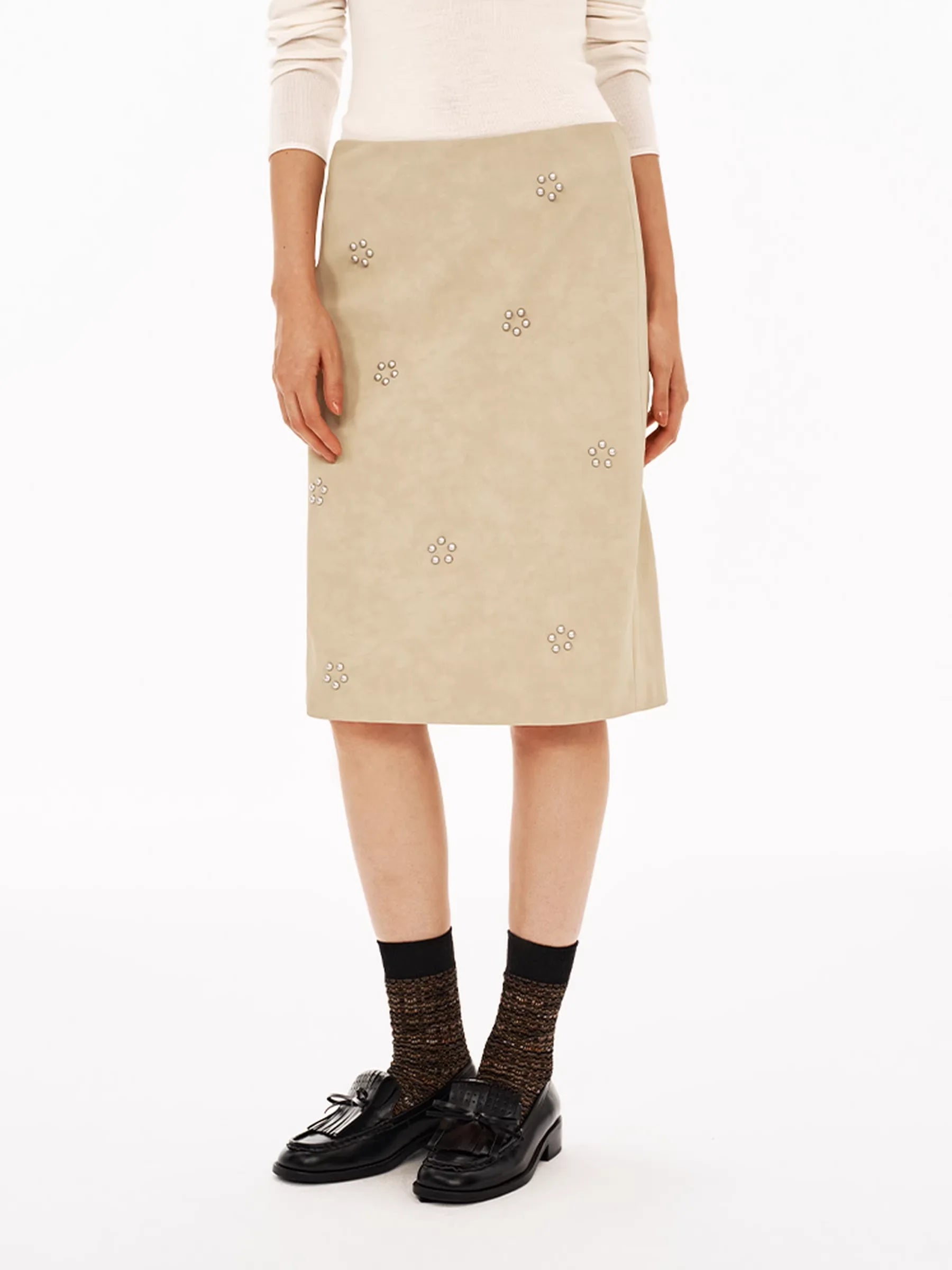 This elegant women's skirt features a classic H-line silhouette crafted from a soft, suede-like beige fabric. Designed with a mid-low waist and a flattering knee-length cut, it showcases delicate silver bead embellishments arranged in floral patterns across the front. The subtle front slit adds a touch of sophistication, making it perfect for refined, everyday styling or semi-formal occasions.