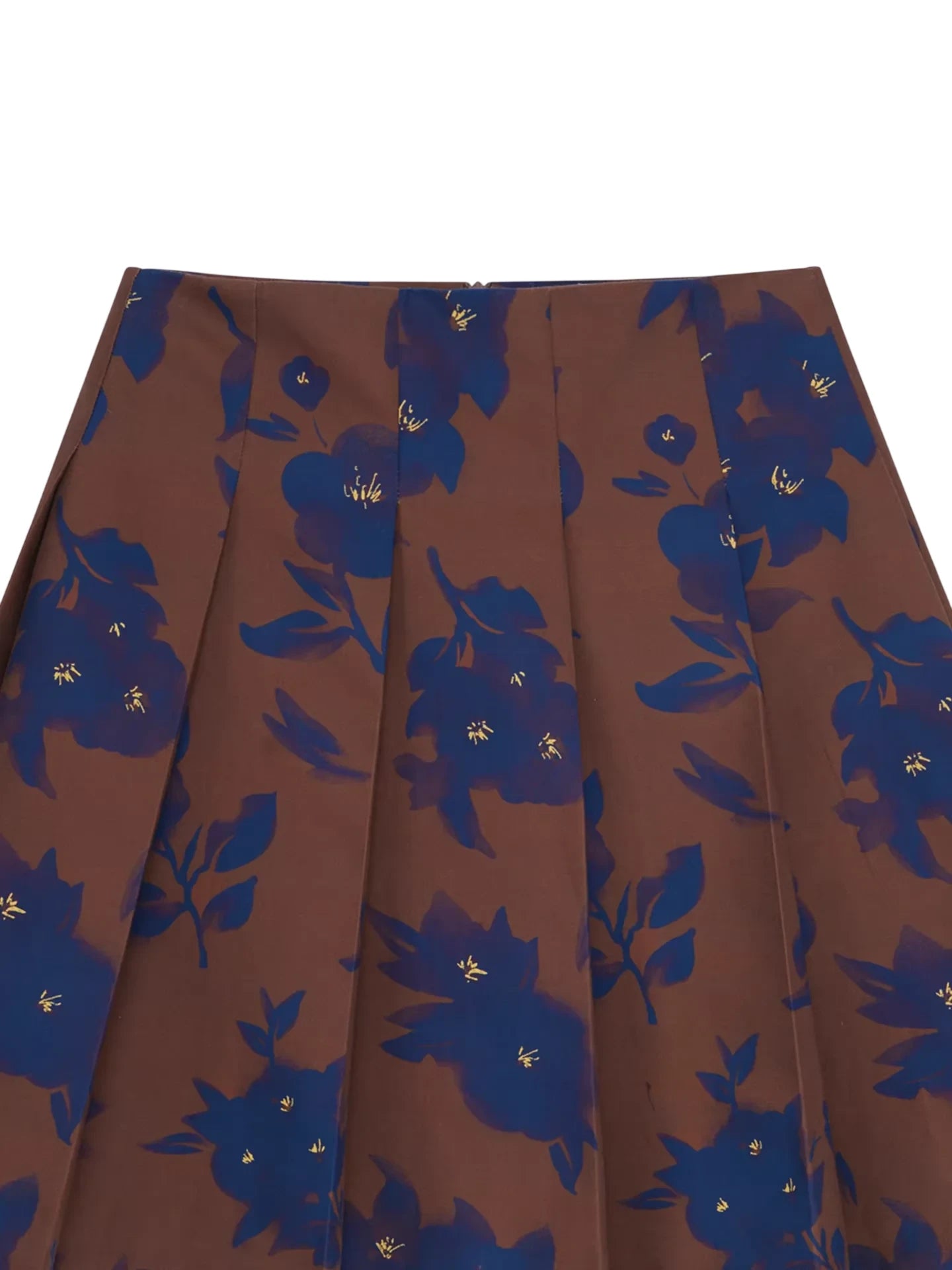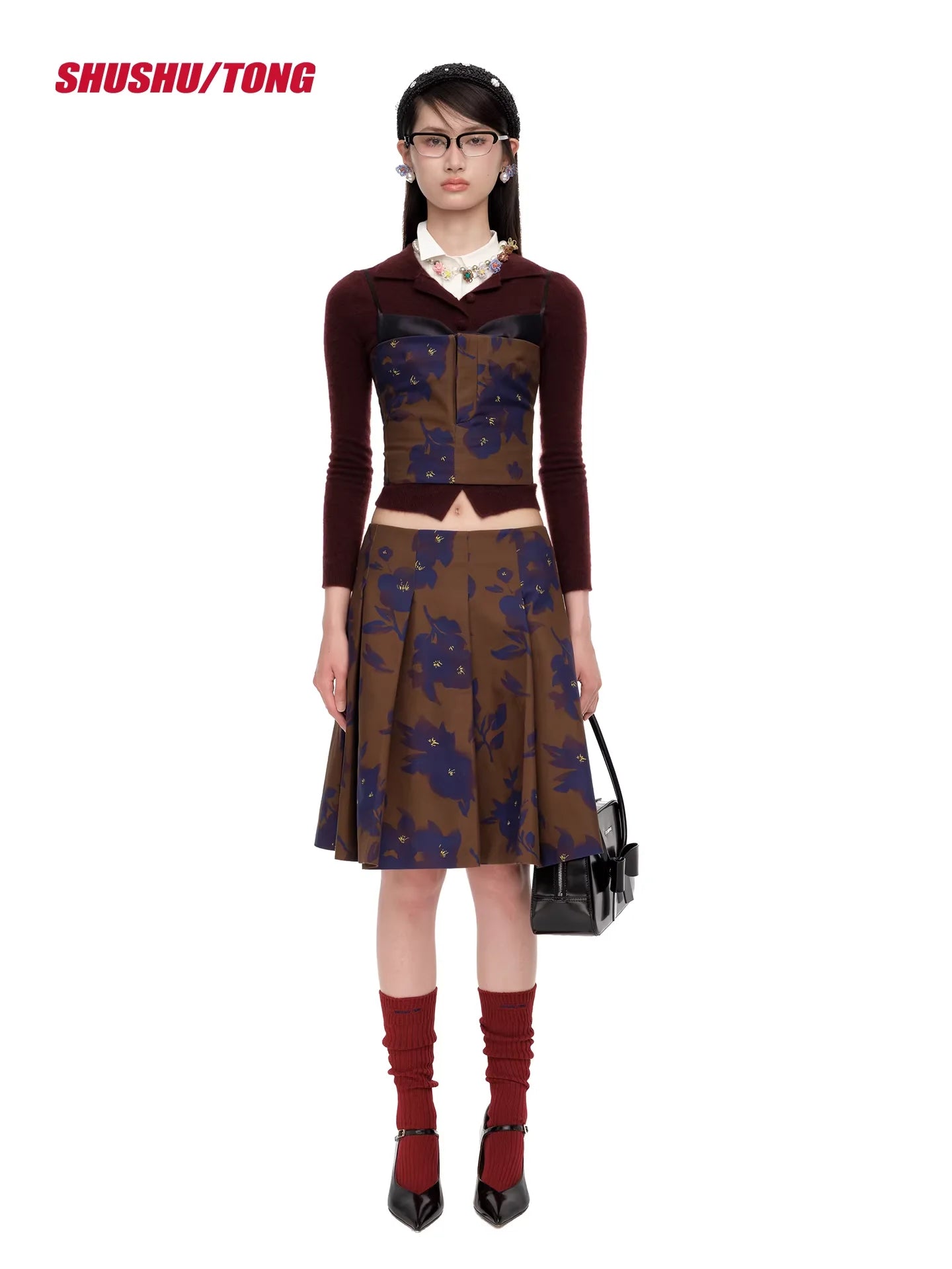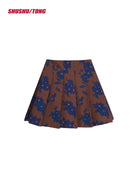 This women's winter two-piece outfit features a stylish blend of casual elegance and artistic flair. The set includes a wide pleated A-line skirt in brown, paired with a matching structured top adorned with an eye-catching dark blue abstract floral print. The top showcases an asymmetric hemline that highlights the midriff, layered over a long-sleeved maroon underlayer for added warmth and contrast. Finished with thoughtful accessories like maroon scrunched socks and black Mary Jane-style heels, this ensemble is perfect for fashion-forward winter outings.