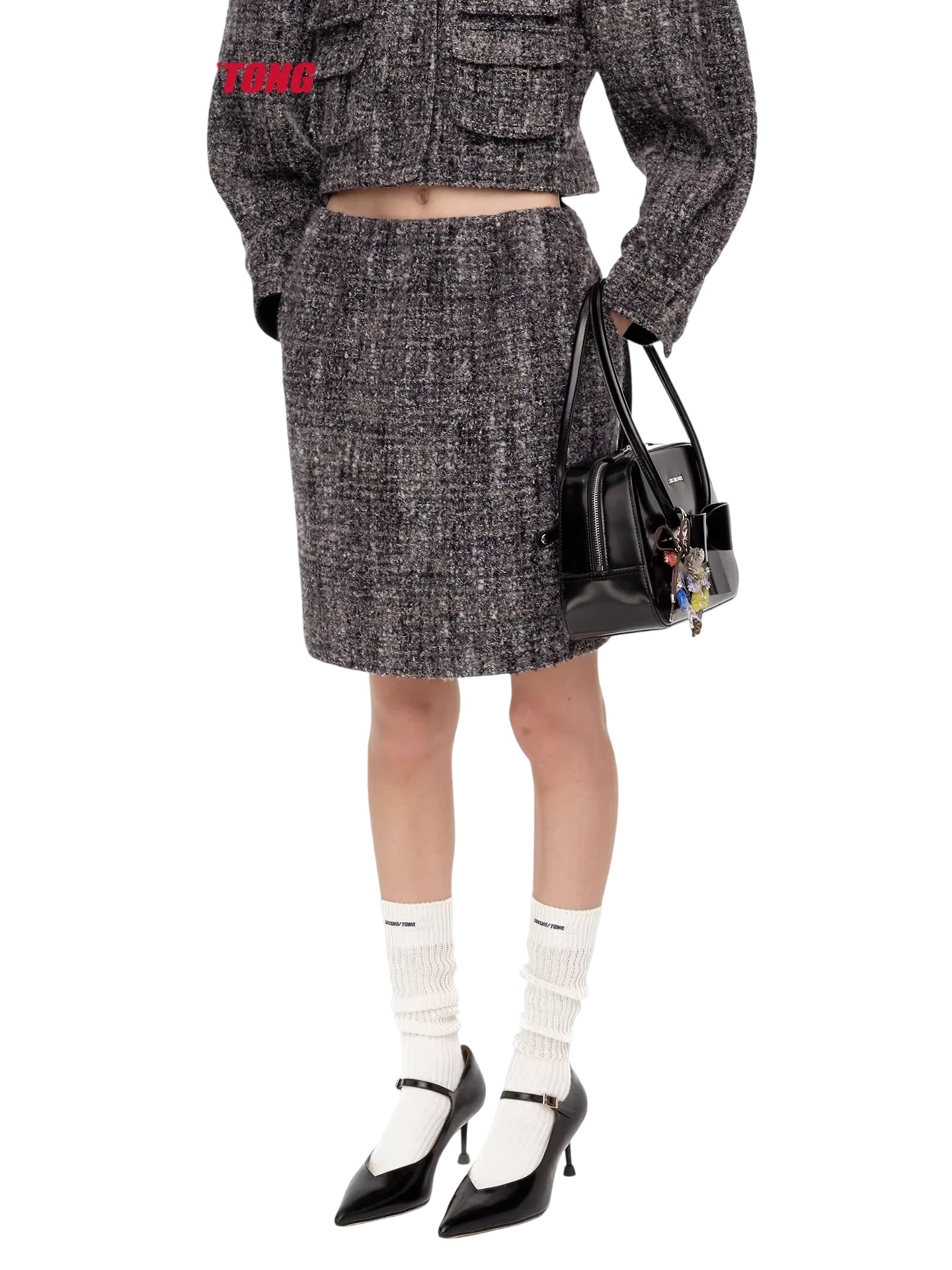 Elevate your winter wardrobe with this stylish ruched skirt designed for casual and commuter wear. Crafted from soft brown suede, it features a comfortable elastic waistband and a flattering knee-length cut. The skirt pairs seamlessly with both structured and relaxed outerwear, making it an ideal choice for versatile layering. Shown styled with a cropped jacket, ribbed socks, and heeled shoes, this women's fashion piece is a refined addition to your seasonal ensemble.