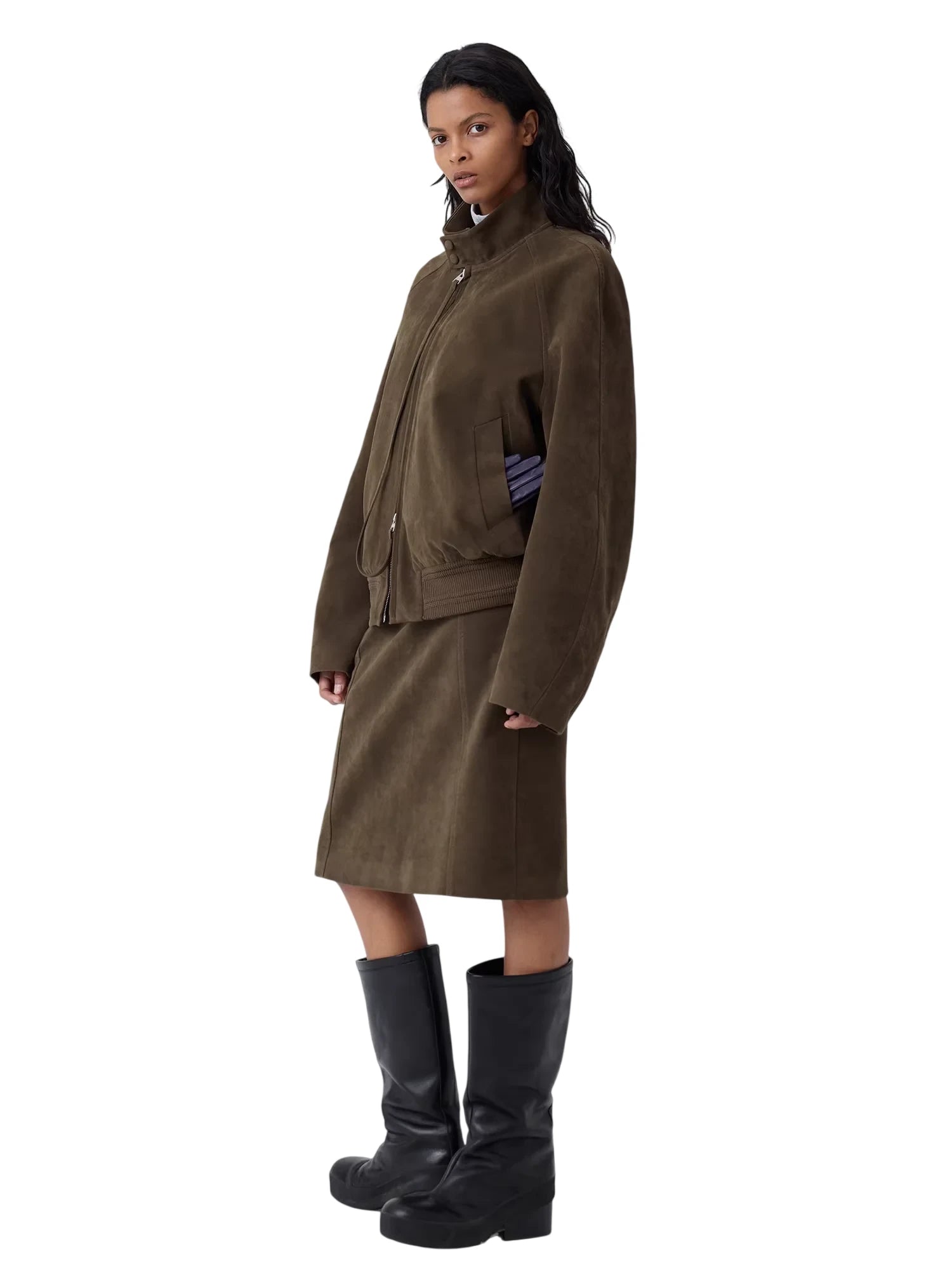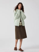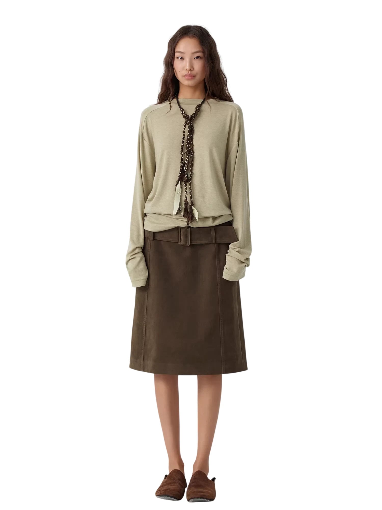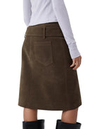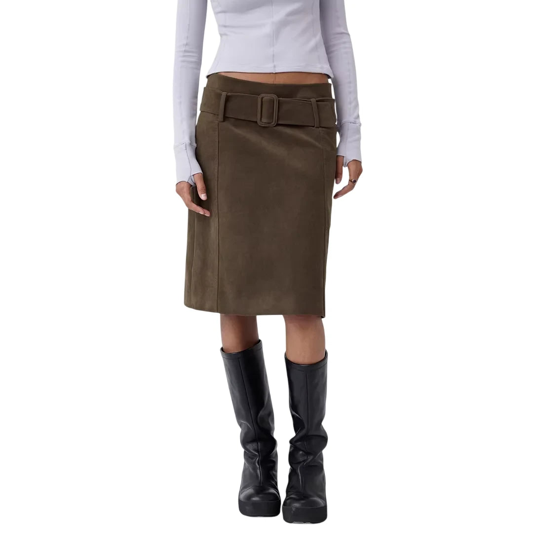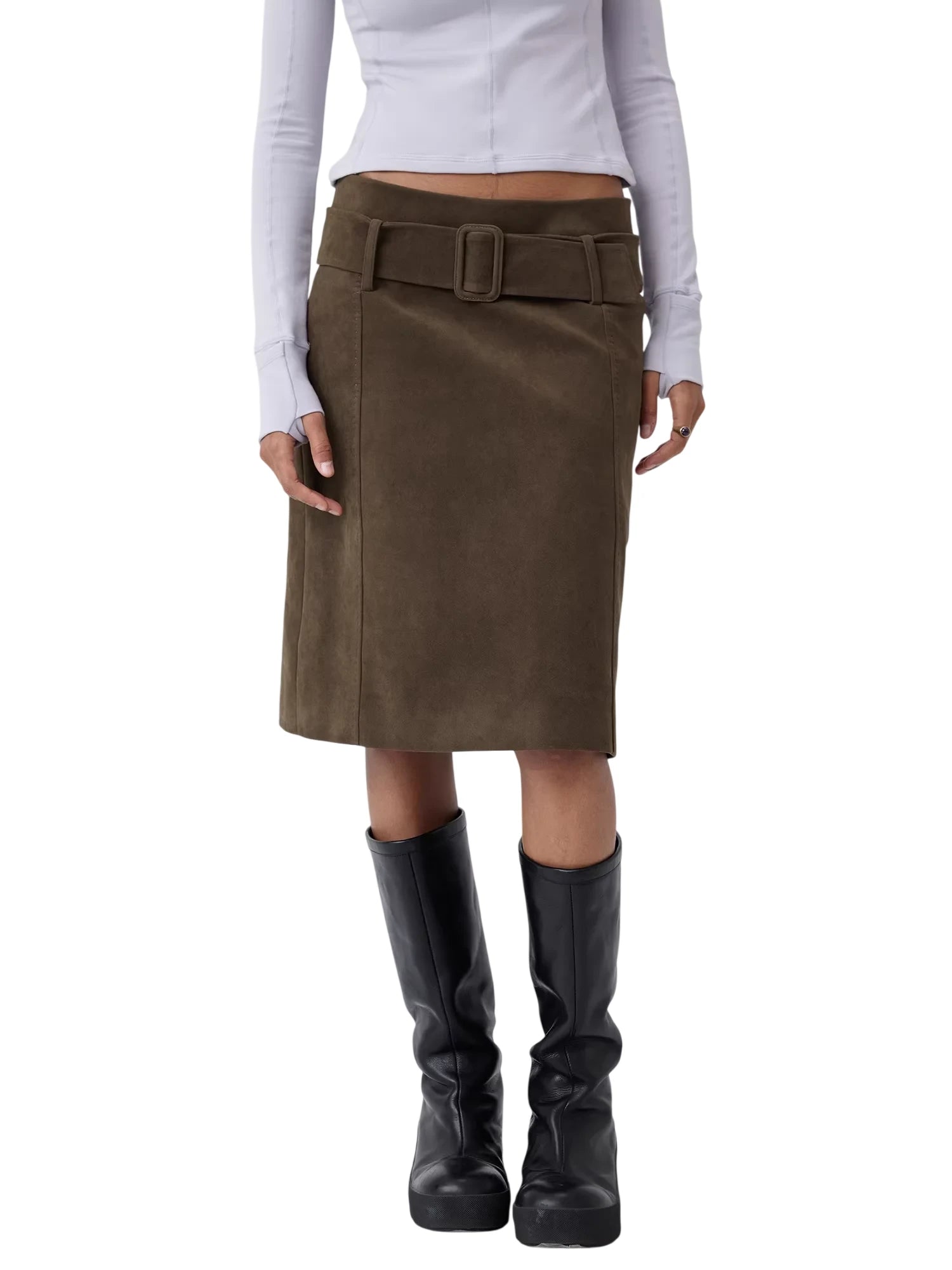 Elevate your wardrobe with this chic olive green A-line skirt, crafted from soft suedette fabric for a refined texture. Designed with a structured silhouette, it features a front panel seam and a wide matching belt with a rectangular buckle that cinches the waist for a flattering fit. Perfect for versatile styling, this knee-length skirt is ideal for creating polished looks. Modeled here by a woman, it pairs effortlessly with fitted tops and boots for a sleek ensemble.