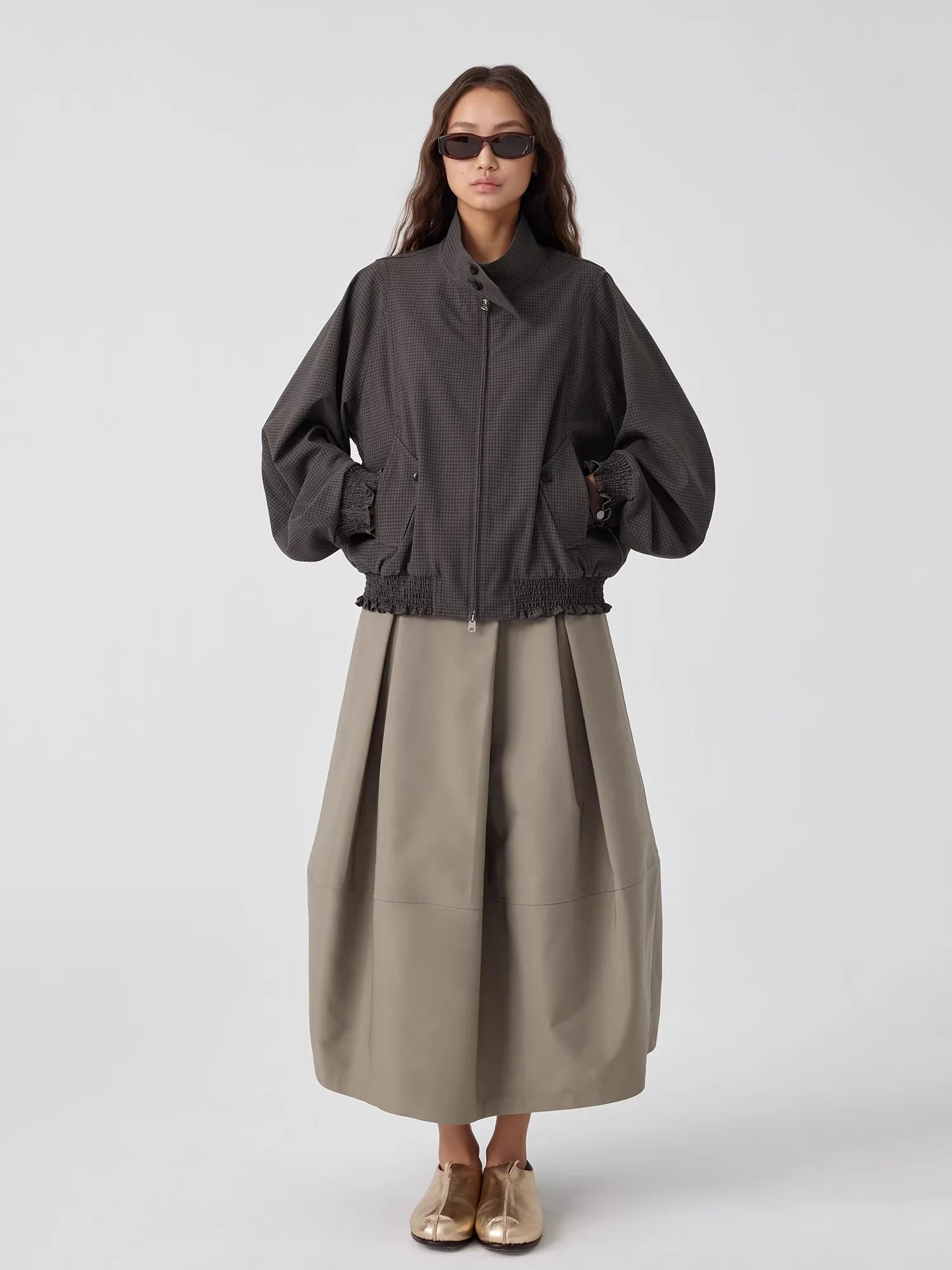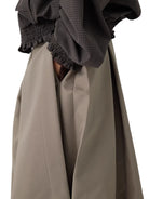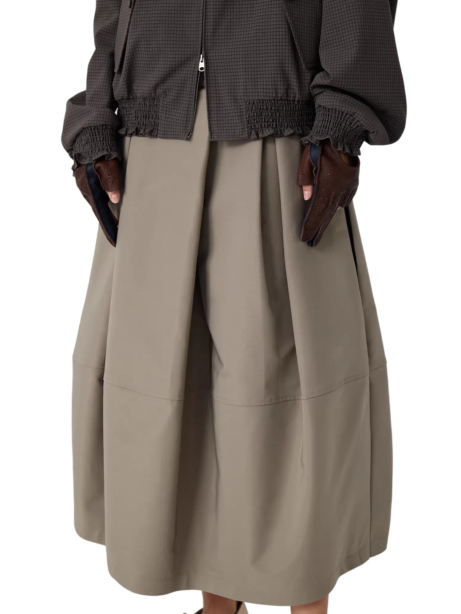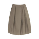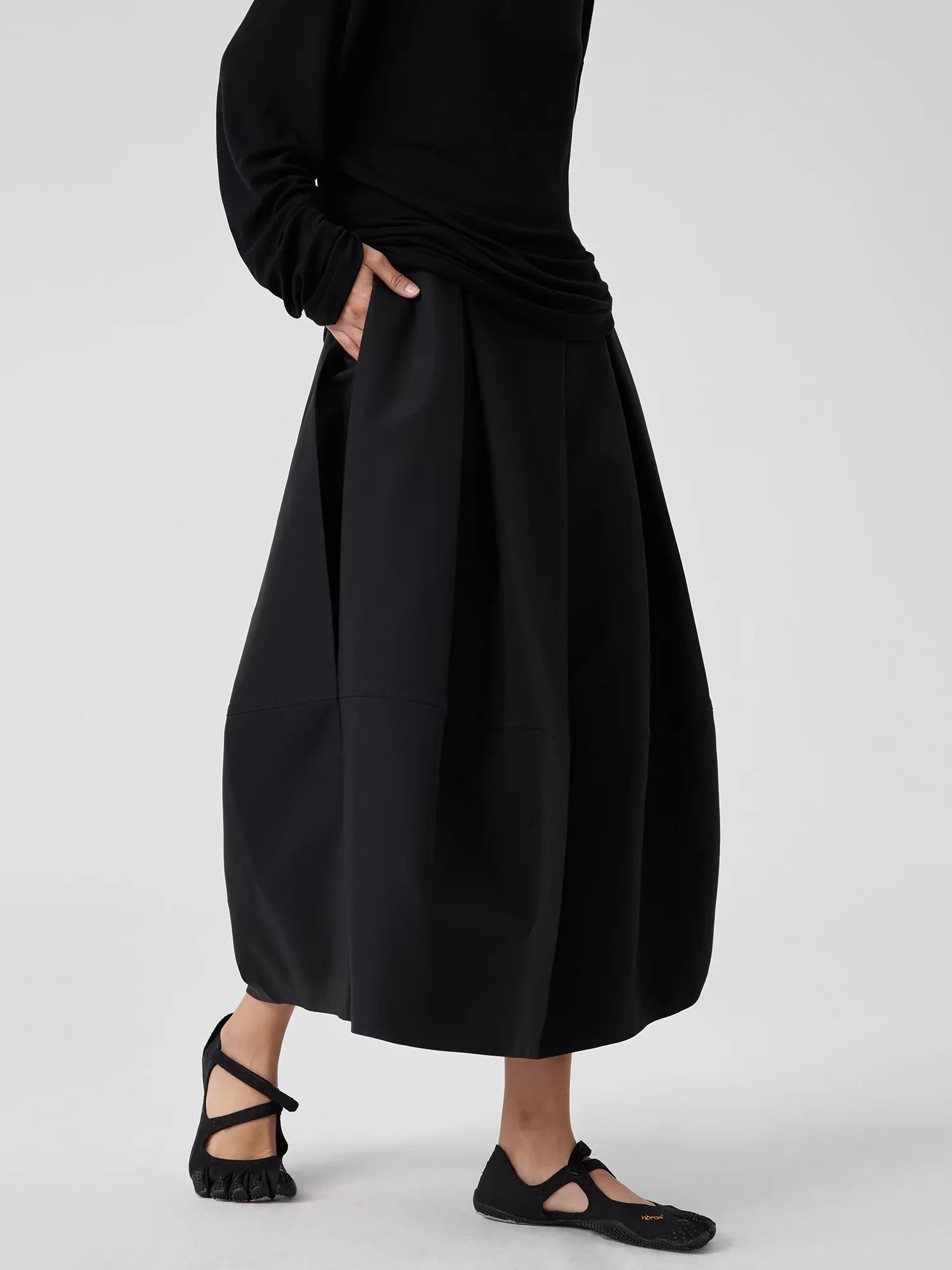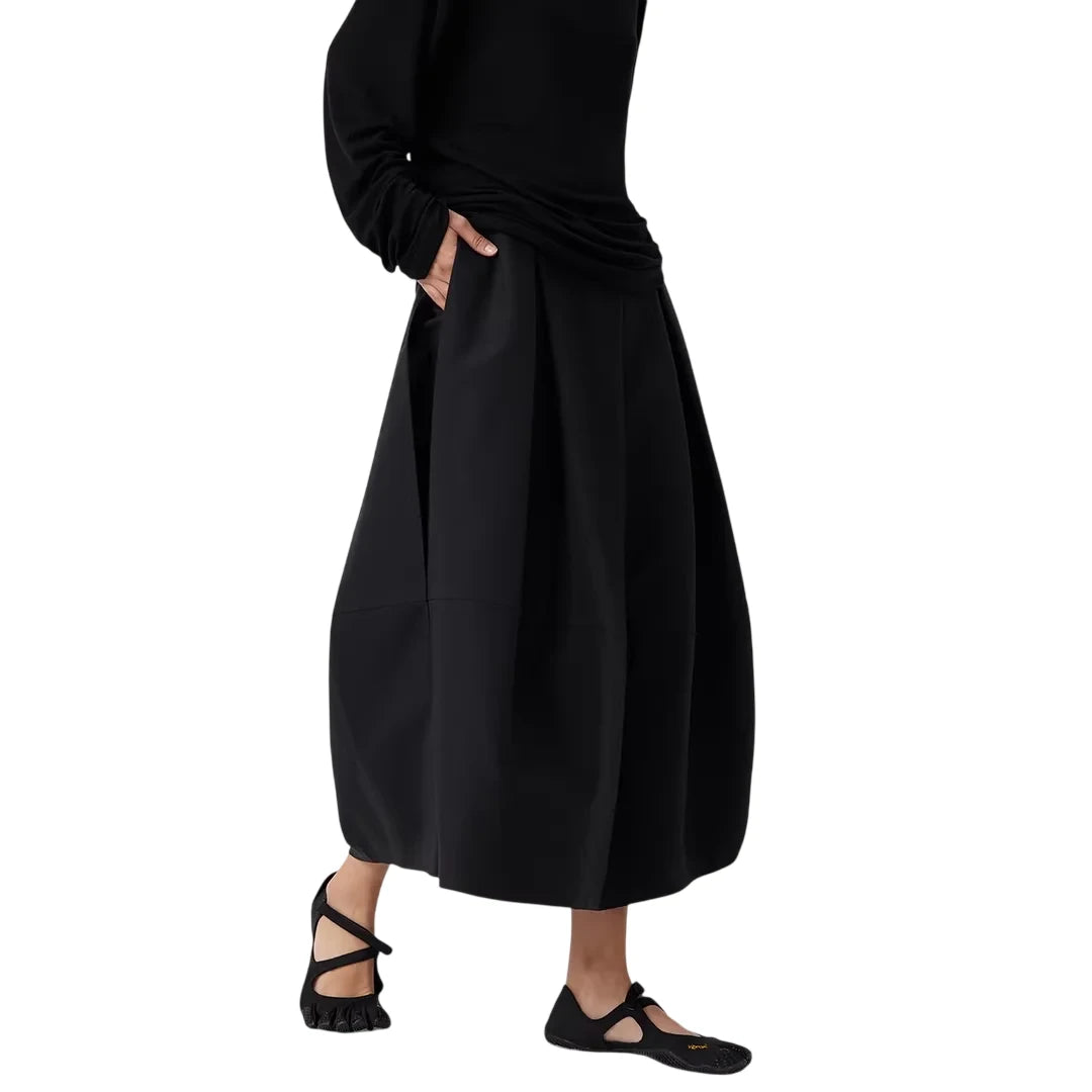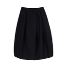This women's structured black midi skirt features a voluminous, balloon-like silhouette with wide pleats that create a tulip-inspired shape. Designed with a thick, architectural fabric, it offers both style and structure. Functional side pockets add practicality to its fashion-forward design. Paired with a monochromatic black ensemble, this skirt is ideal for bold, modern styling.