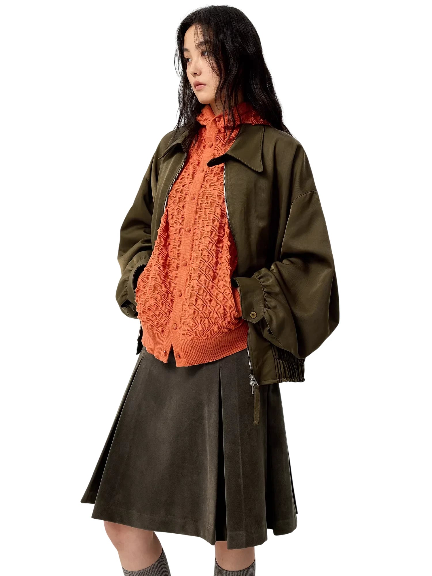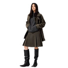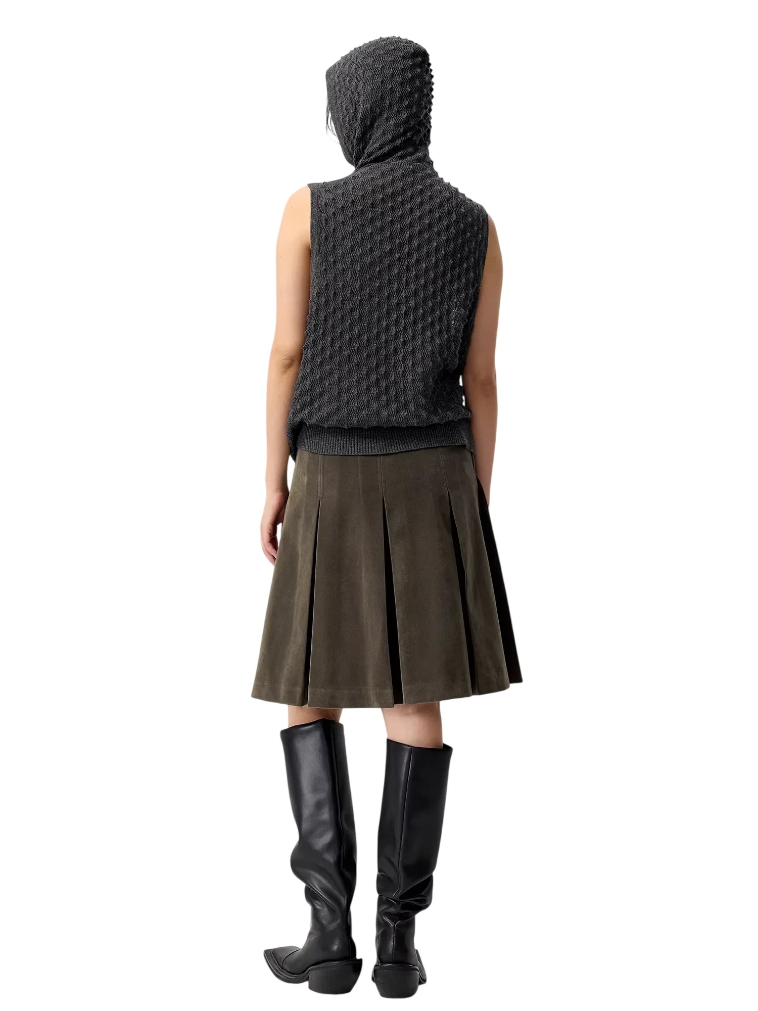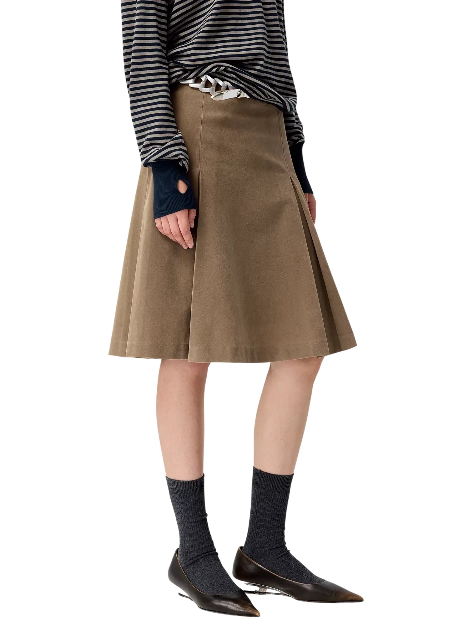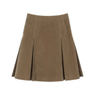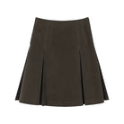 Elevate your fall and winter wardrobe with this stylish suede pleated A-line skirt. Designed for a flattering silhouette, this dark olive green skirt offers both texture and structure, ideal for modern, season-ready looks. As seen on a female model, it pairs effortlessly with coordinating layers and tall boots for a sophisticated and cohesive outfit. Perfect for those seeking a blend of utilitarian charm and contemporary fashion.