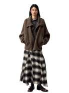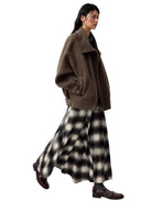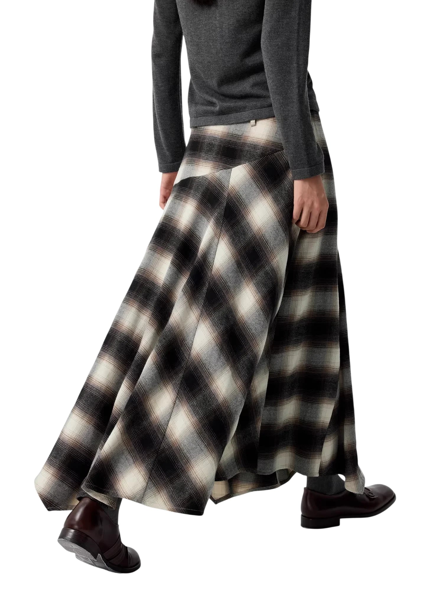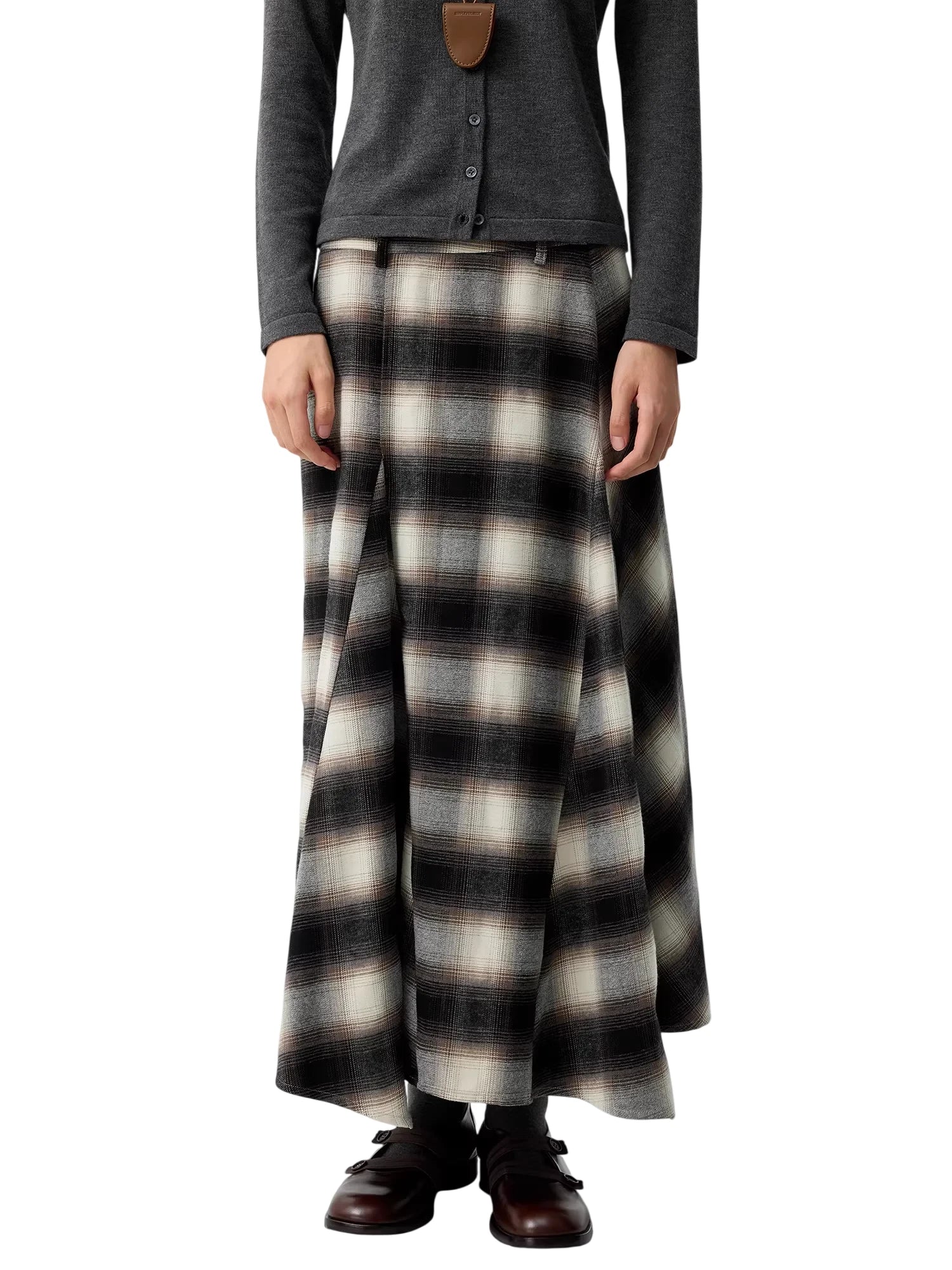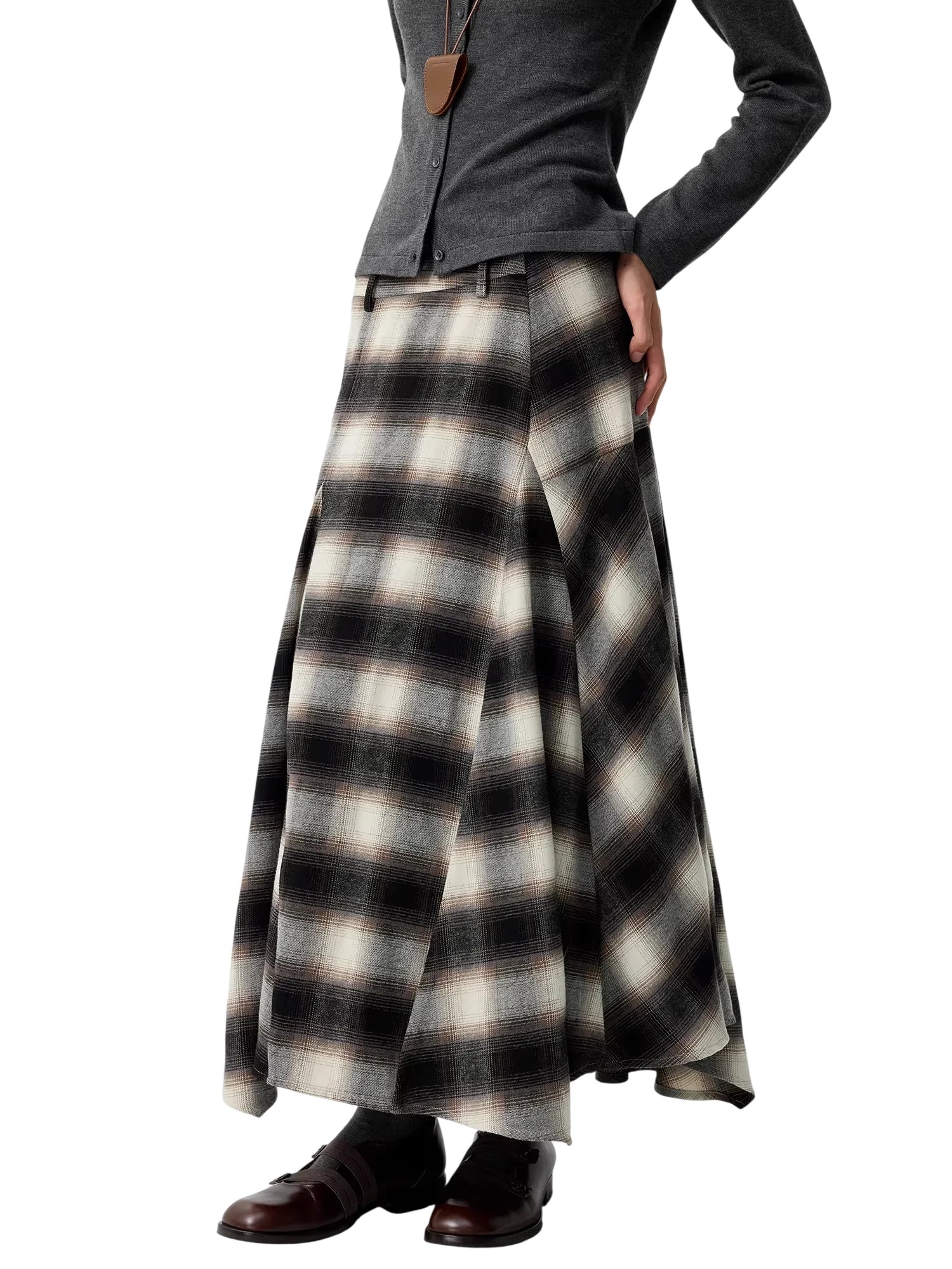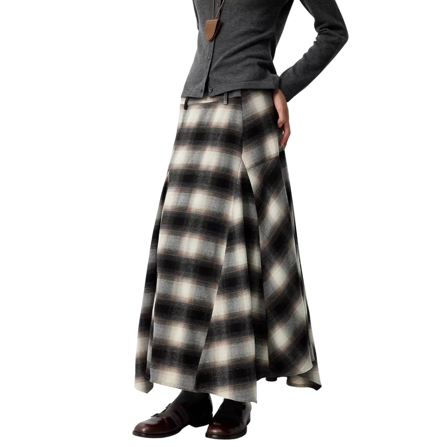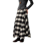 Elevate your wardrobe with this elegant women's plaid A-line maxi skirt. Featuring a high waist and wide pleats, this skirt offers a flattering silhouette with graceful volume and flow. The classic muted plaid pattern in shades of black, gray, and white adds timeless charm, making it perfect for both casual and dressed-up occasions. Styled for comfort and sophistication, it's an ideal piece for any season.