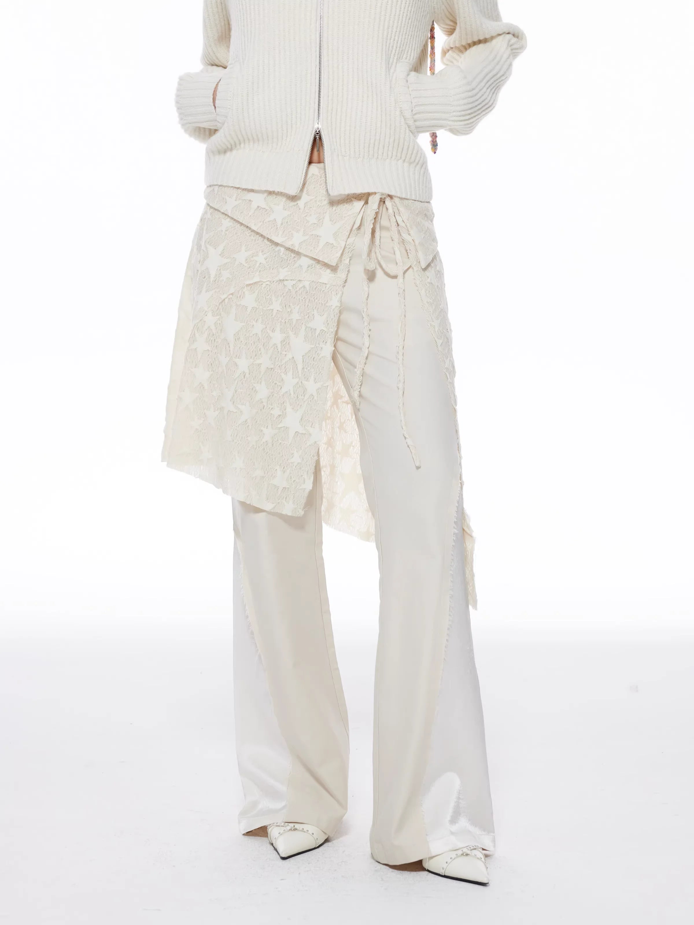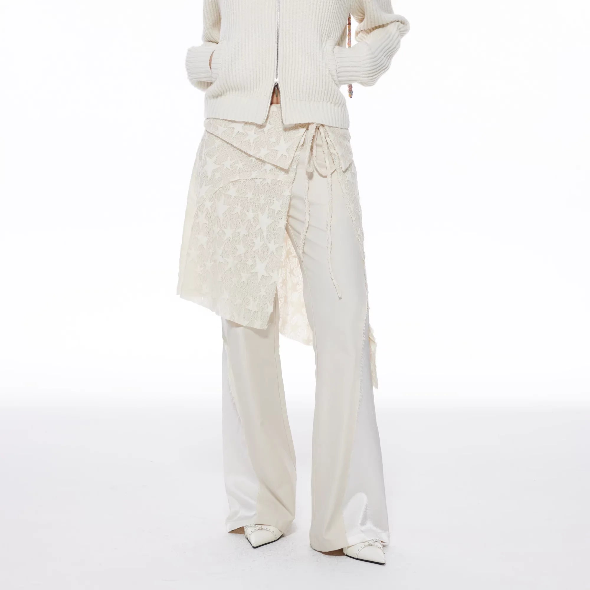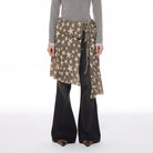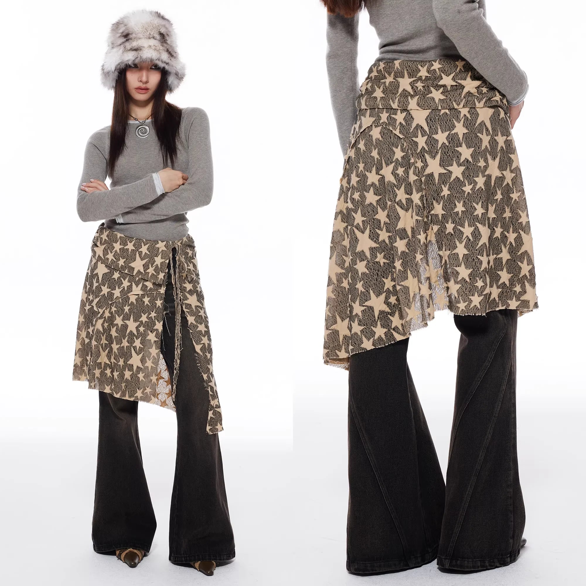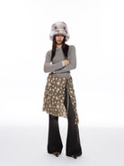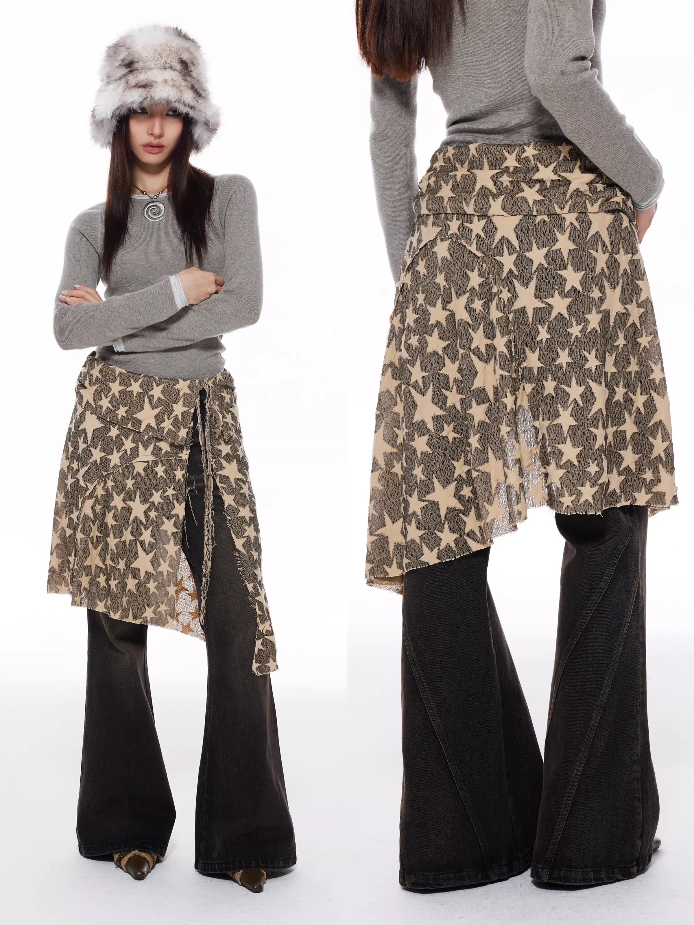 This women's layered tie apron skirt showcases a unique asymmetrical design, combining beige and black panels embellished with a bold star print. Styled over black flared pants with distinct seam accents, the look adds depth and visual intrigue. Paired with a light grey long-sleeve top, spiral statement necklace, and a cozy faux fur hat, the outfit exudes a casual yet edgy winter vibe with a touch of bohemian elegance.