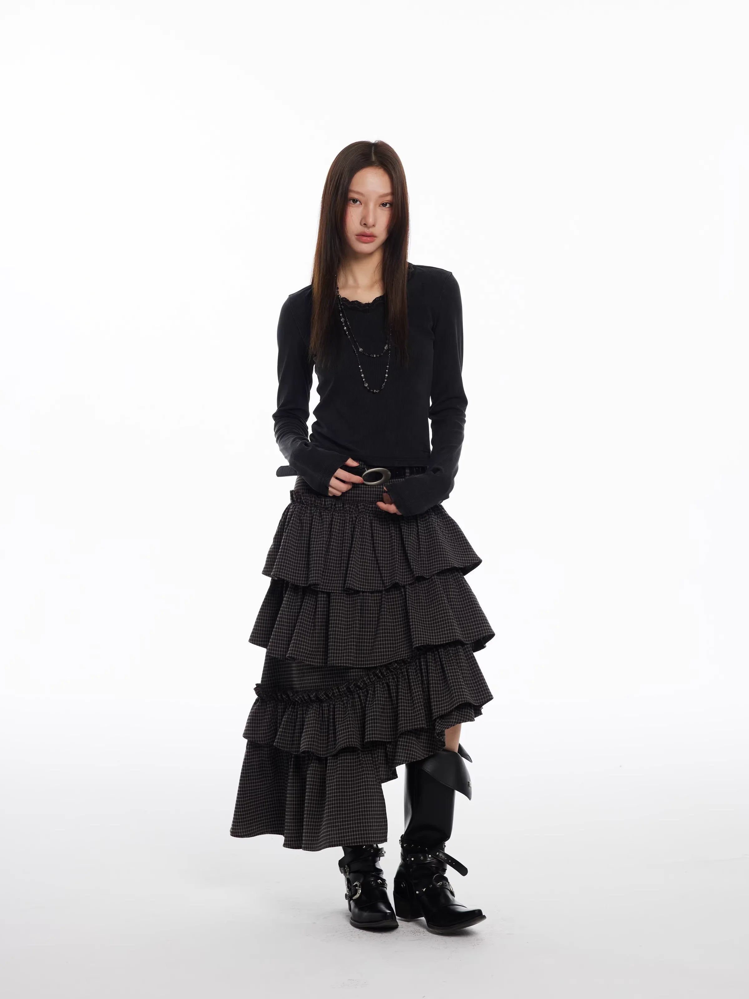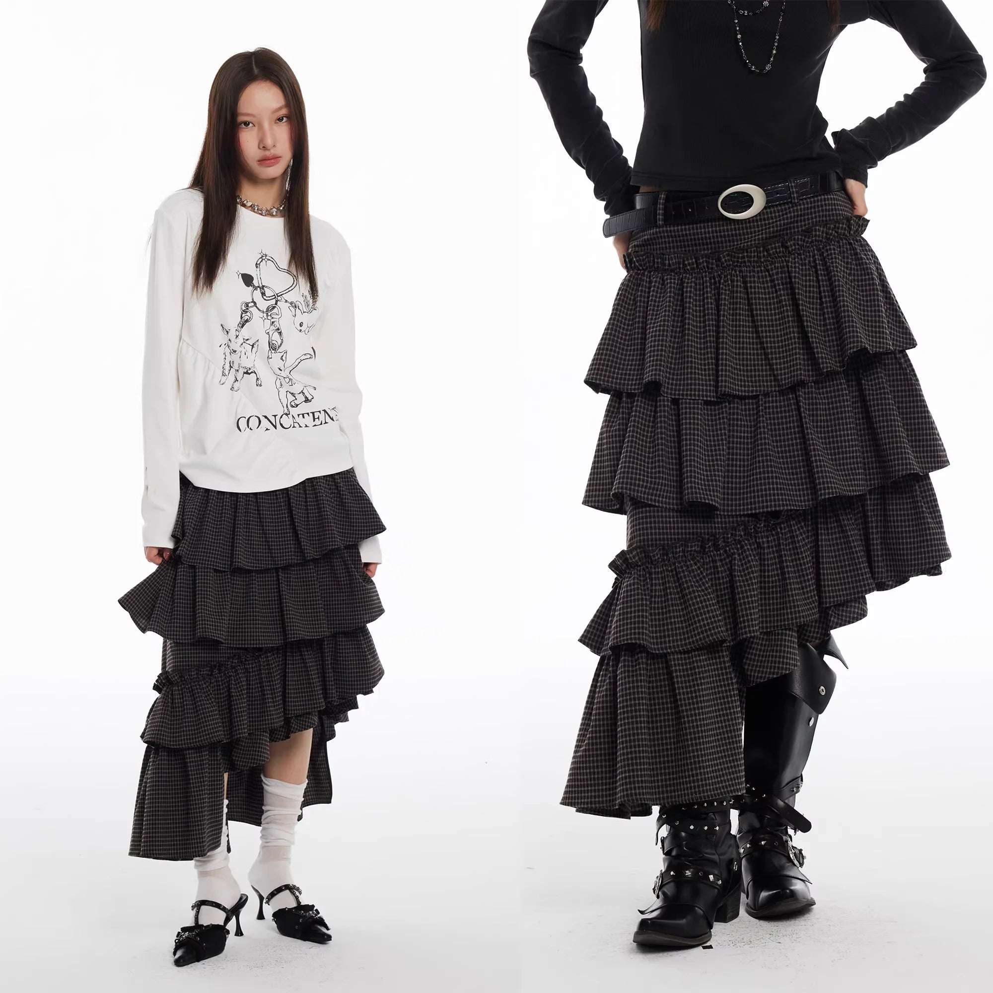 THELIGHT OFFICIAL Retro Plaid High-Low Layered Ruffle Skirt