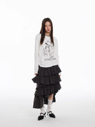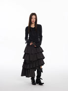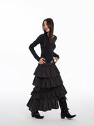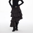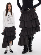 Elevate your wardrobe with this retro-inspired plaid skirt, designed exclusively for women. Featuring a high-low hemline and tiered ruffle layers, this skirt offers a voluminous silhouette and a distinct asymmetrical cut. The dark checkered pattern lends a vintage flair, while the layered construction adds depth and texture. Style it casually with a graphic top and heels or go for a bolder look with a black belt and combat boots.