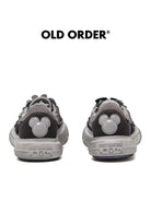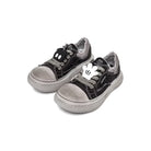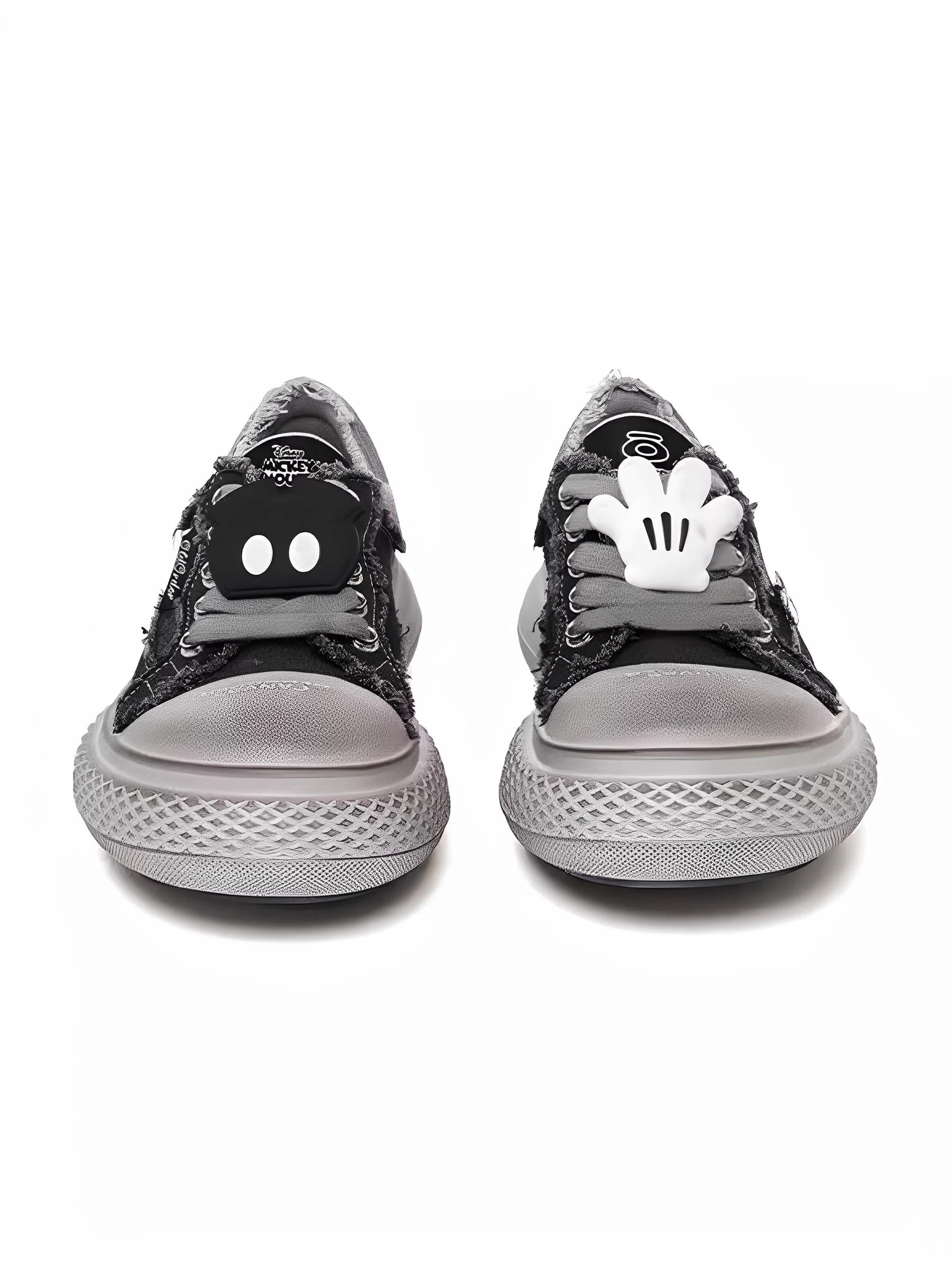 These children's platform sneakers feature a playful Mickey Mouse design on a classic black canvas base. The round-toe shoes include unique lace decorations in the shape of Mickey's glove and buttons for a whimsical touch. A contrasting light gray toe with embossed detailing offers added style, while the rugged outsole ensures reliable grip. Fleece-like inner lining provides comfort and warmth, making these sneakers perfect for everyday wear.