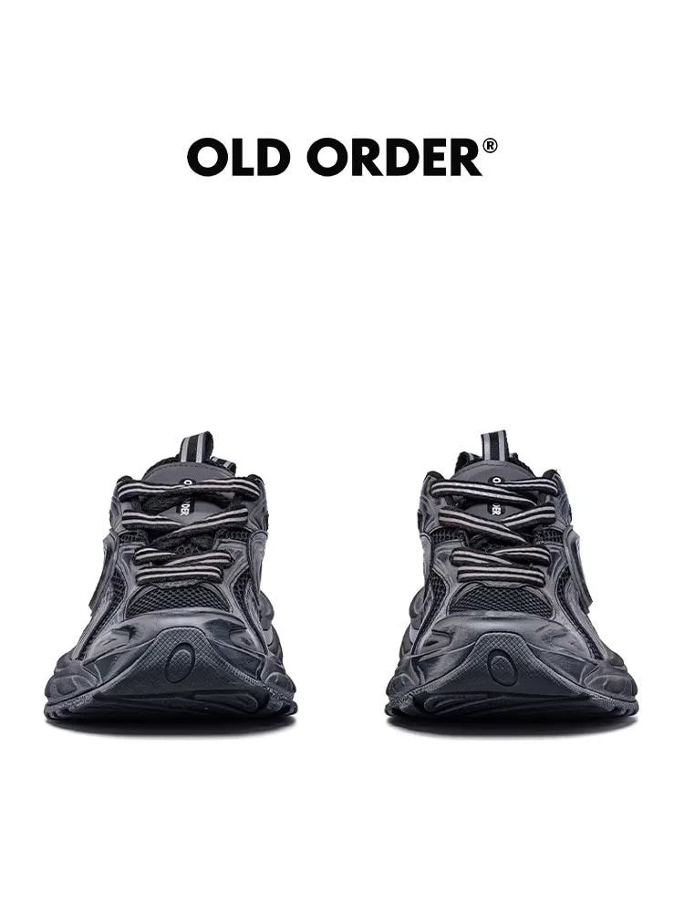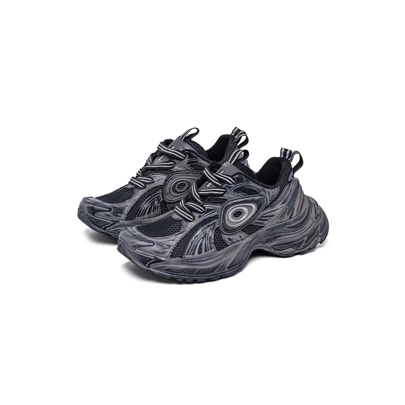 Step into comfort and bold design with these distressed black platform dad sneakers. Featuring a unisex fit, these high-performance sneakers combine breathable mesh uppers with synthetic overlays for structure and support. The thick, textured sole enhances stability, while the futuristic design brings a modern edge to any outfit. Ideal for everyday wear or athletic use.