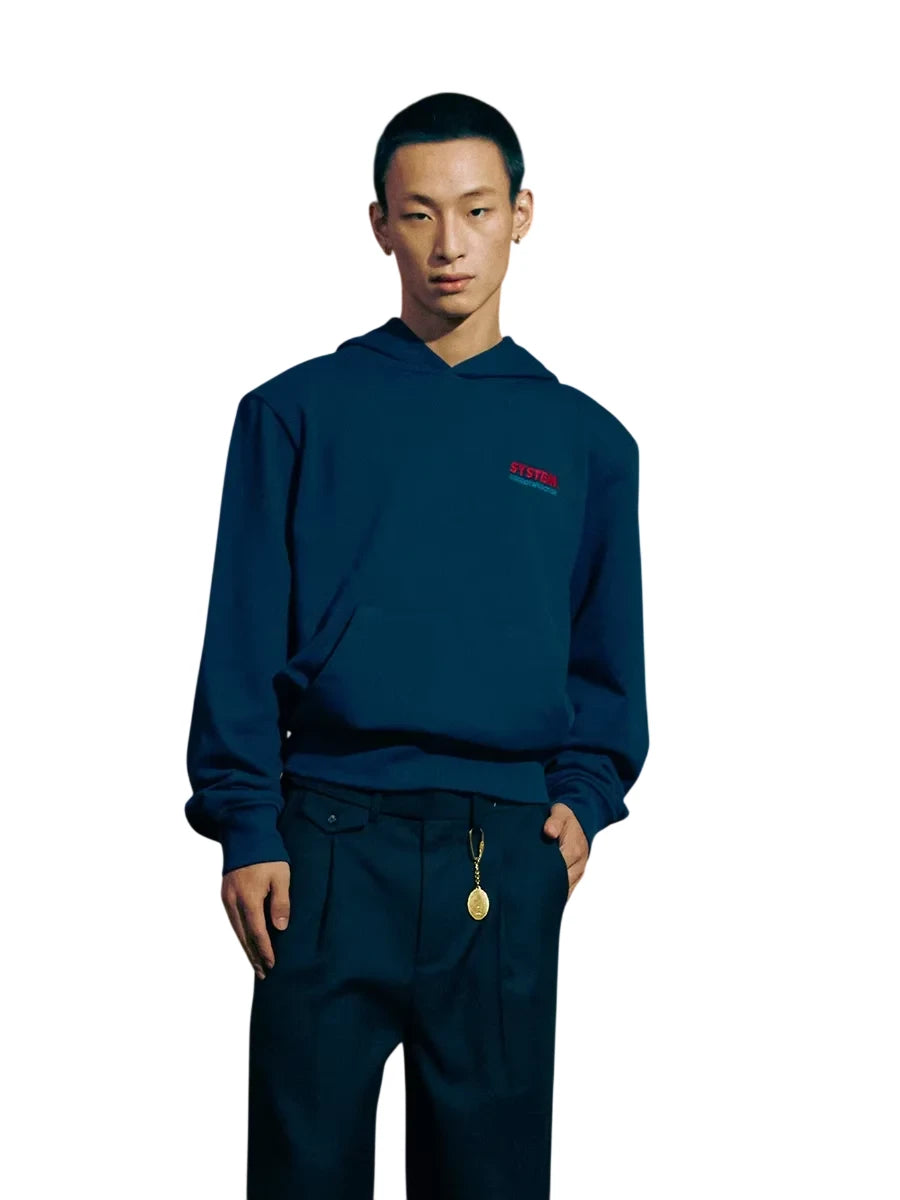 This men's oversized hoodie in dark blue offers a structured silhouette with padded shoulders for added definition. Featuring a relaxed fit and a hooded design, it includes subtle embroidered detailing and the word 'SYSTEM' printed in bold red text on the chest. Ideal for a modern, stylish look.