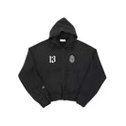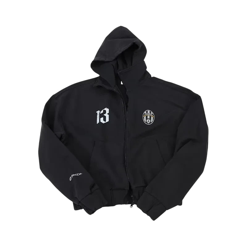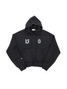 This men's hoodie features a stylish washed gray finish with a layered design and a sporty, cropped fit. It includes a full front zipper and elasticated cuffs and waistband for a snug, comfortable feel. Bold white graphics, including the number '13' and a circular emblem on the chest, add a distinctive athletic touch. The sleeve is detailed with 'Sportcom' branding, reinforcing the casual, teamwear-inspired look. Ideal for everyday wear or sporty styling.