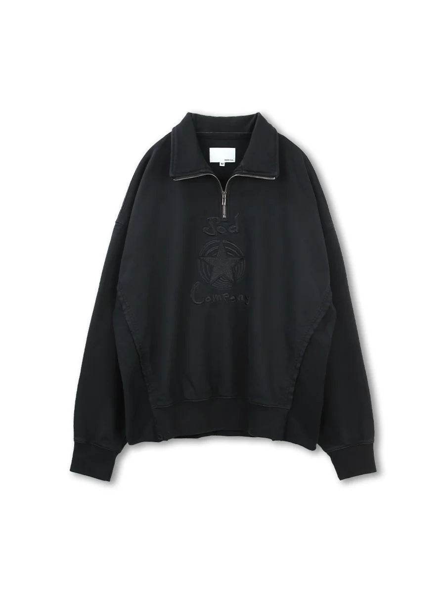 Elevate your casual wardrobe with this men's black oversized quarter-zip sweatshirt. Crafted from heavyweight cotton for a structured yet comfortable fit, this pullover features a high collar with a chest-length zipper, ribbed cuffs and hem, and a vintage washed finish. A tonal embroidered graphic—featuring a star circled by the words 'God Company'—adds a unique touch to the front. Perfect for streetwear or relaxed everyday wear.