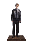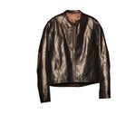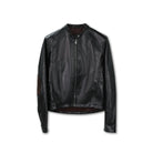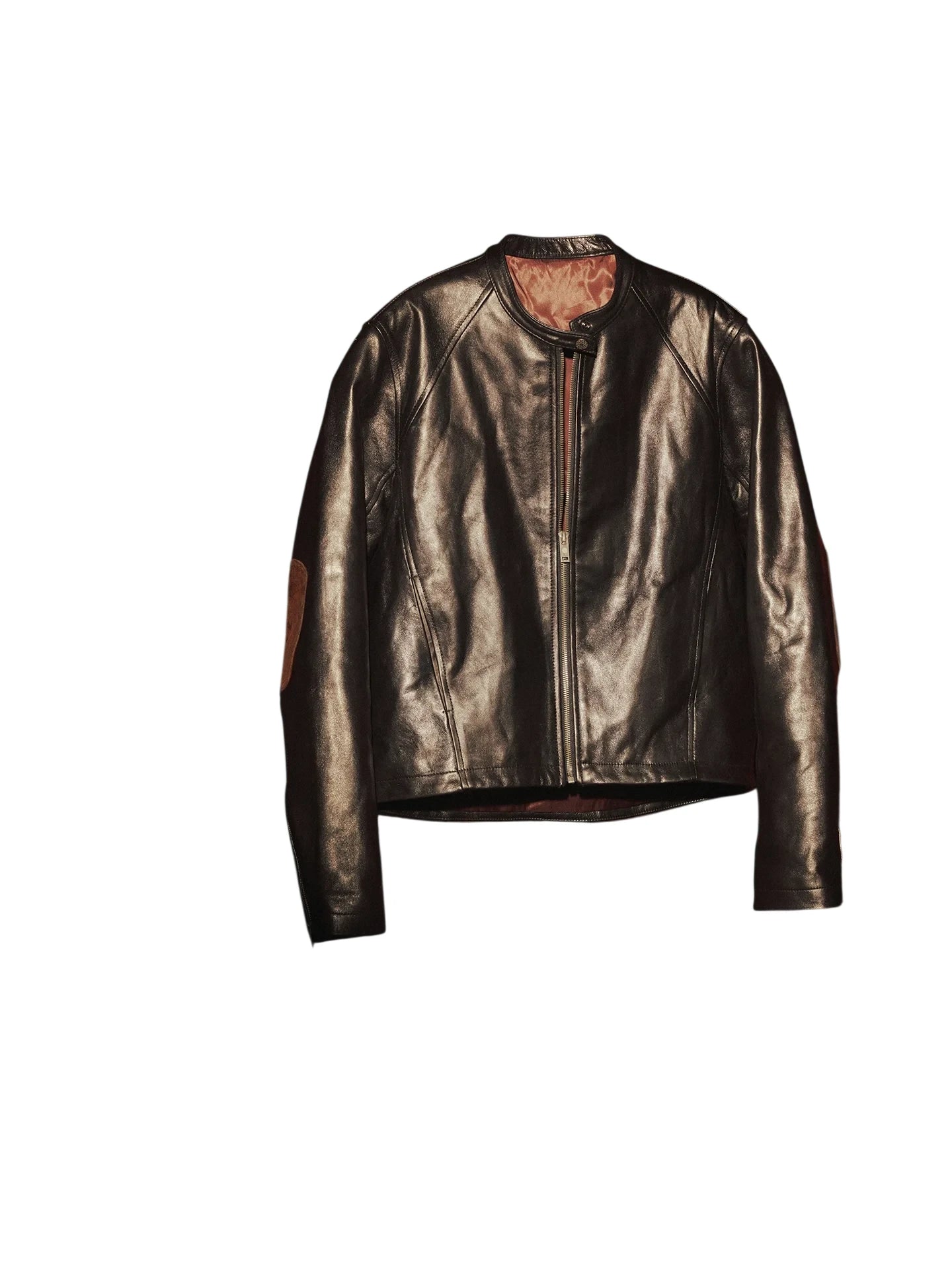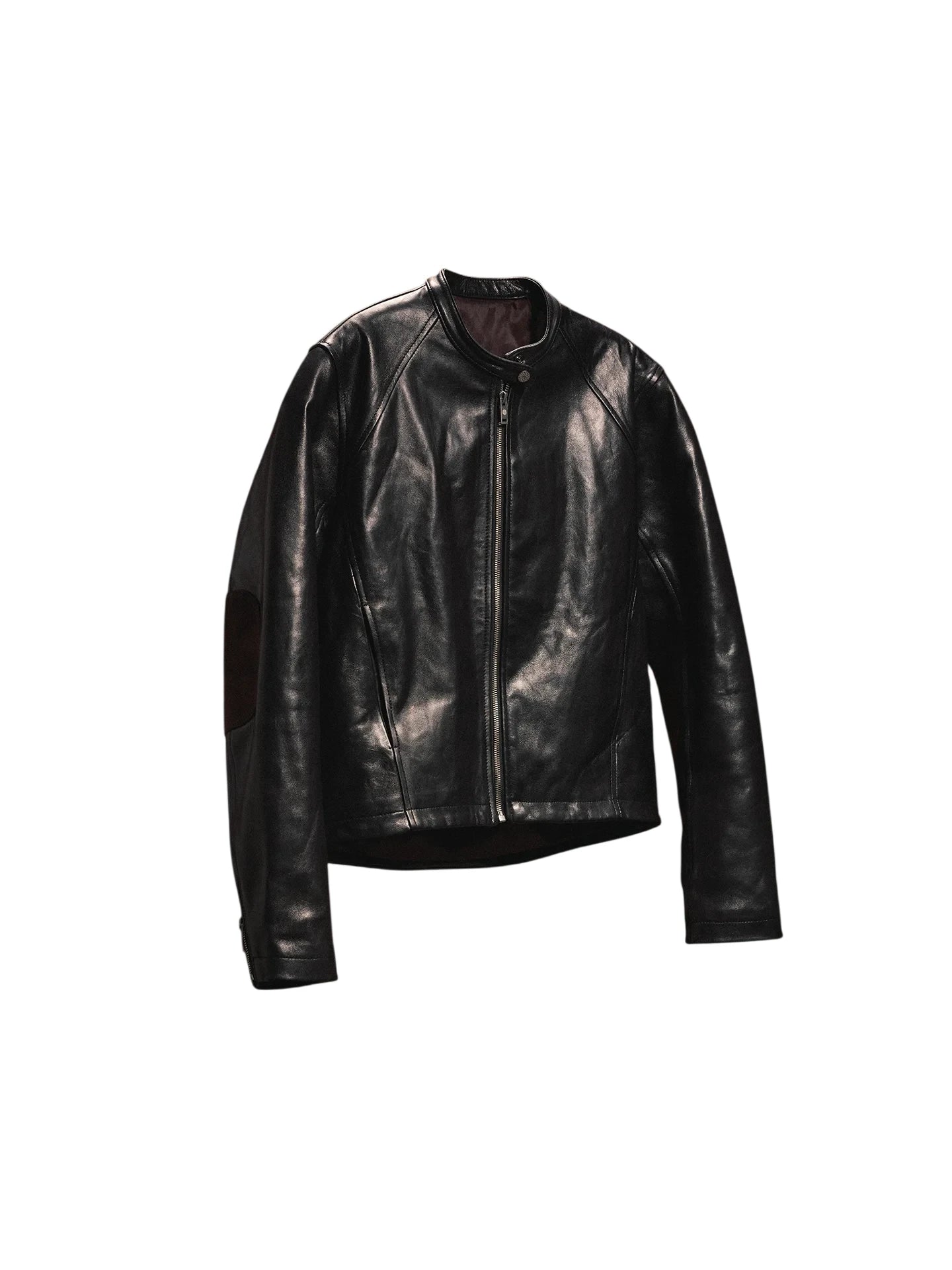 Elevate your outerwear with this men's black racing-style leather jacket, crafted from premium first-layer sheepskin with an oil wax finish. Featuring a fitted silhouette, this sleek jacket includes a front zipper closure, snap-button collar, and stylish paneling throughout. Lightly padded elbow patches offer both aesthetic appeal and added comfort. The jacket is lined in a contrasting tan color, providing a refined touch on the inside. A perfect blend of rugged durability and urban sophistication.