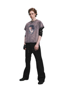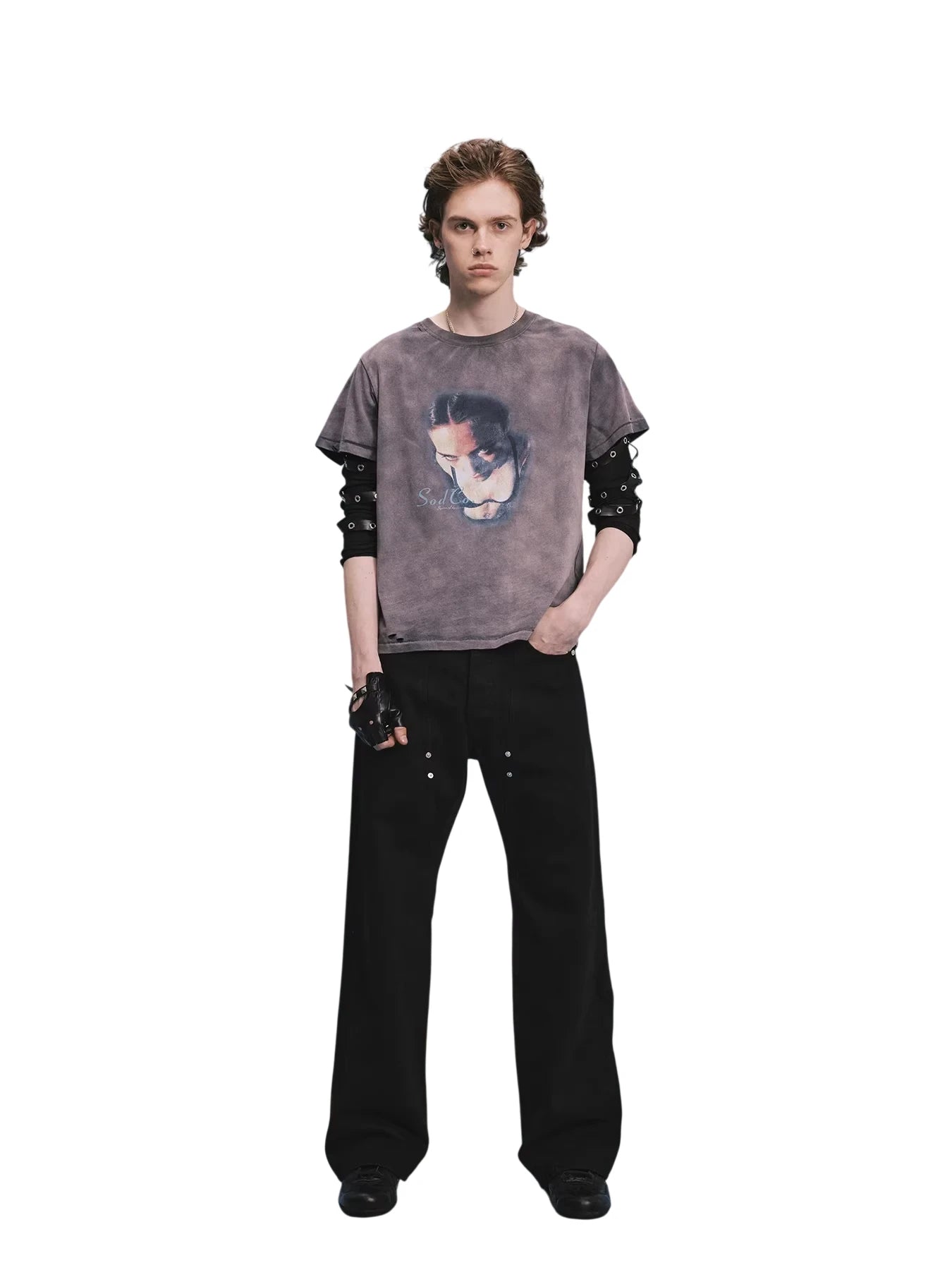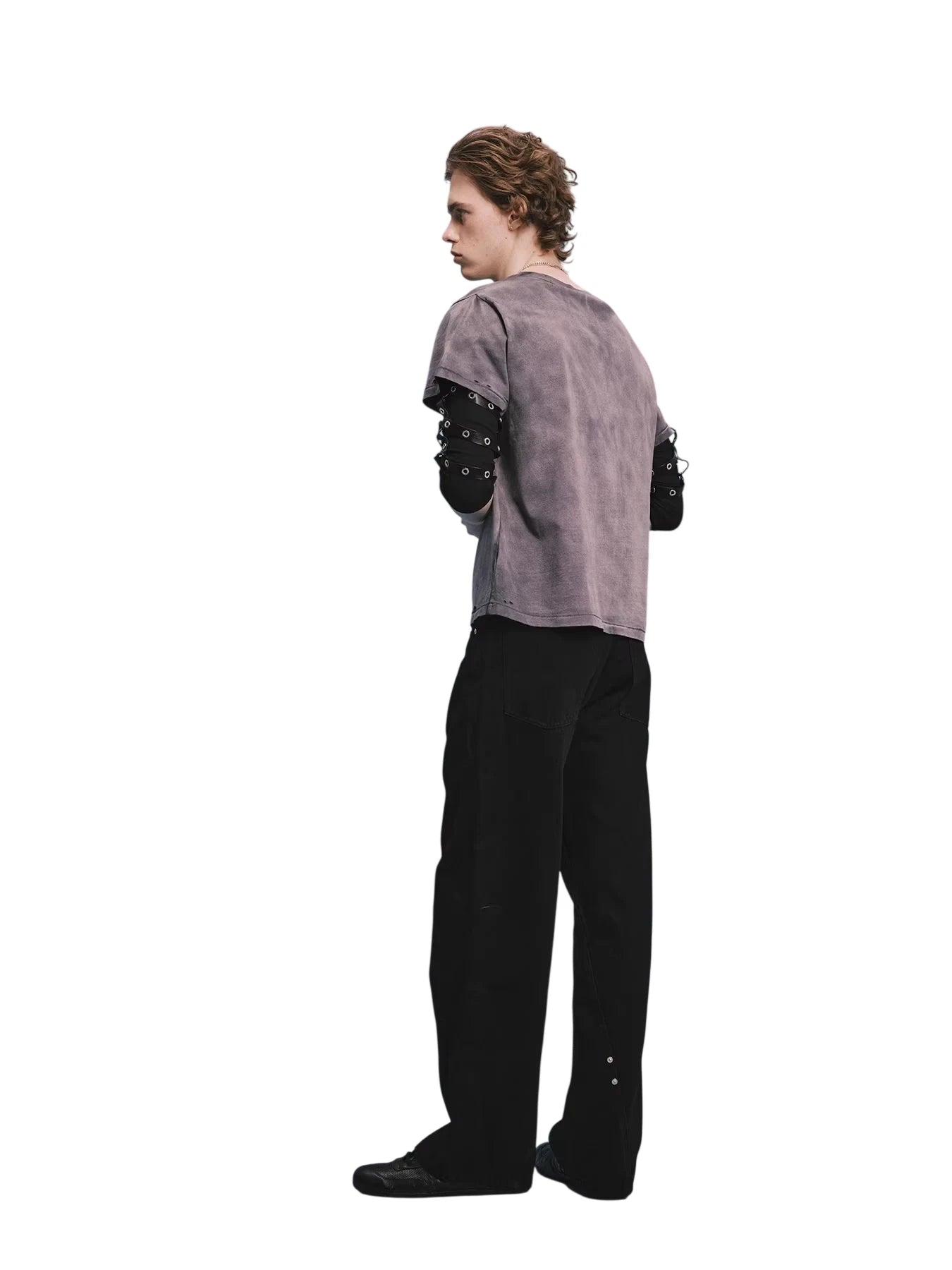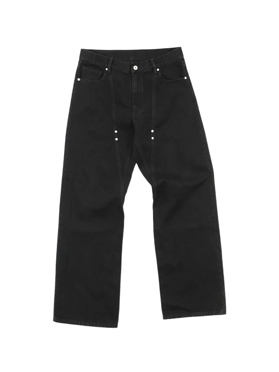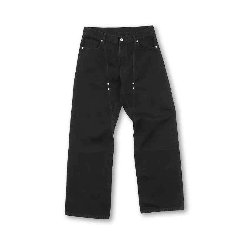 These men's black denim jeans feature a distinct wide-leg, straight-cut silhouette with twisted front seams for a modern, structured look. Accented with silver rivets along the pockets and central seams, they offer a subtle retro flair. Designed with a classic five-pocket layout and button closure, these jeans combine minimalist aesthetics with functional everyday wear. The dark wash and clean lines make them a versatile addition to any casual wardrobe.
