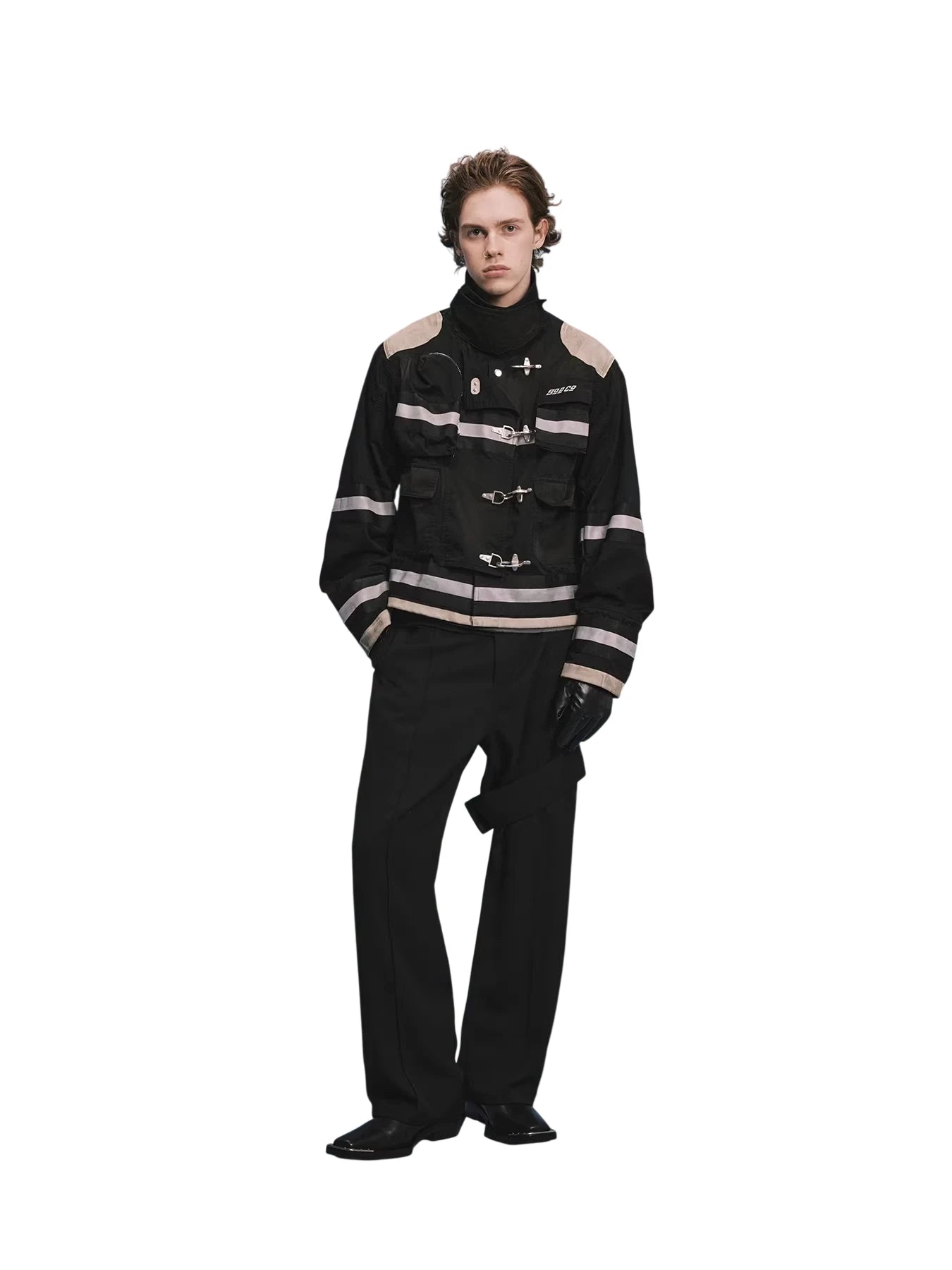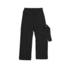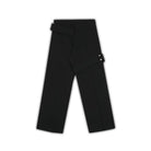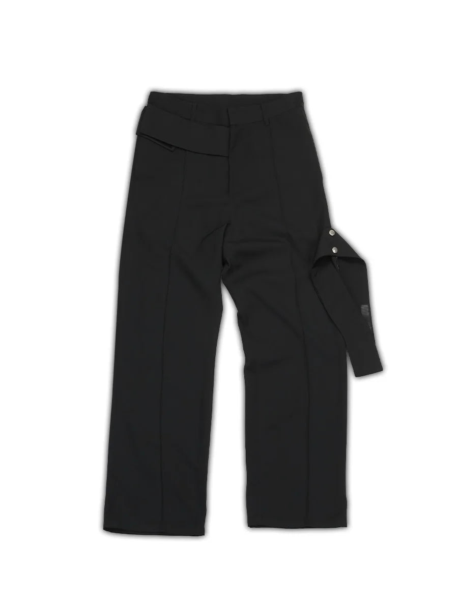 These black men's trousers feature a wide straight-leg cut and a tailored waistband for a structured fit. Designed with an extended adjustable strap and silver snap-button side detailing, they combine modern utility with minimalist design. Pressed front creases add a refined touch, while the asymmetrical flap and belt loops deliver a fashion-forward edge. Ideal for casual and elevated streetwear looks.