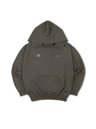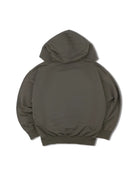 This unisex oversized hoodie features a stylish gray-green hue with a heavy washed finish and subtle distressed collar for a worn-in look. Designed with drop shoulders, a front kangaroo pocket, and ribbed cuffs and waistband, it offers a relaxed, comfortable fit. The chest includes minimalist printed graphics—abstract vertical bars and the phrase 'SECOND PRESENTS'—adding a modern touch. Crafted from a medium to heavyweight fabric, it's perfect for cooler seasons and casual wear.